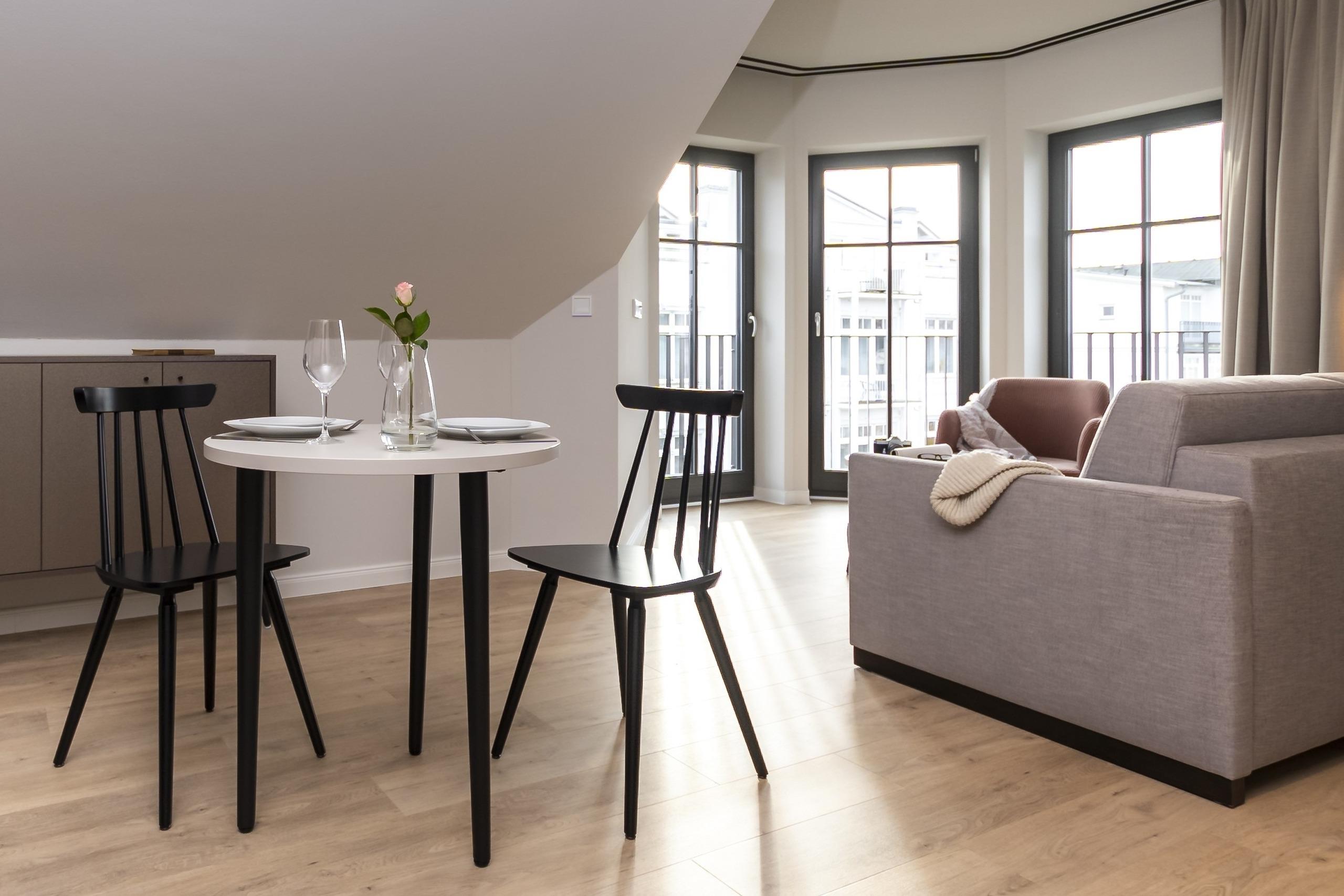 Gemütliches Dachgeschossapartment mit Balkon und seitlichem Meerblick in Binz, nahe Strand und Promenade.