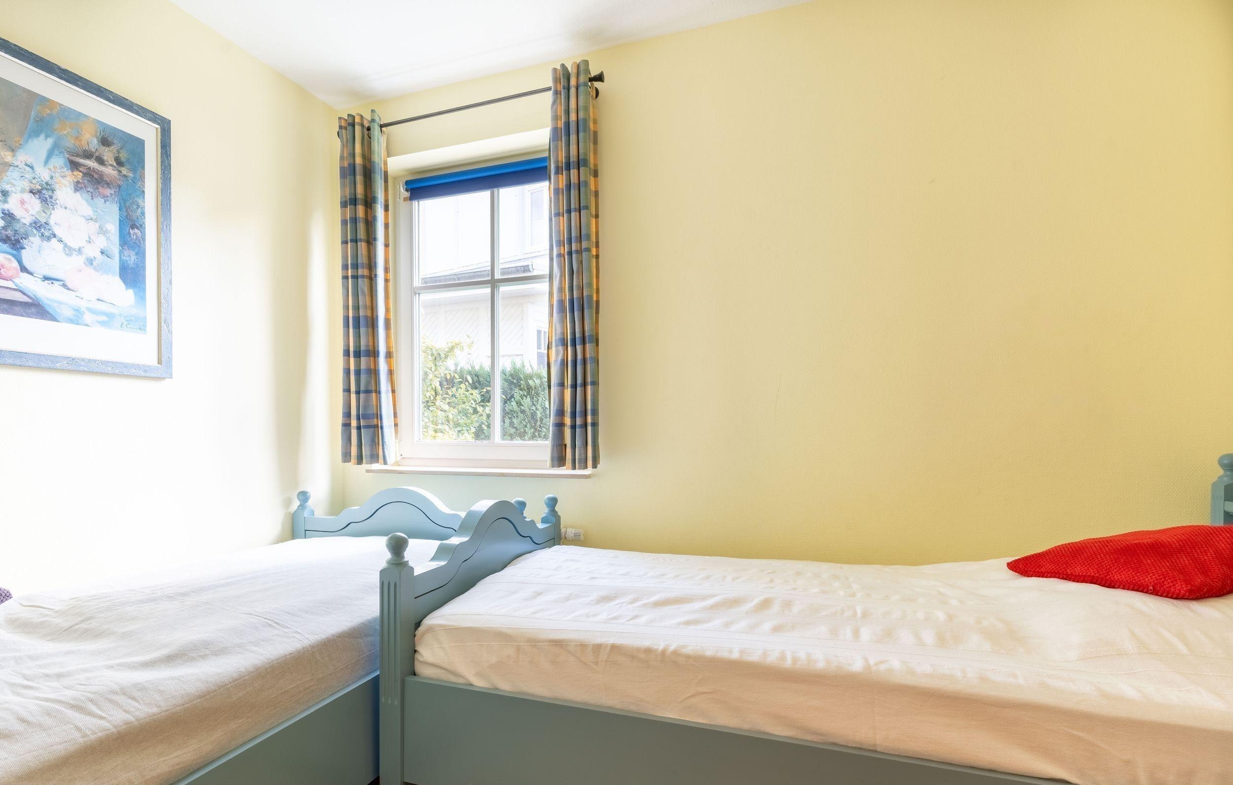 Das größere von beiden Schlafzimmern ist mit einem Doppelbett (180 x 200) ausgestattet, im kleineren Schlafzimmer befinden sich zwei Einzelbetten (100 x 200). Zur Ausstattung der Ferienwohnung gehört ebenfalls ein Babyreisbett, ein Hochstuhl sowie ein Duschhocker.