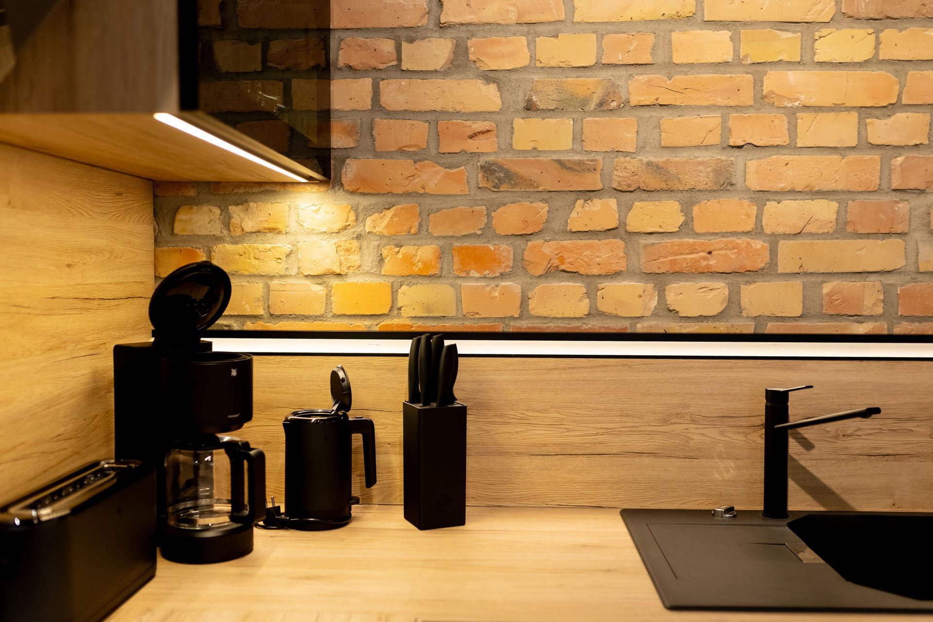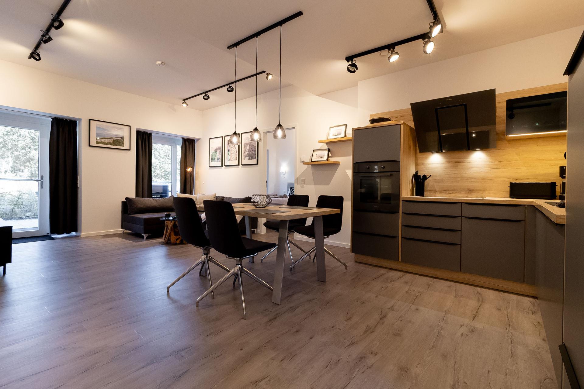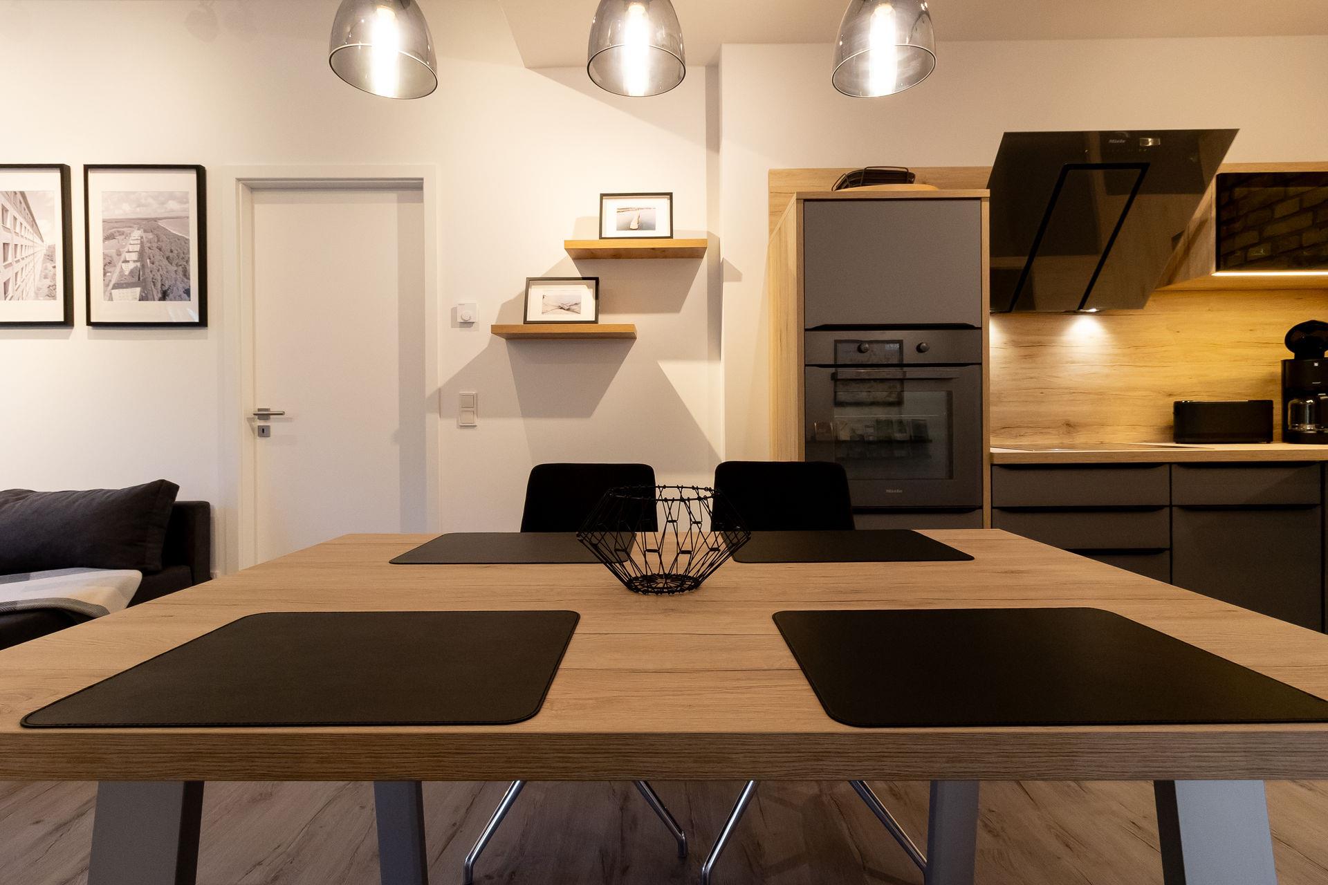 Sie betreten Loris Studio im Haus Mönchgut über einen eigenen Eingang im Erdgeschoss. Sie müssen also gar nicht mit all den anderen Urlaubern durch das Haupthaus, sondern genießen den Luxus eines separaten Eingangs. Ihre Koffer können Sie vom Parkplatz ganz ohne Schleppen gleich ganz gemütlich in Loris Studio schieben. Vor der Eingangstür befindet sich eine kleine Sitzlounge. Da die Sonne gerade Nachmittags auf der Landseite scheint, können Sie auch am Nachmittag die Sonne genießen. Über einen großzügigen Flur mit direktem Zugang zum Abstellraum und Gäste-WC gelangen Sie in den großen Wohn-und Essbereich. In der Küche erwartet Sie ein echtes Highlight: Die Steinwand ist nicht nur ein Hingucker, sondern ein Teil echter Geschichte. Es handelt sich um die Original-Steine aus der Ruine. Der offene Wohn- und Essbereich ermöglicht Ihnen ein großes Raumgefühl und ein wunderbares Miteinander. Die Küche ist sehr hochwertig und modern ausgestattet und verfügt über einen Herd mit stylisher Dunstabzugshaube, eine Spülmaschine, Waschbecken, Backofen, Mikrowelle, Kühlschrank mit Gefrierfach und allen weiteren wichtigen Dingen wie Kaffeevollautomat, Filterkaffeemaschine, Wasserkocher, Toaster etc.