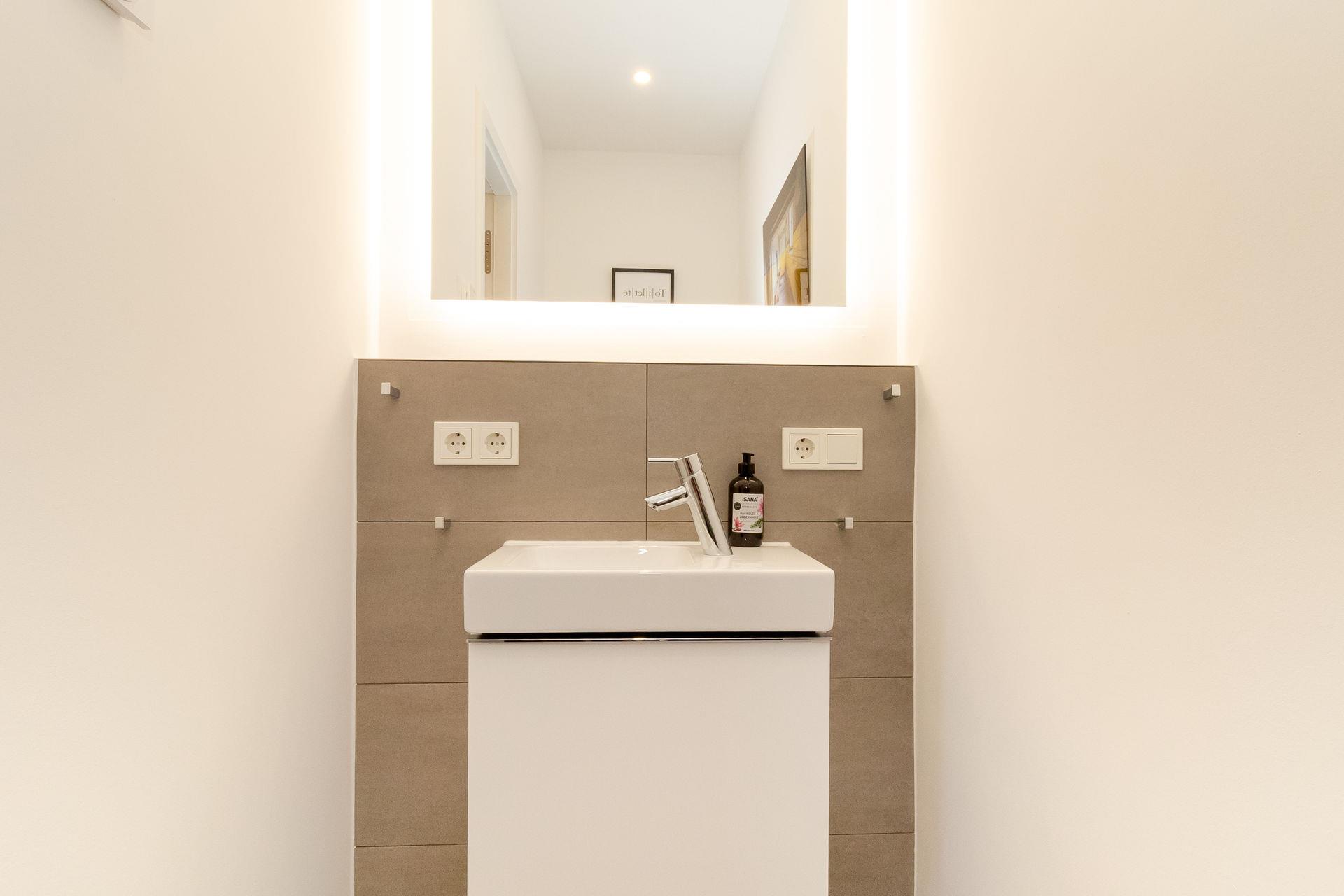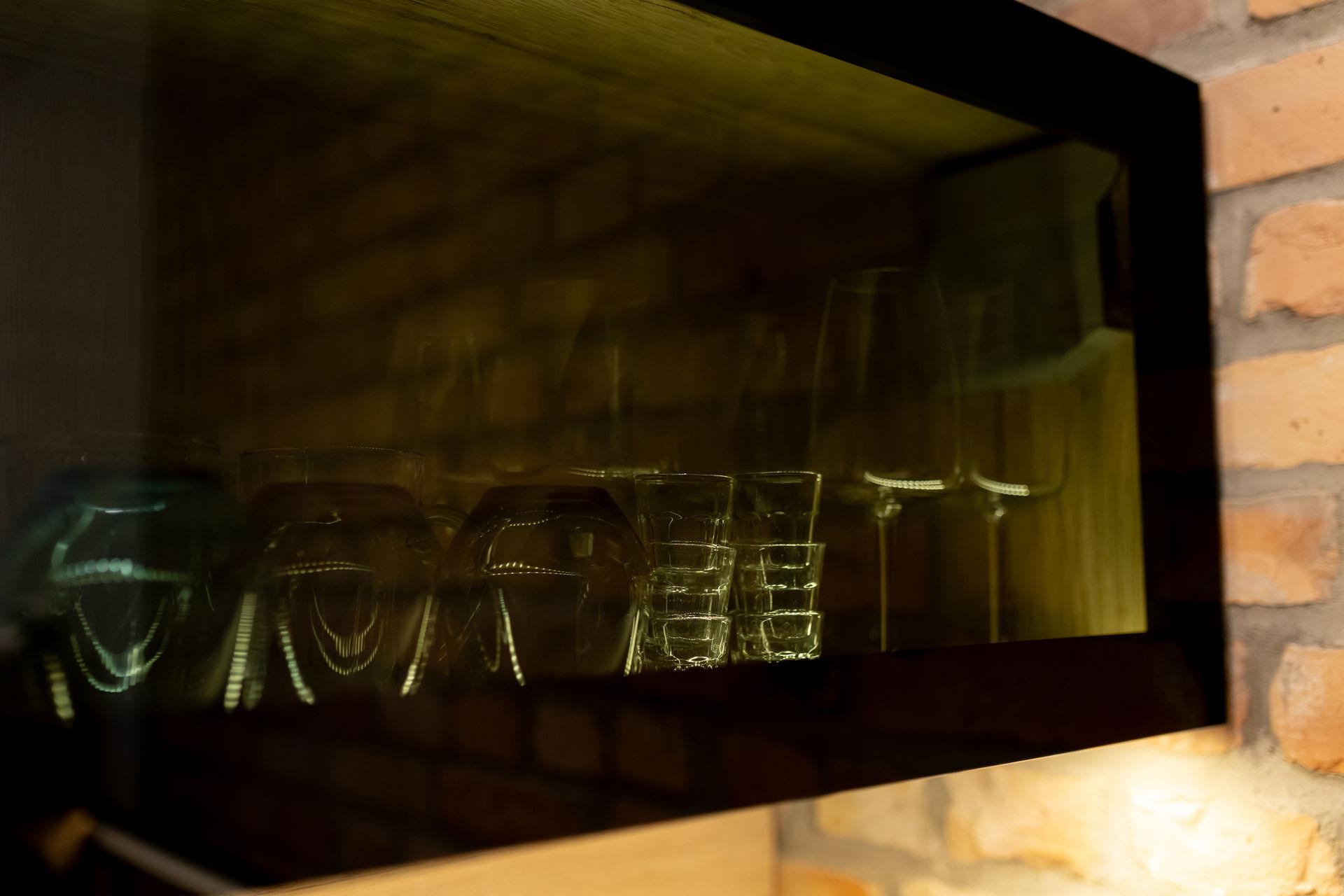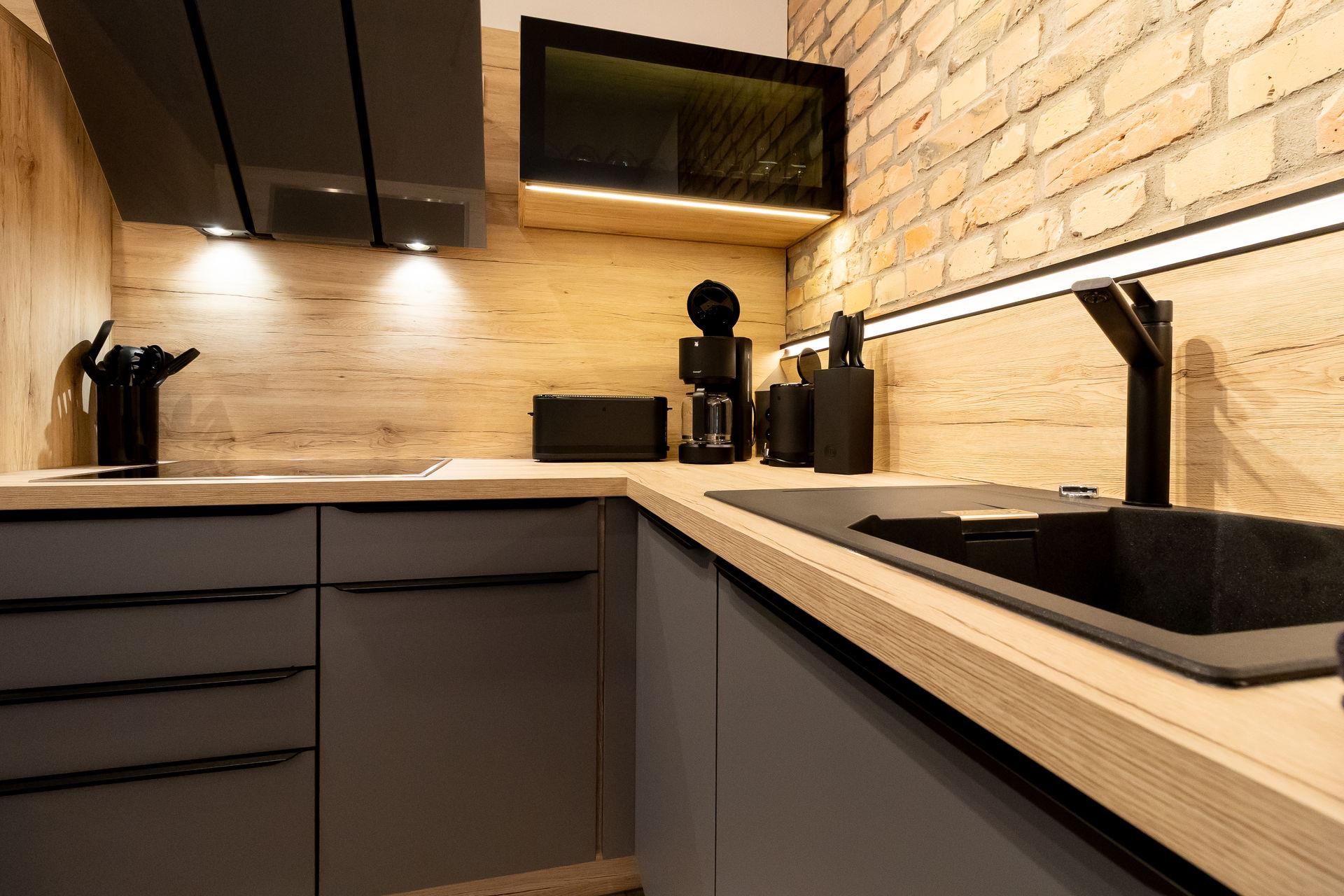 Sie betreten Loris Studio im Haus Mönchgut über einen eigenen Eingang im Erdgeschoss. Sie müssen also gar nicht mit all den anderen Urlaubern durch das Haupthaus, sondern genießen den Luxus eines separaten Eingangs. Ihre Koffer können Sie vom Parkplatz ganz ohne Schleppen gleich ganz gemütlich in Loris Studio schieben. Vor der Eingangstür befindet sich eine kleine Sitzlounge. Da die Sonne gerade Nachmittags auf der Landseite scheint, können Sie auch am Nachmittag die Sonne genießen. Über einen großzügigen Flur mit direktem Zugang zum Abstellraum und Gäste-WC gelangen Sie in den großen Wohn-und Essbereich. In der Küche erwartet Sie ein echtes Highlight: Die Steinwand ist nicht nur ein Hingucker, sondern ein Teil echter Geschichte. Es handelt sich um die Original-Steine aus der Ruine. Der offene Wohn- und Essbereich ermöglicht Ihnen ein großes Raumgefühl und ein wunderbares Miteinander. Die Küche ist sehr hochwertig und modern ausgestattet und verfügt über einen Herd mit stylisher Dunstabzugshaube, eine Spülmaschine, Waschbecken, Backofen, Mikrowelle, Kühlschrank mit Gefrierfach und allen weiteren wichtigen Dingen wie Kaffeevollautomat, Filterkaffeemaschine, Wasserkocher, Toaster etc.