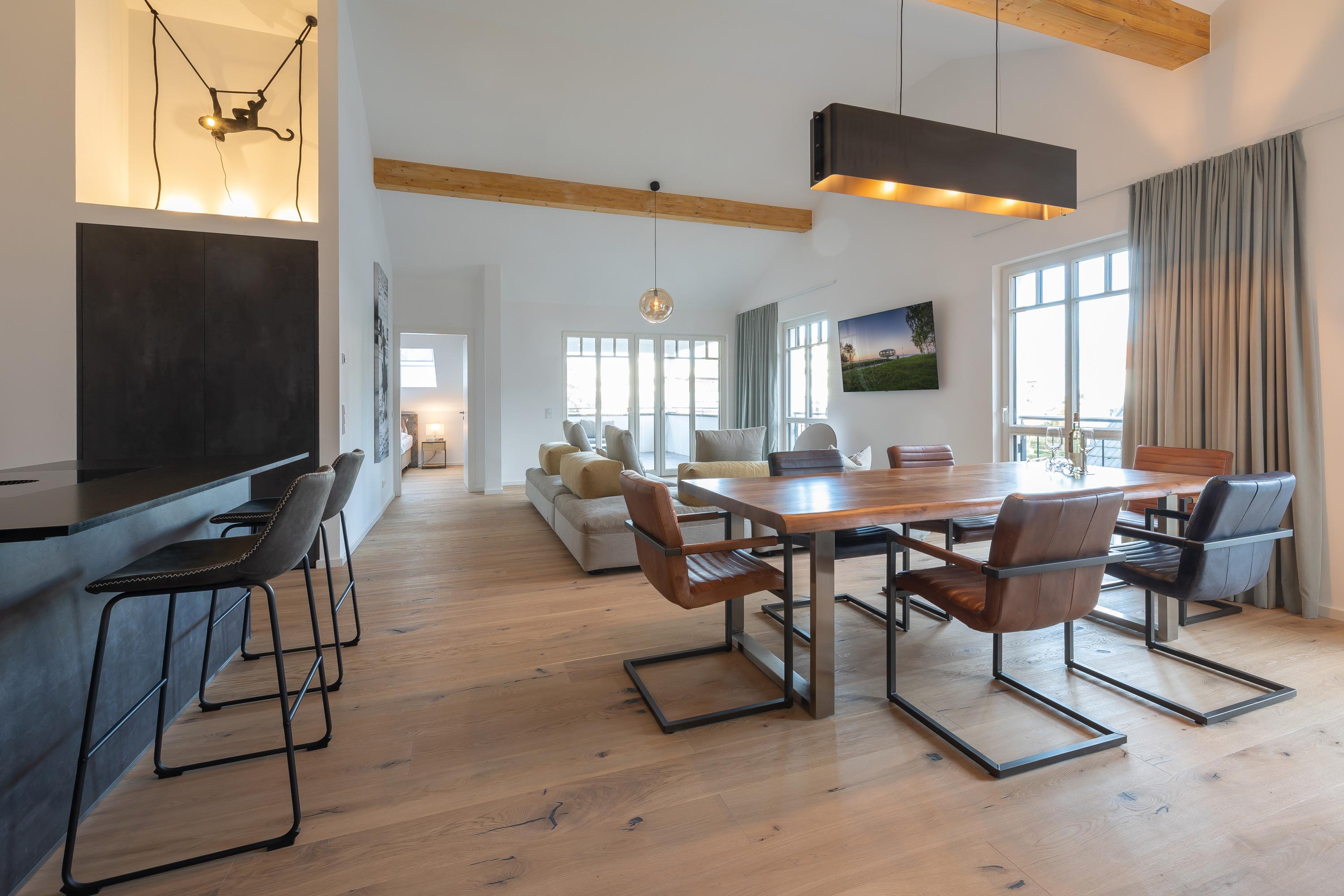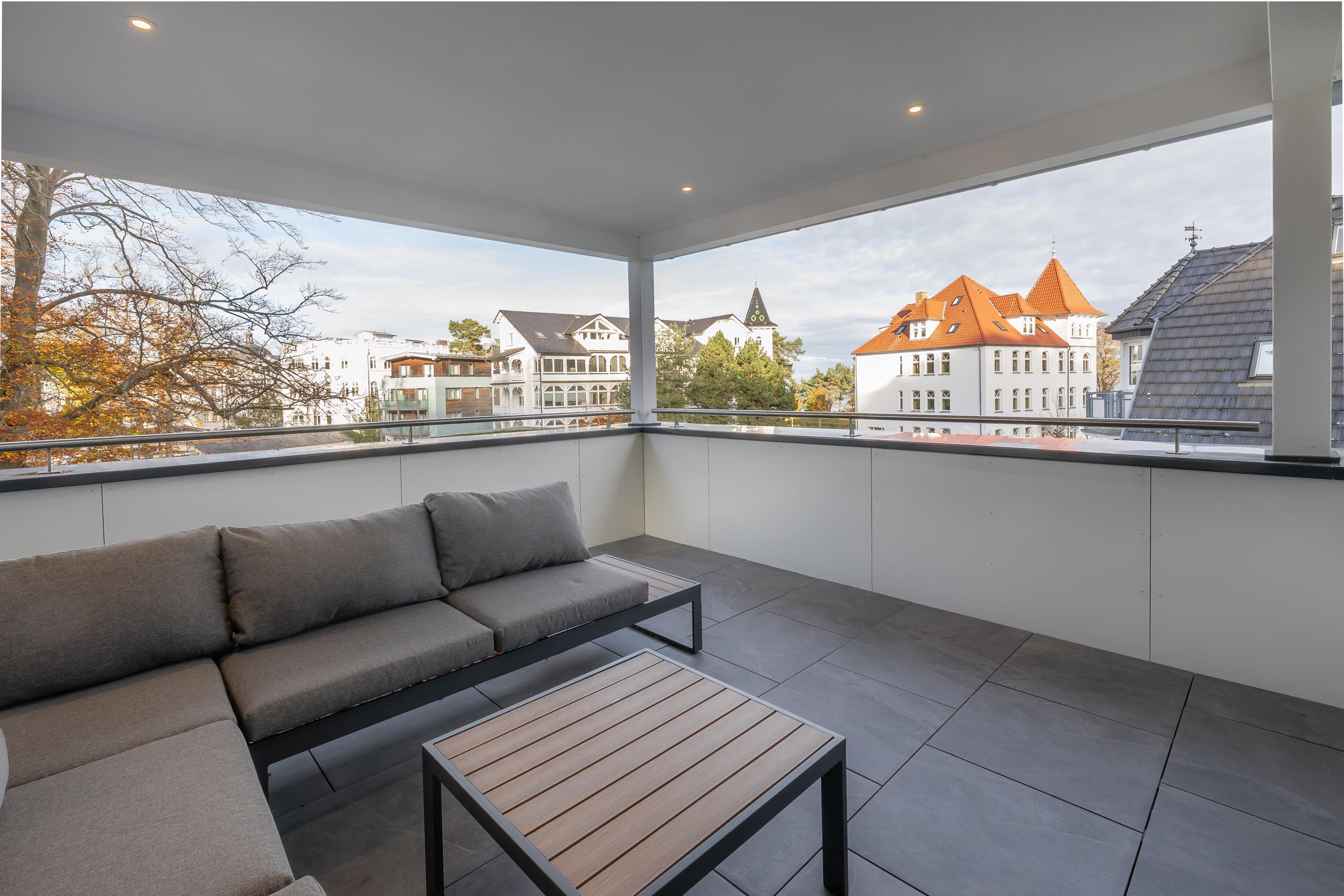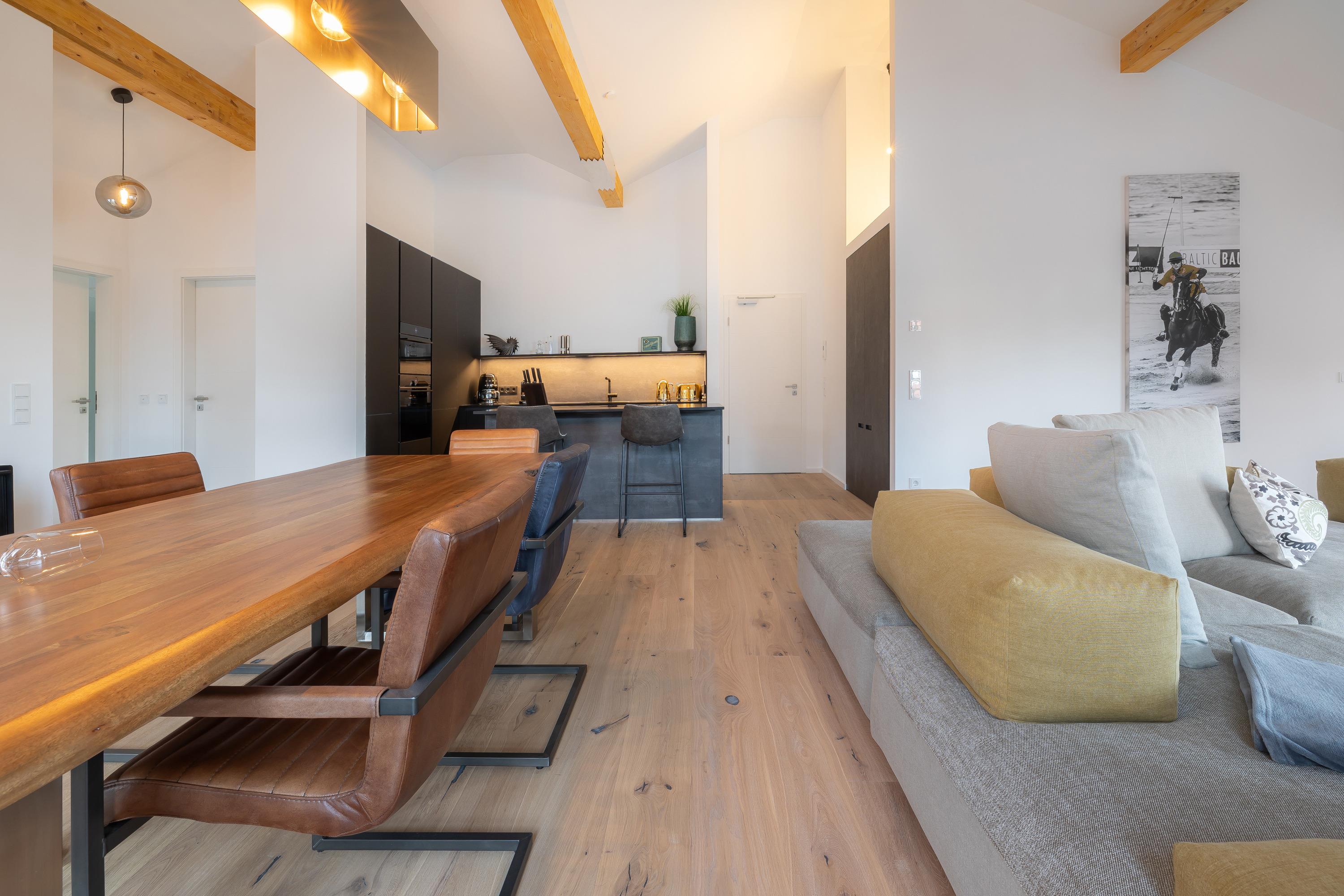 Sehr geehrte Gäste, wir freuen uns Ihnen dieses 2023 neu errichtete Penthouse anbieten zu können. Dass dies ein wirklich luxuriöses Urlaubsdomizil inmitten des Ostseebad Binz ist, wird einem schon beim befahren des Gebäudes bewusst. Ein elektrischer Autolift bringt Sie und Ihr Fahrzeug in eine unter dem Haus gelegene Tiefgarage. Aus dieser erreichen Sie bequem per Aufzug dieses tolle Domizil im Dachgeschoss der Villa Beatrice. Ebenso befindet sich auf der Tiefgaragenebene ein Fahrradraum, in welchem Sie mitgebrachte Räder unterstellen dürfen. In der Wohnung angekommen betreten Sie diese hochwertig eingerichtete Wohnung im offenen Wohn-, Essbereich. Dieser ist offen und überaus hell gestaltet und bietet direkten Zugang zur tollen Dachterrasse/Balkon. Nur wenige Meter vom feinsandigen Ostseestrand können Sie in der Wohnungseigenen Sauna entspannte Stunden nach dem Strand genießen oder gemeinsam mit ihren liebsten in der hochwertigen Einbauküche kochen. Und das alles an einem der mondänsten Hotspots der Insel Rügen und in absoluter Ruhe. Neben dem tollen Wohnbereich mit Smart-TV inkl Multimediapaket erwarten Sie 2 Schlafzimmer sowie 2 Badezimmer. Ebenso steht Ihnen als Highlight ein Hauseigener Saunabereich zur Verfügung. Dieser verfügt neben einer Münzsauna auch über einen Ruheraum inkl Duschen, Toiletten und einem Außenbereich zum entspannen. Die Lage dieser Immobilie verspricht pure Erholung ohne dabei auf Annehmlichkeiten wie eine Vielzahl umliegender Restaurants und Einkaufsmöglichkeiten verzichten zu müssen.