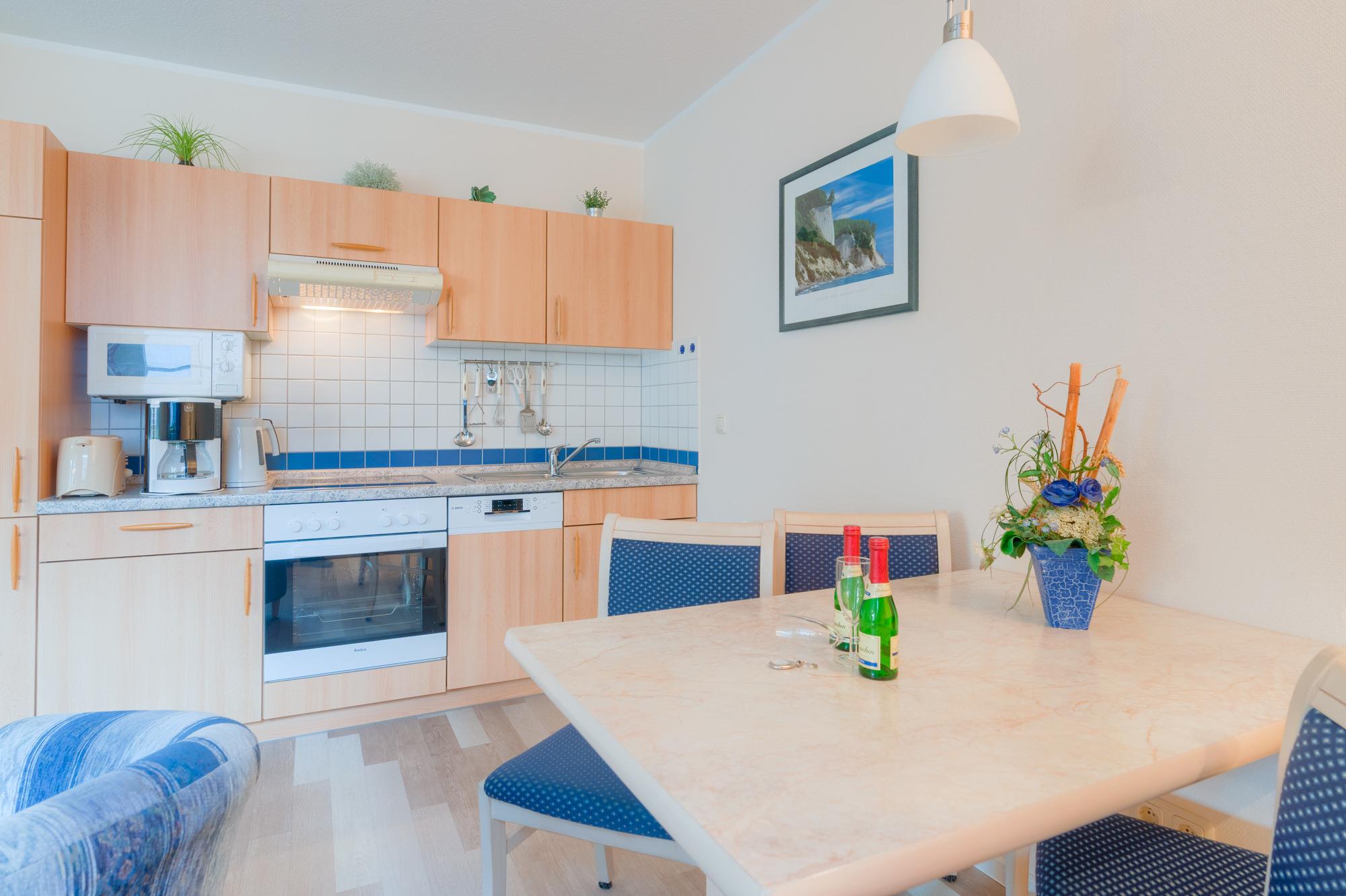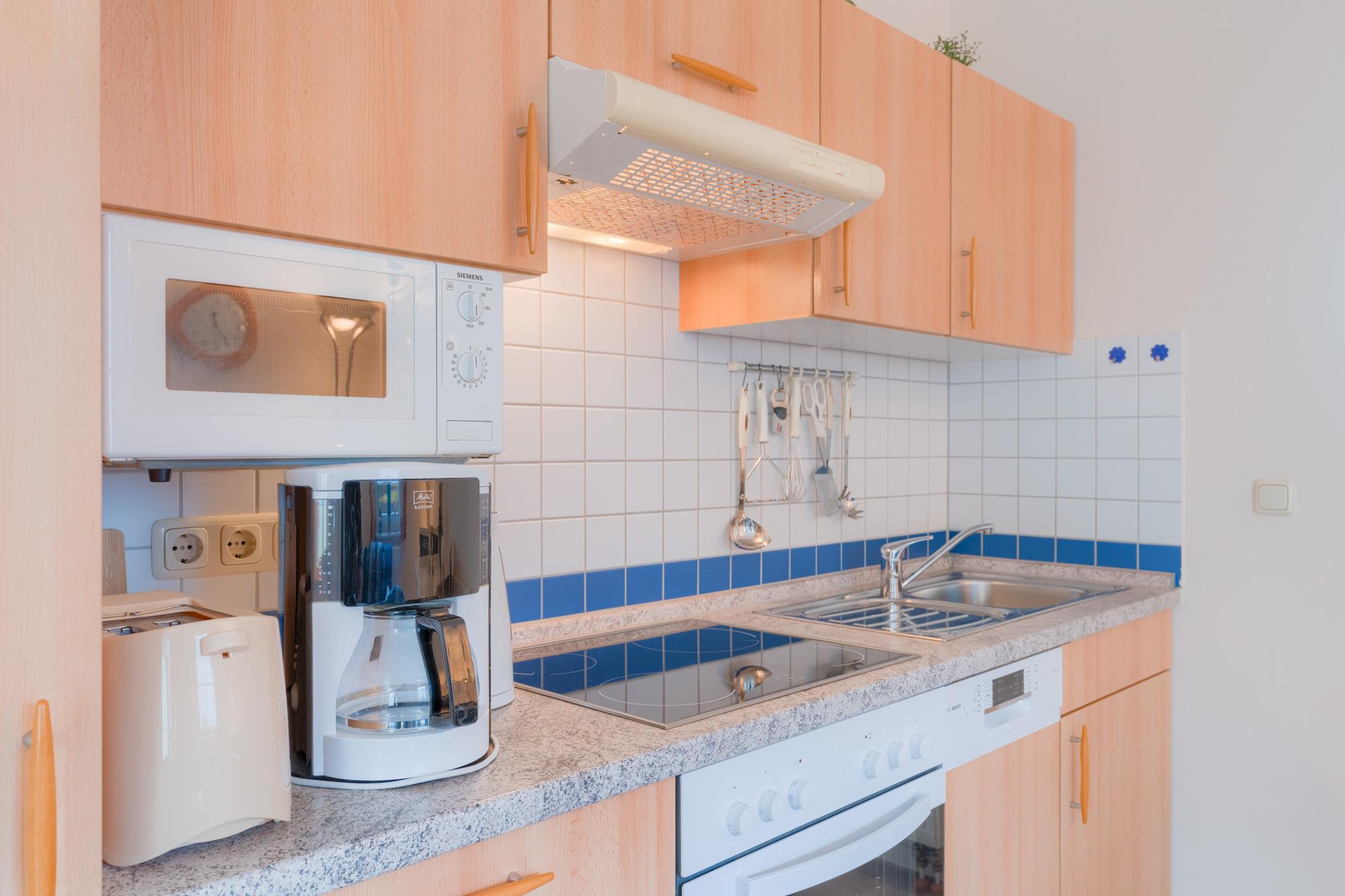 Die hier angrenzende Küchenzeile ist mit einem Kühlschrank mit Gefrierfach, einem Geschirrspüler, einem Backofen mit Cerankochfeld und einer Mikrowelle ausgestattet. Eine Kaffeemaschine, ein Toaster und ein Wasserkocher stehen Ihnen hier selbstverständlich zur Verfügung.