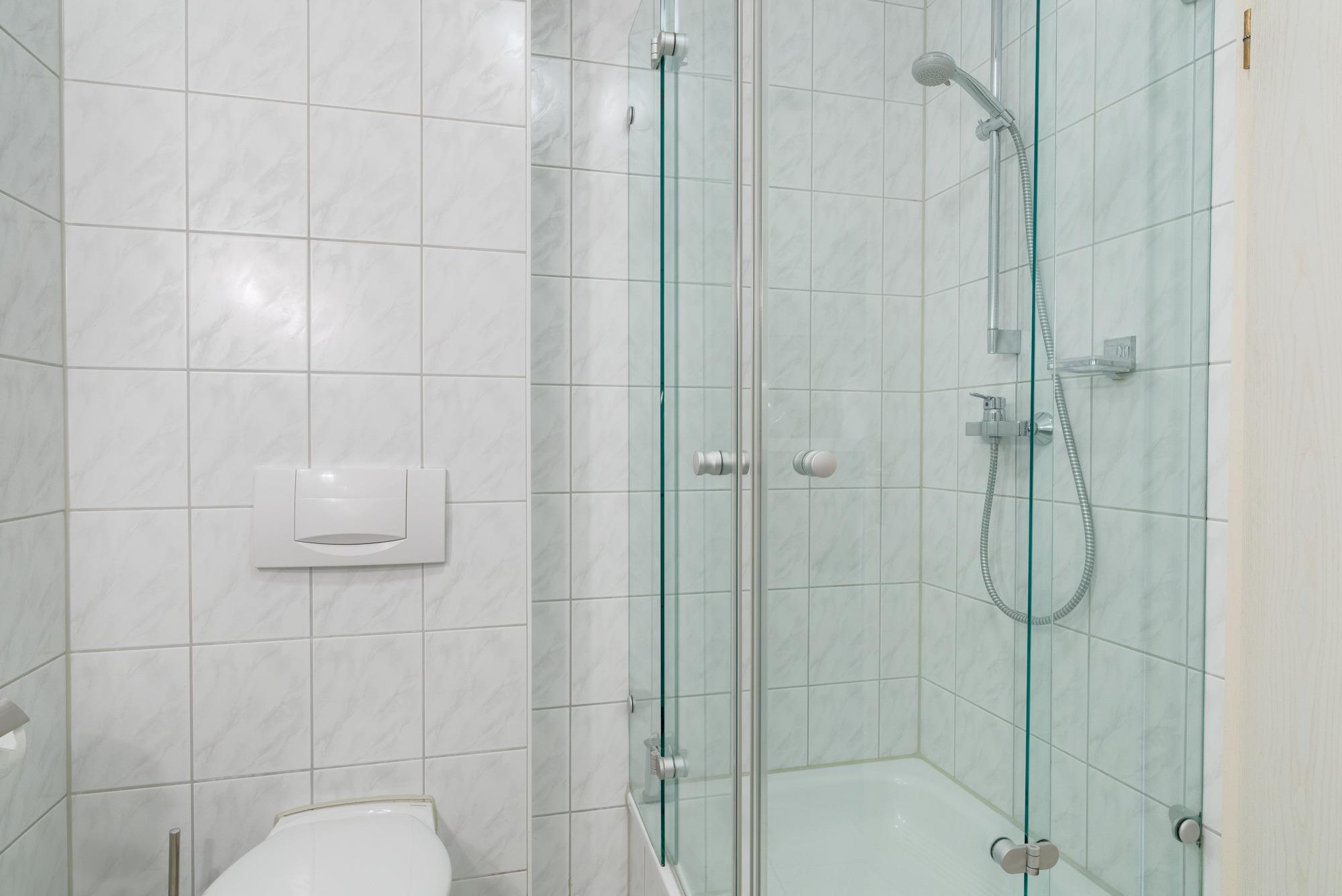 Das Badezimmer ist mit einer Dusche, WC und einem Handtuchheizkörper ausgestattet. In den Schränken haben Sie genügend Stauraum für Ihre Wasch- und Kosmetikutensilien.