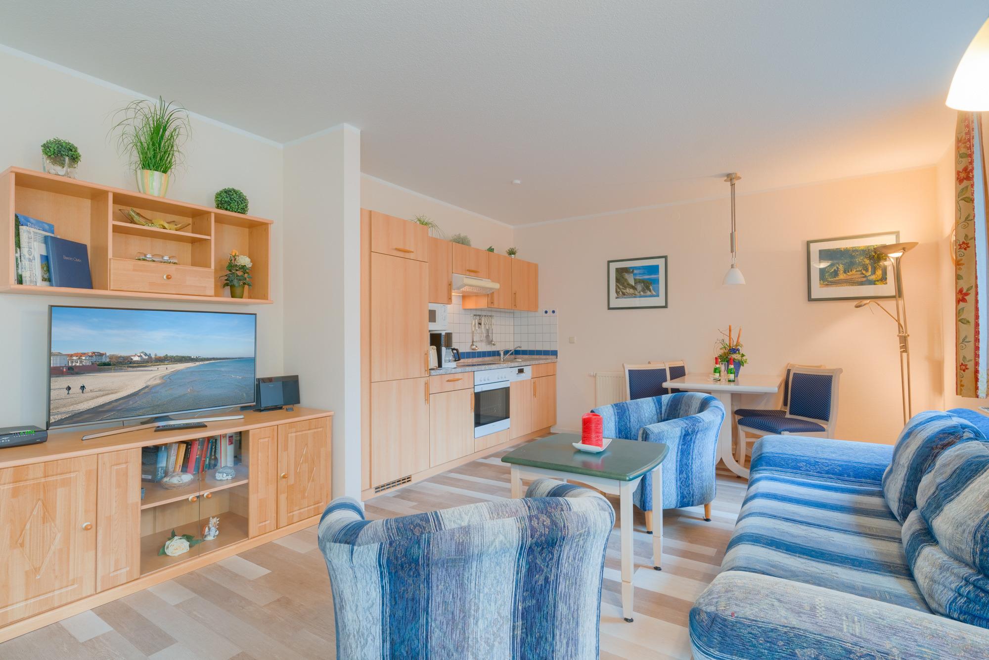 Im großzügigen Wohnbereich laden bequeme Polstergarnituren und ein Flachbildfernseher zu geselligen Abenden ein. Durch die ausklappbare Couch ist eine Belegung der Ferienwohnung mit 4 Personen möglich. Der Essbereich ist im Wohnbereich integriert und ein Tisch mit 4 Stühlen bietet hier ausreichend Platz zum gemeinsamen Essen.
