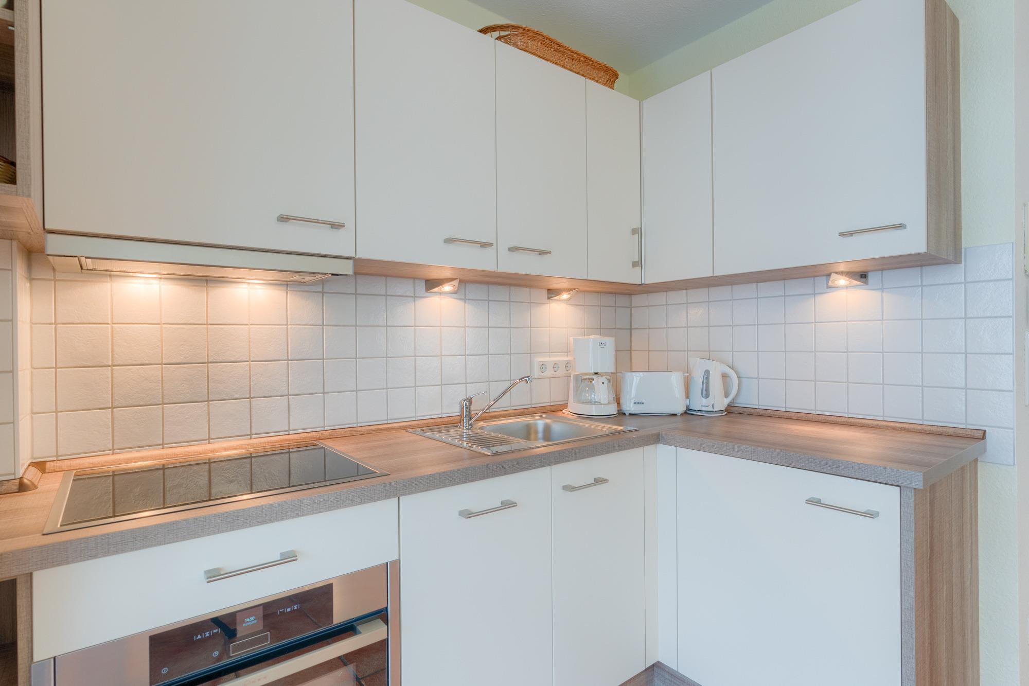 Die hier angrenzende Küchenzeile ist mit einem Kühlschrank mit Gefrierfach, einem Geschirrspüler und einem Kombigerät aus Backofen, Grill und Mikrowelle mit Cerankochfeld ausgestattet. Eine Kaffeemaschine, ein Toaster, ein Eierkocher und ein Wasserkocher stehen Ihnen hier selbstverständlich zur Verfügung.