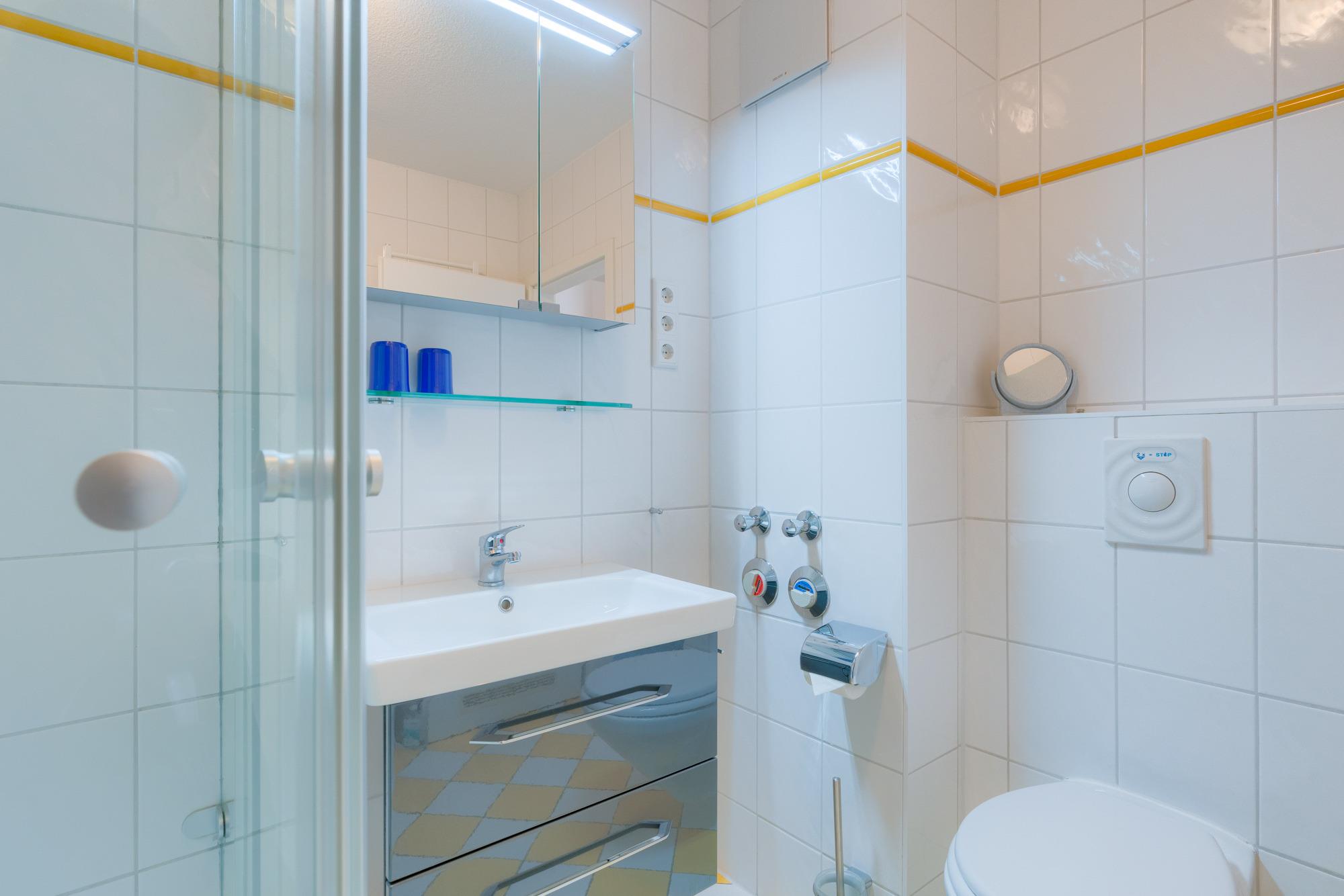 Das Badezimmer ist mit einer Dusche, WC und einem Handtuchheizkörper ausgestattet. In den Schränken haben Sie genügend Stauraum für Ihre Wasch- und Kosmetikutensilien.