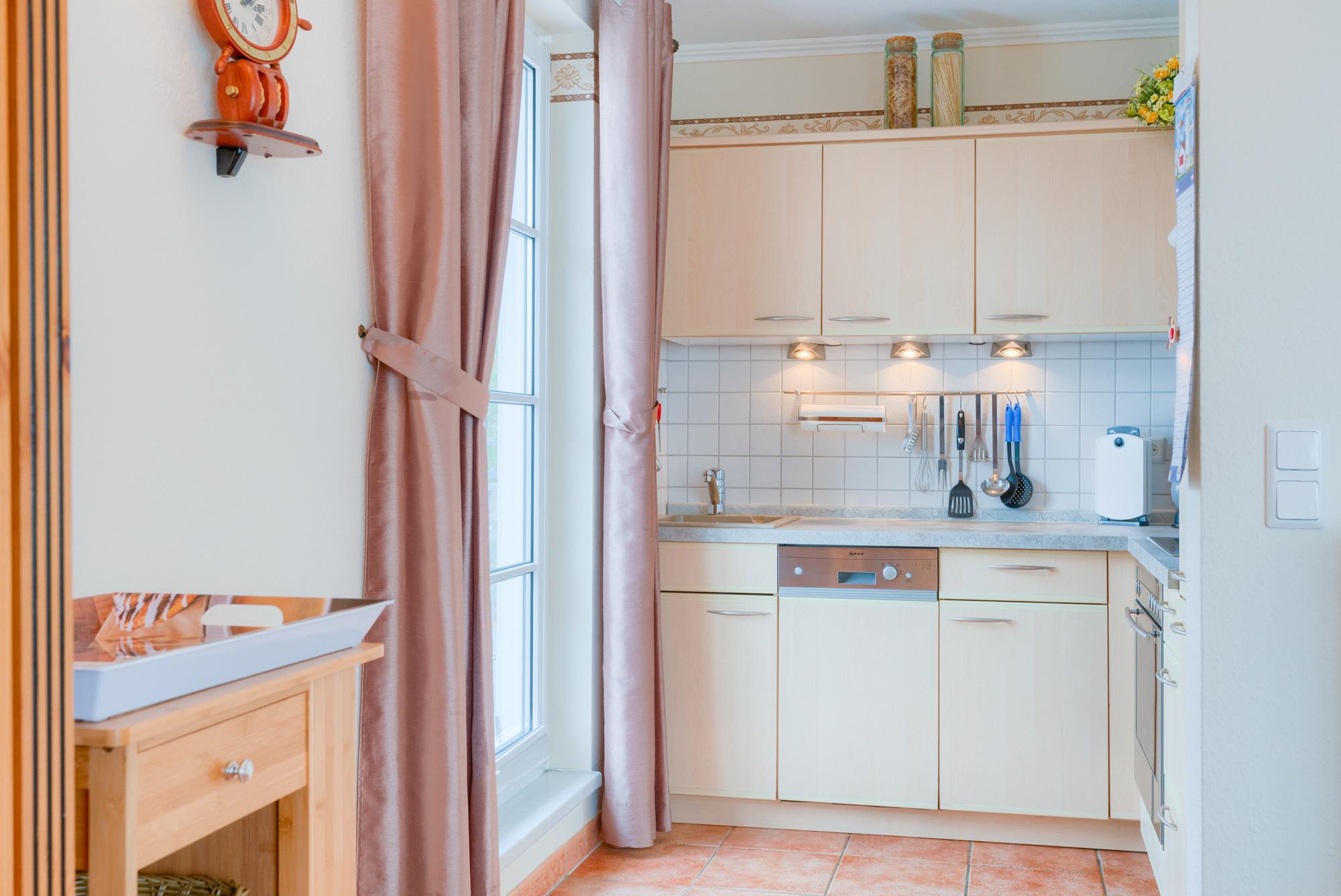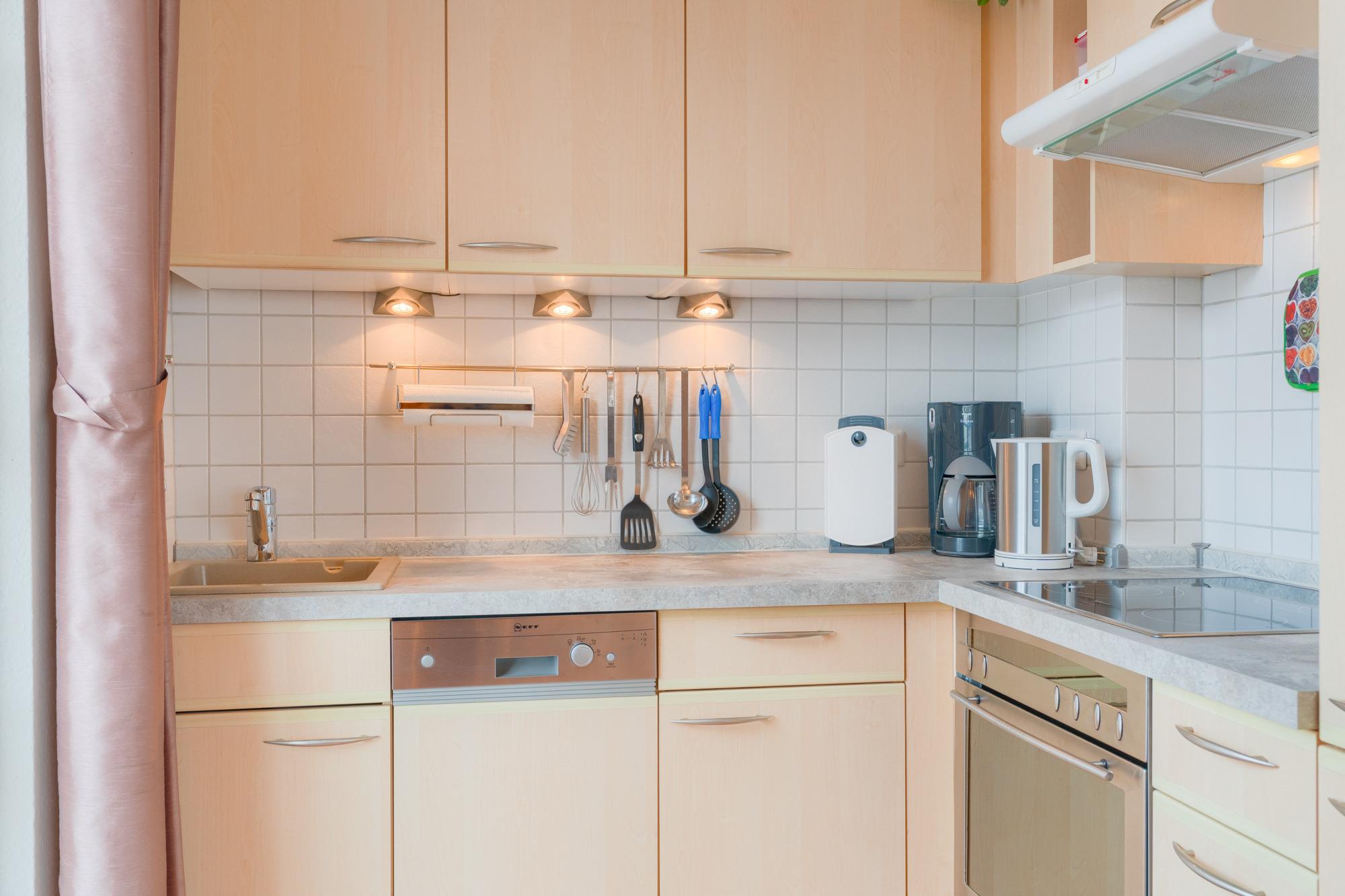 Die angrenzende Küchenzeile ist mit Kühlschrank (Gefrierfach), Geschirrspüler, Backofen, Cerankochfeld als auch diversen Kleingeräten wie Kaffeemaschine, Wasserkocher, Toaster, Eierkocher, Quirl, Passierstab sowie ausreichend vielen Kochtöpfen und hübschem Geschirr/Besteck komplett ausgestattet.