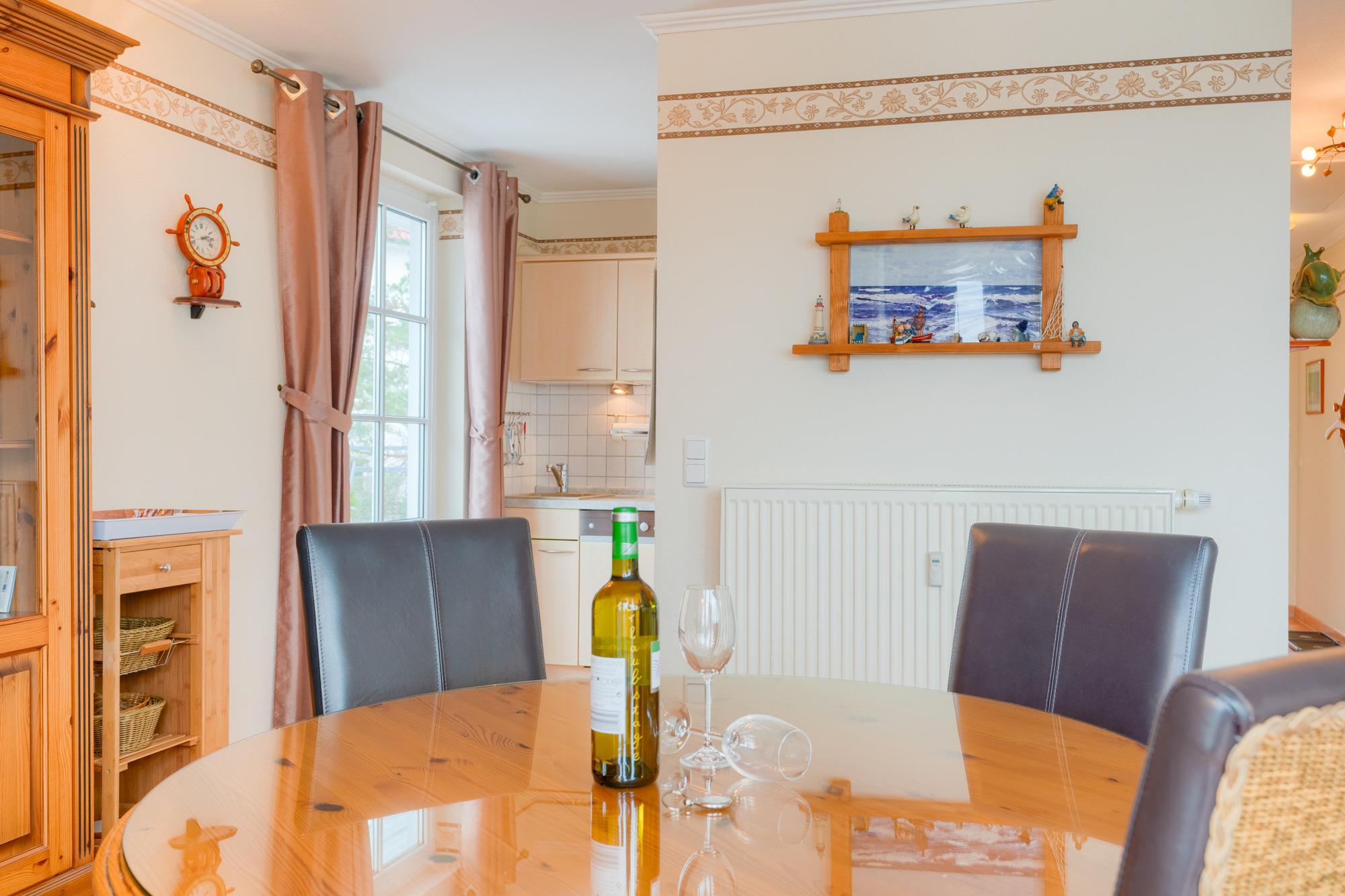 Der Essbereich mit seinem großen runden Tisch und 4 Stühlen lädt zum gemeinsamen Essen ein.