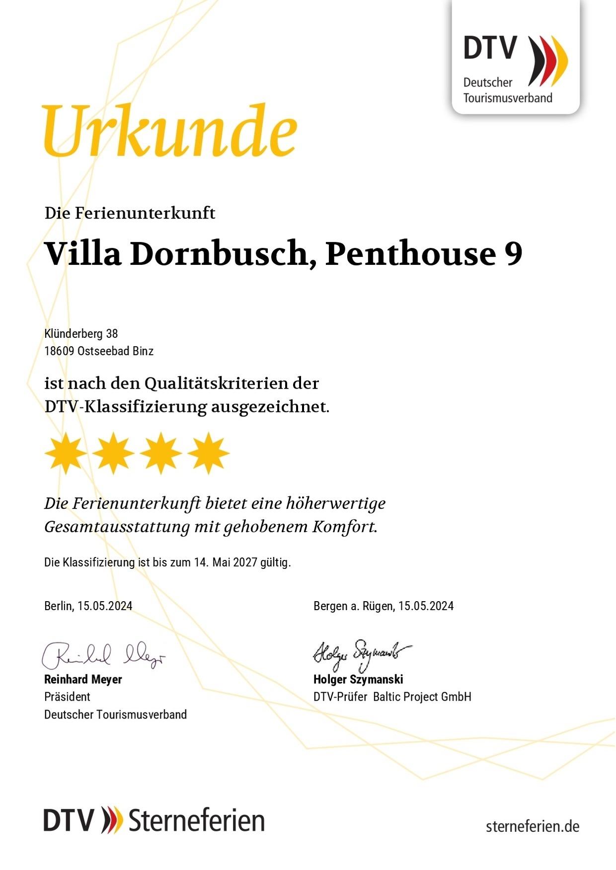 "Über den Dächern von Binz" liegt das 74 m² große, mit 4 DTV-Sternen klassifizierte Penthouse 9 in der 2. Etage der Villa Dornbusch. Es bietet mit 3 Zimmern und seiner 40 m² umlaufenden Dachterrasse großzügig Platz für max. 4 Personen.