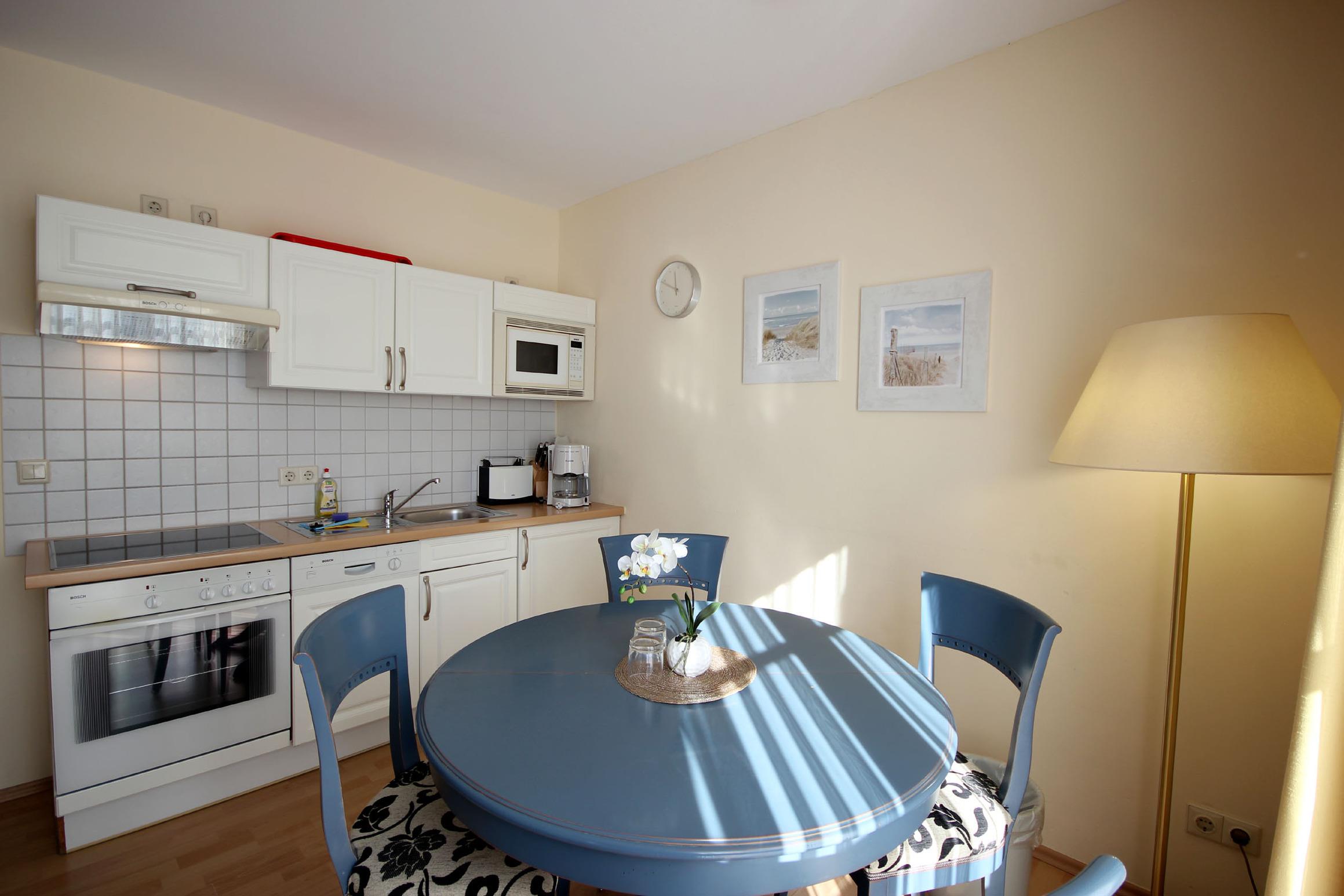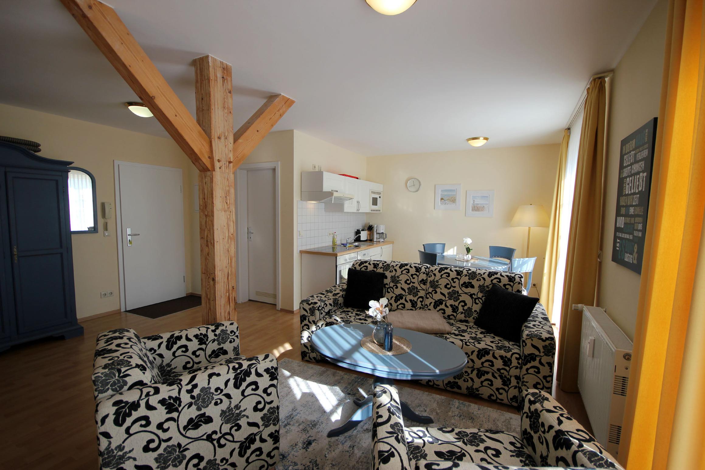 Ihre gemütliche Maisonettewohnung 26RB10 hat eine Größe von ca. 66 qm und ist für bis zu 4 Personen eingerichtet. Die Nichtraucherwohnung befindet sich im 2. und 3. Obergeschoss des Hauses und verfügt über einen Südbalkon. Im 2. Obergeschoss befindet sich der gemütliche Wohnraum mit angrenzender Wohnküche, dem Essbereich sowie das separate Duschbad. Im Wohnbereich gibt es eine schöne Sitzecke mit Sesseln, ein Flachbildfernseher sowie einen kostenfreien WLAN-Zugang. Die Küchenzeile ist ausgestattet mit Geschirrspüler, Backofen, Ceranfeld, Kühlschrank, Mikrowelle, Kaffeemaschine, Wasserkocher und Toaster. Das Bad verfügt über eine Dusche, einen Waschtisch und WC. Über die Wendeltreppe gelangen Sie in das 3. Obergeschoss direkt in das geräumige Schlafzimmer. Hier erwartet Sie ein Doppelbett und zusätzliche Sitzmöglichkeiten. Haustiere sind herzlich willkommen. Ein PKW-Stellplatz steht Ihnen auf dem Parkplatz „Zentrum“ (ca. 400m vom Objekt entfernt) zur Verfügung.