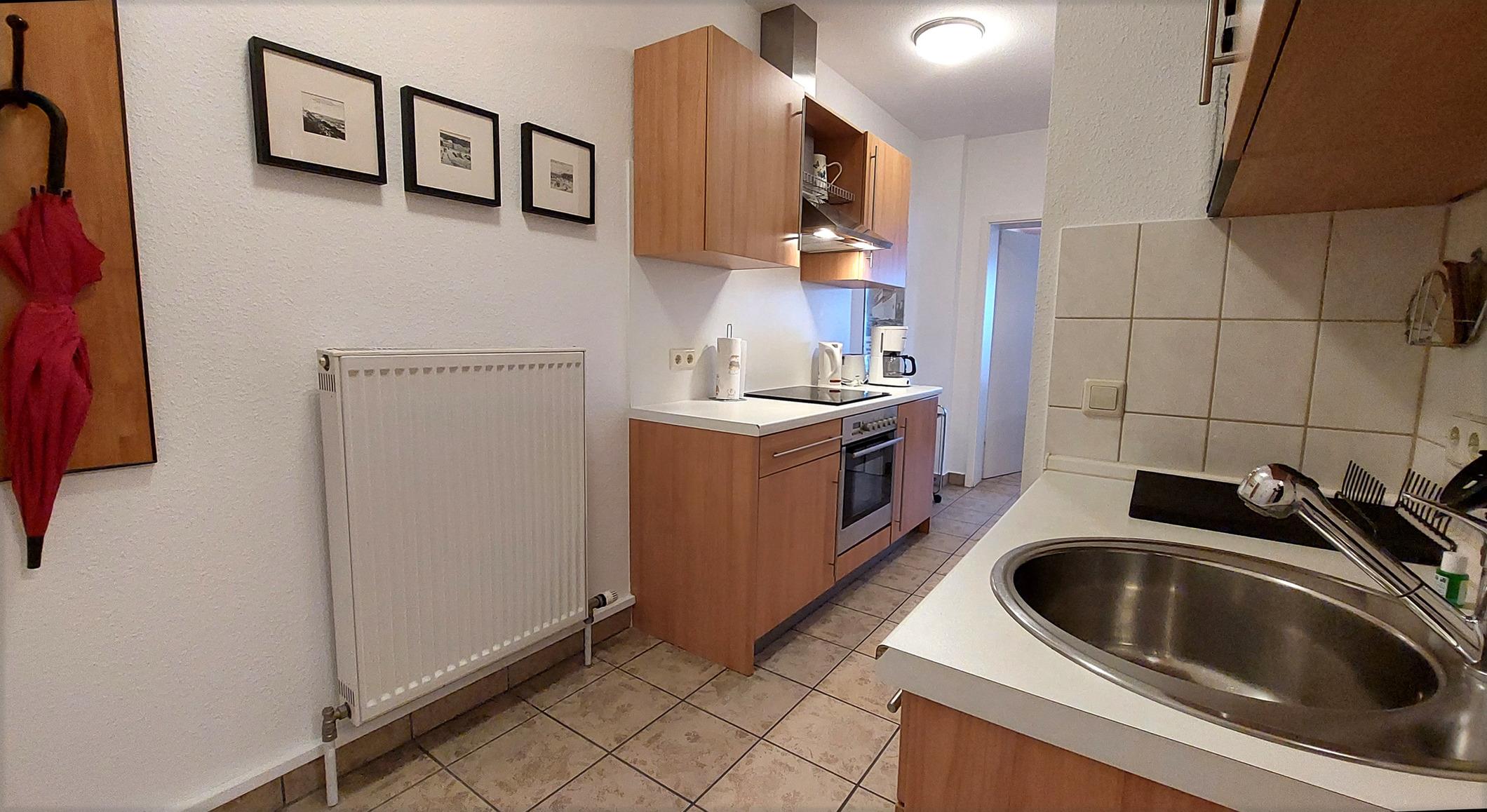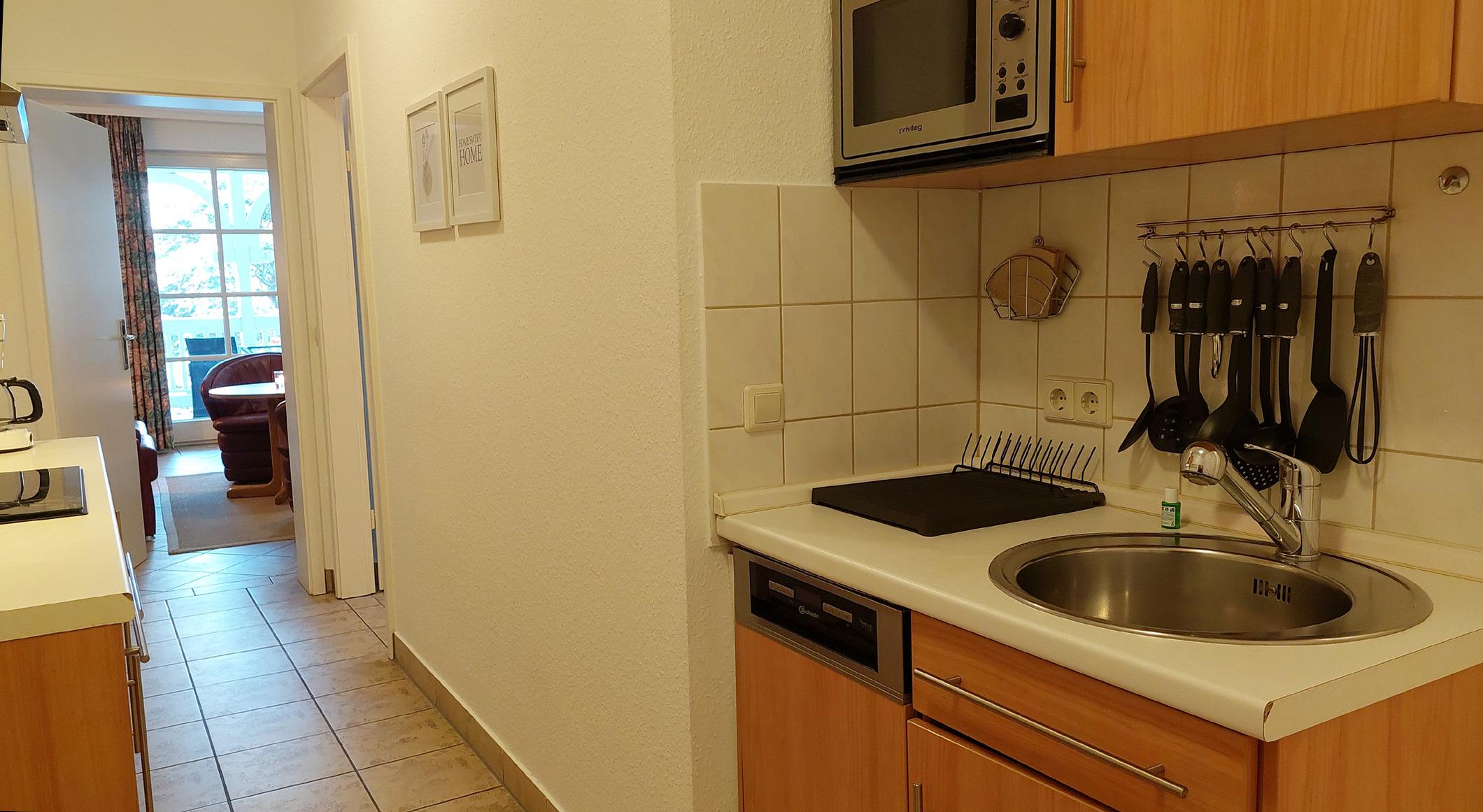 Die Küchenzeilen sind ausgestattet mit Backofen, Ceranherd, Mikrowelle, Geschirrspüler, Kühlschrank mit Gefrierfach, Senseo-Maschine, Eierkocher und vielen weiteren nützlichen Kochutensilien.