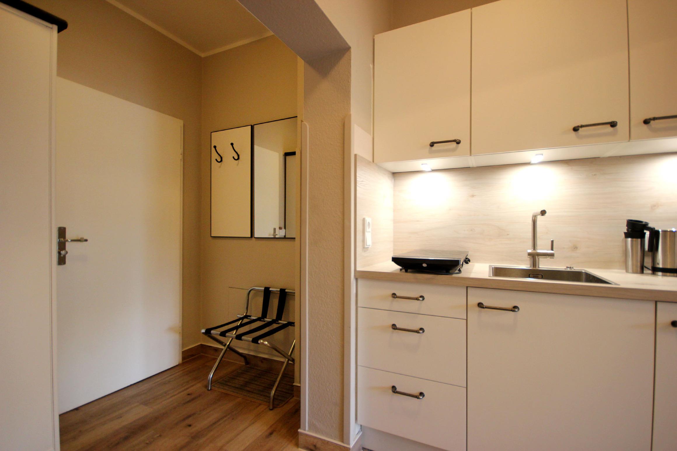 Darüber hinaus bereiten die zusätzlichen Verdunklungsstoffe ein angenehmes Schlafambiente. Die technische Ausstattung umfasst einen Fachbildfernseher und einen kostenfreien WLAN-Zugang und für die ruhigen Stunden eine kleine Büchersammlung. Die Küchenzeile ist mit Cerankochfeld, Kühlschrank mit kleinem Gefrierfach, Kaffeemaschine, Toaster, Wasserkocher und weiteren Küchenhelfern komplett ausgestattet. Ein wohnungseigener Parkplatz steht Ihnen direkt hinterm Haus zur Verfügung. Haustiere sind herzlich willkommen.