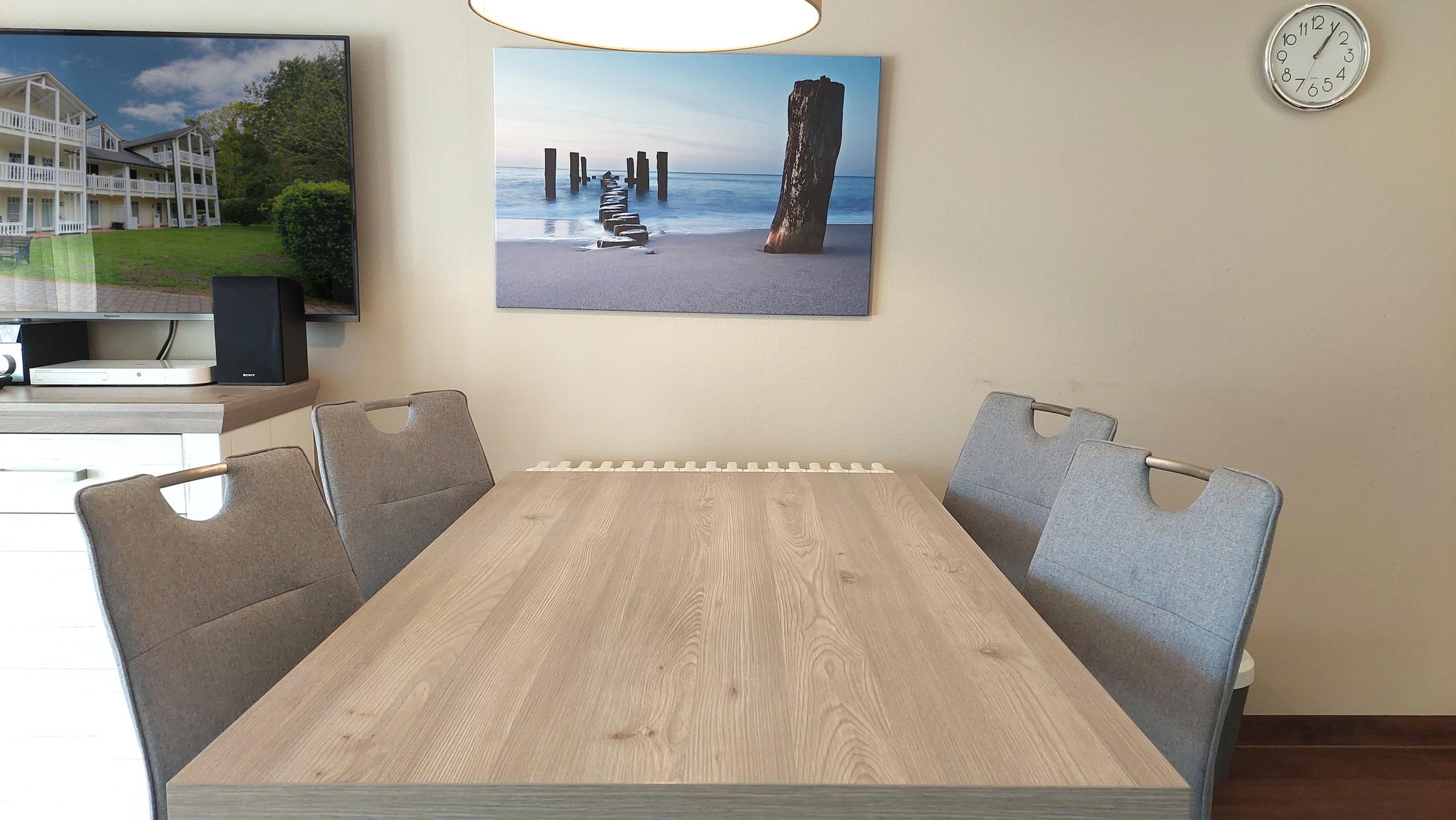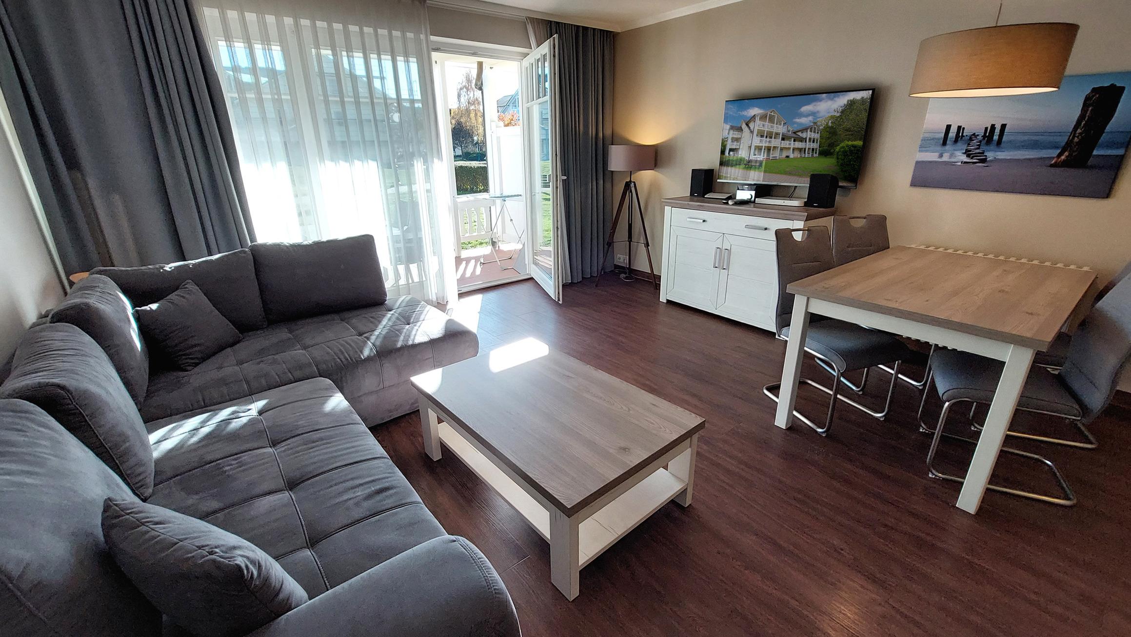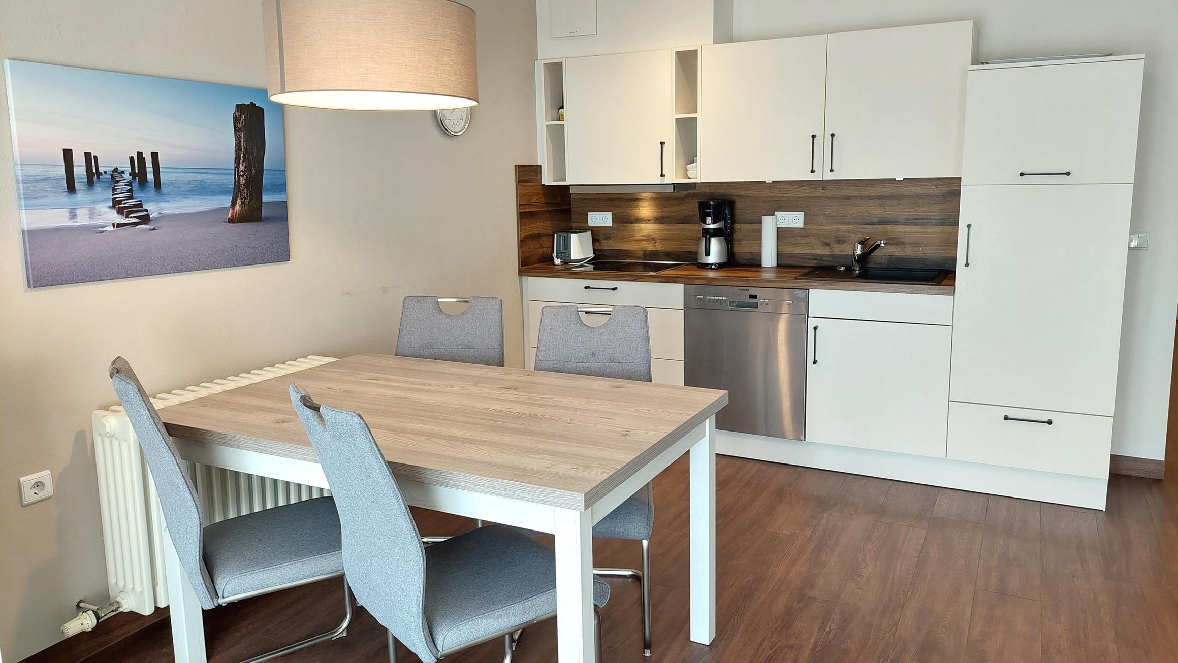 Der Wohn- und Essbereich beherbergt eine moderne Küchenzeile mit Ceran-Kochfeldern, einem Geschirrspüler, einem Kühlschrank mit Gefrierfach, einer Mikrowelle und verschiedenen Küchenutensilien. Der Essbereich bietet Platz für 4 Personen und eine gemütliche Sitzlandschaft lädt zum Verweilen ein. Zur technischen Ausstattung gehören kostenfreies WLAN, ein Smart-TV samt Blu-ray-Player und eine kleine Musikanlage.