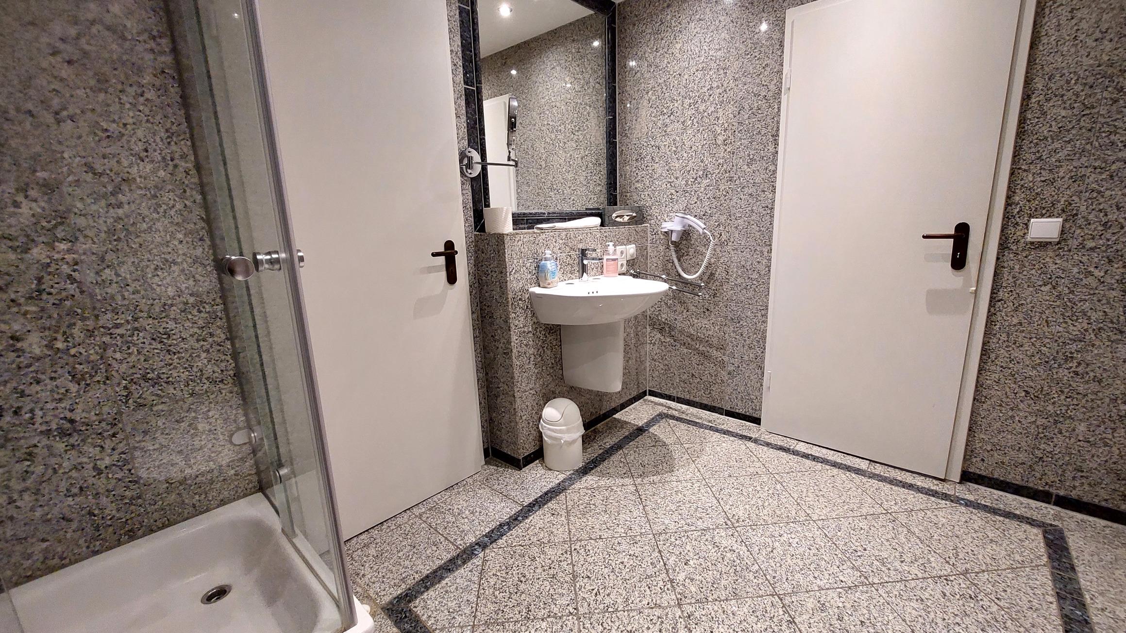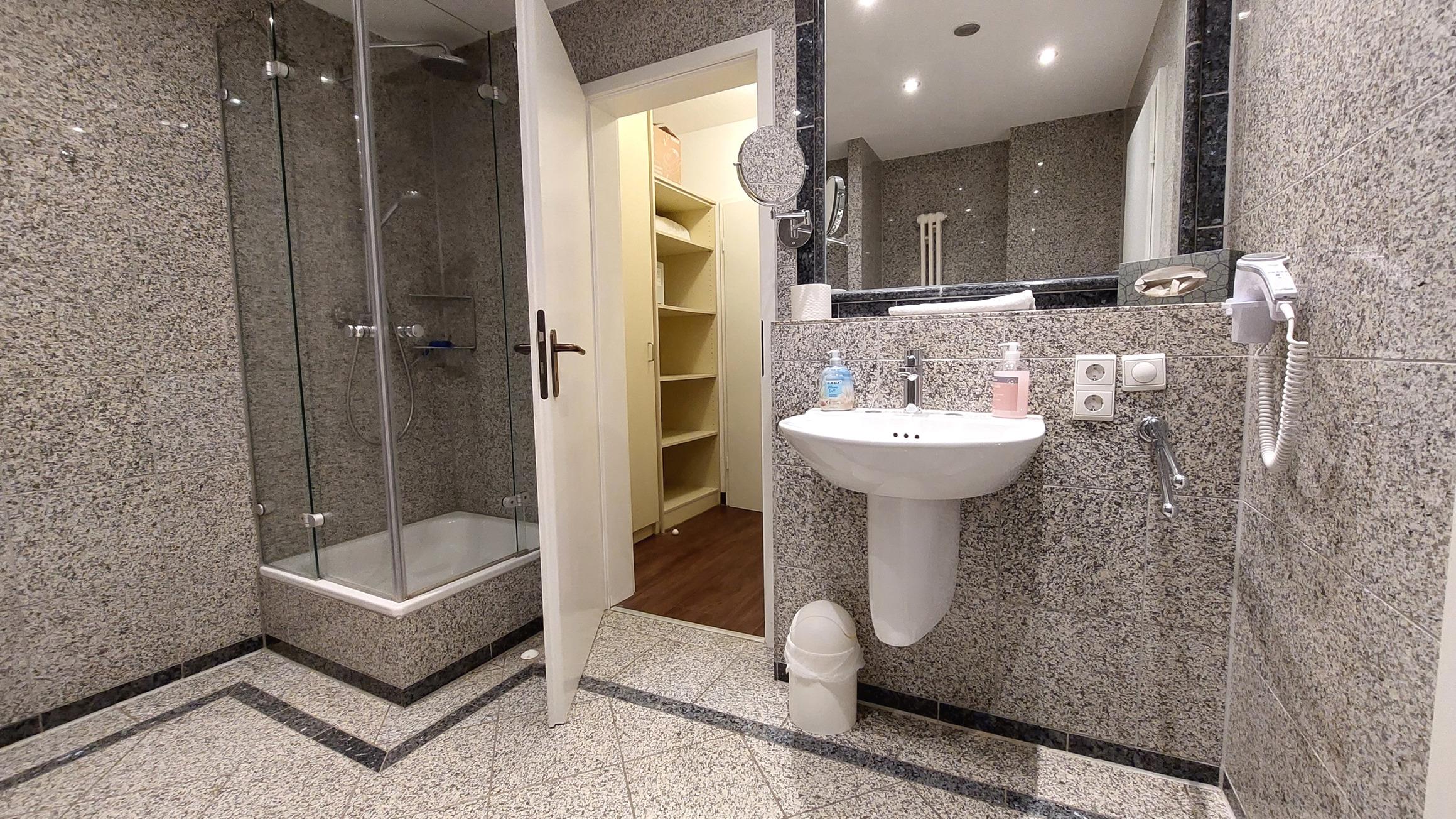 Das Badezimmer ist in Marmoroptik gehalten und verfügt über eine Toilette, einen Waschtisch, eine Dusche, einen Kosmetikspiegel, Fön und Zugang zum Ankleidezimmer mit viel Stauraum.