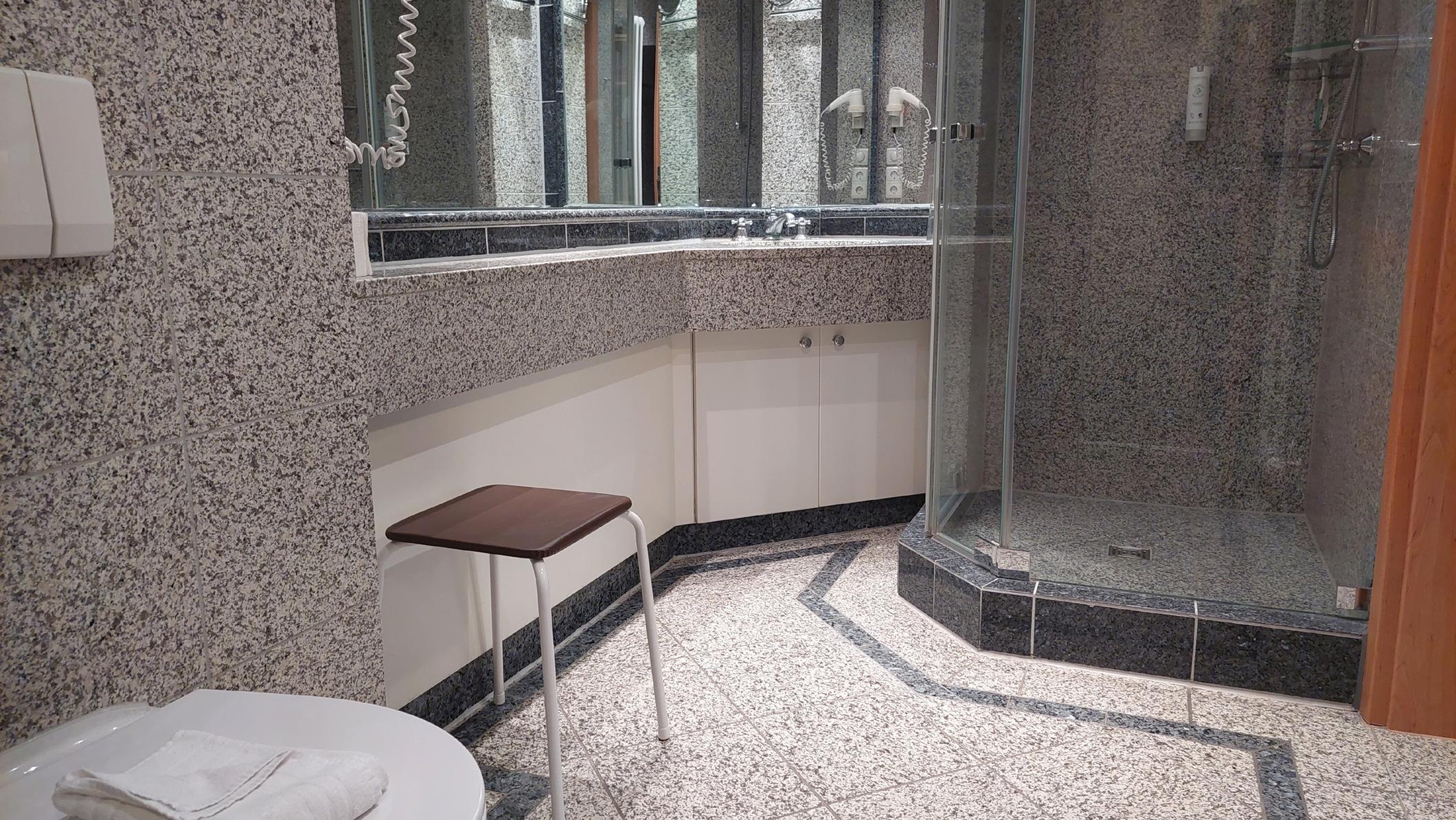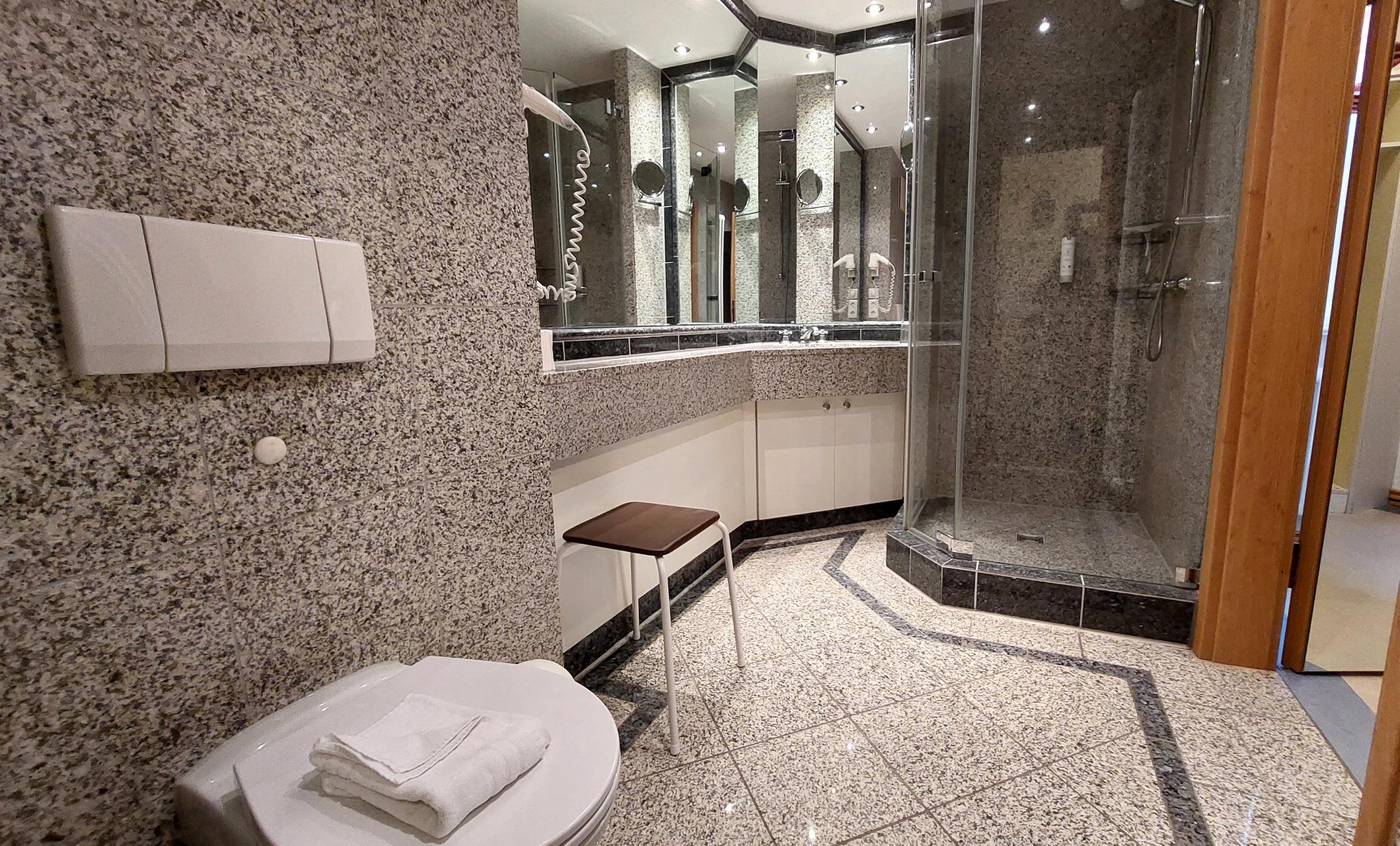 Das Bad in Marmoroptik verfügt über WC, Waschtisch, Dusche, Kosmetikspiegel und Fön.