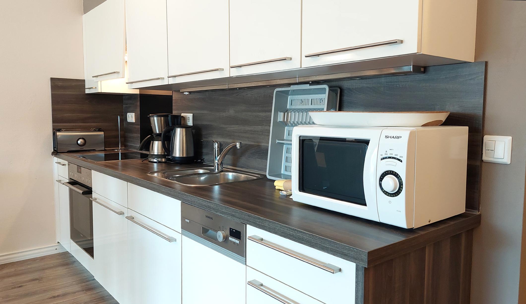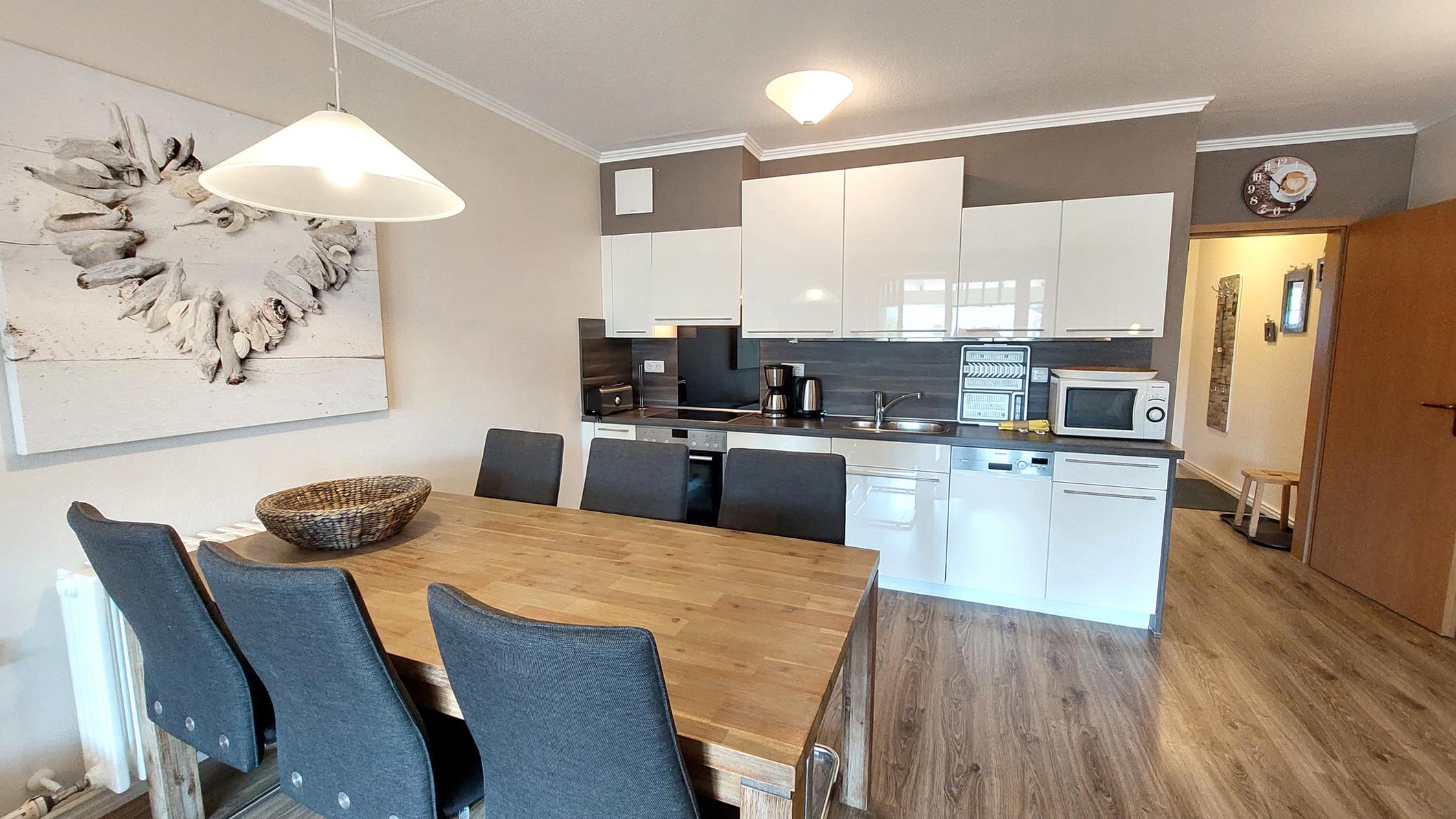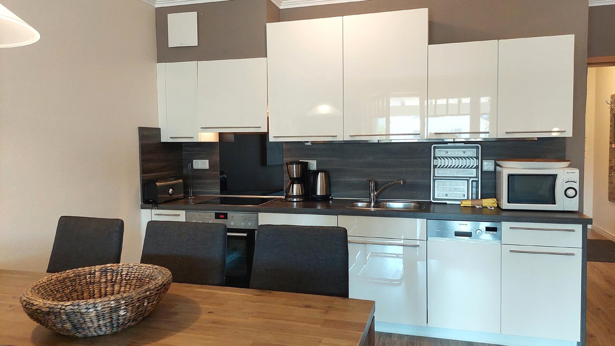 Im geräumigen Wohn- und Essbereich befindet sich eine moderne Küchenzeile mit Backofen, Ceranfeld, Geschirrspüler, Kühlschrank mit Gefrierfach, Mikrowelle und vielen nützlichen Küchenhelfern.