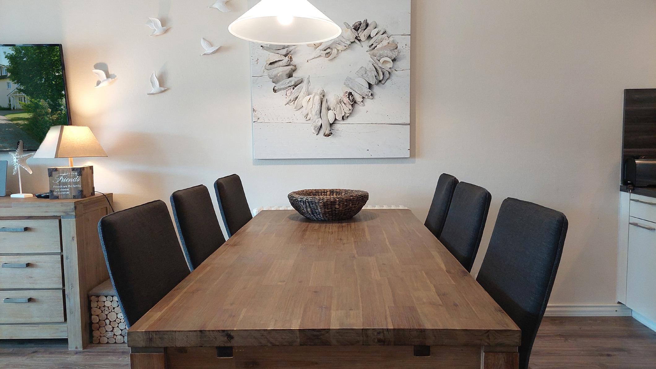 Am großen hölzernen Küchentisch ist genug Platz um auch mal Besuch zu empfangen.