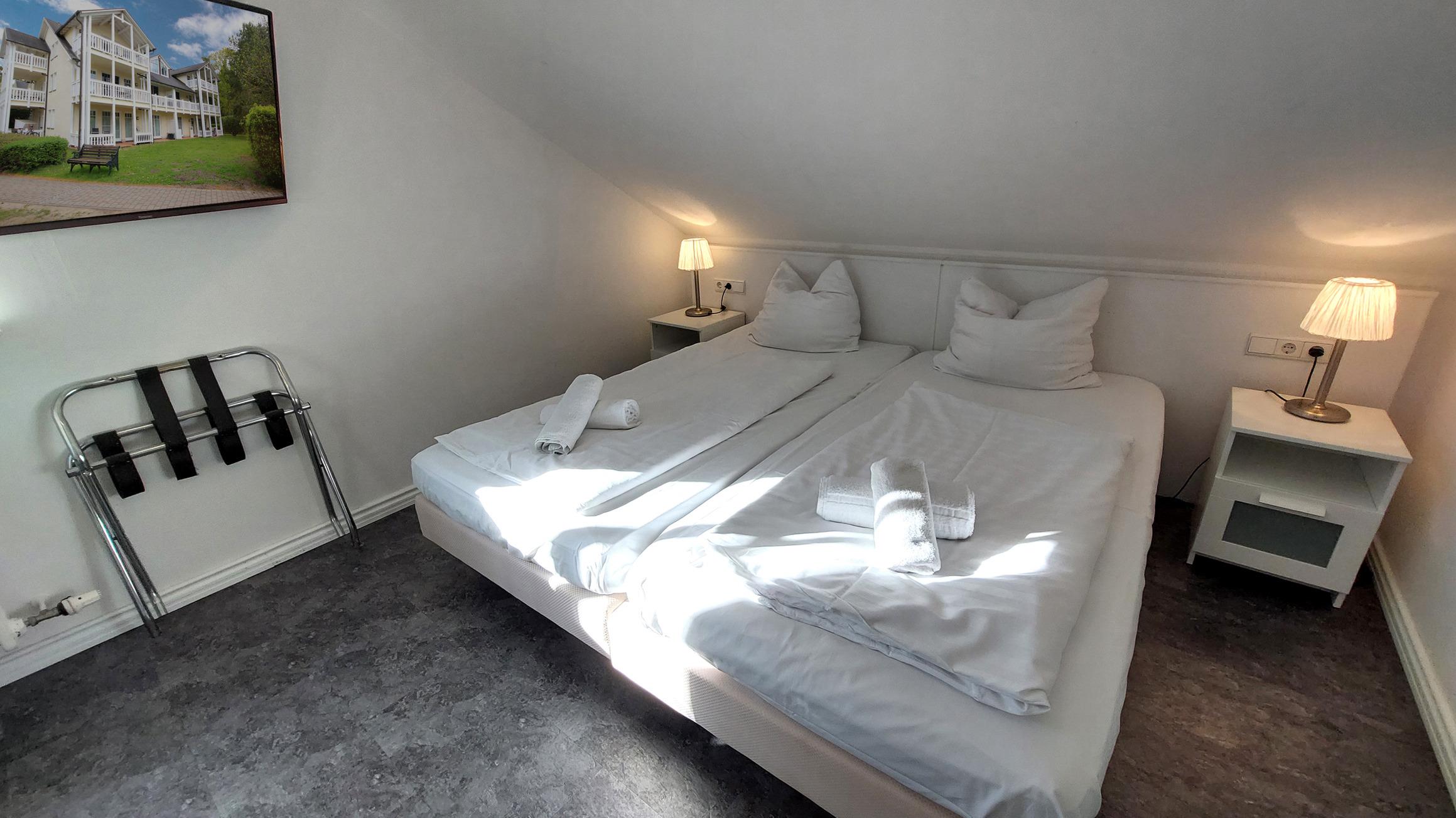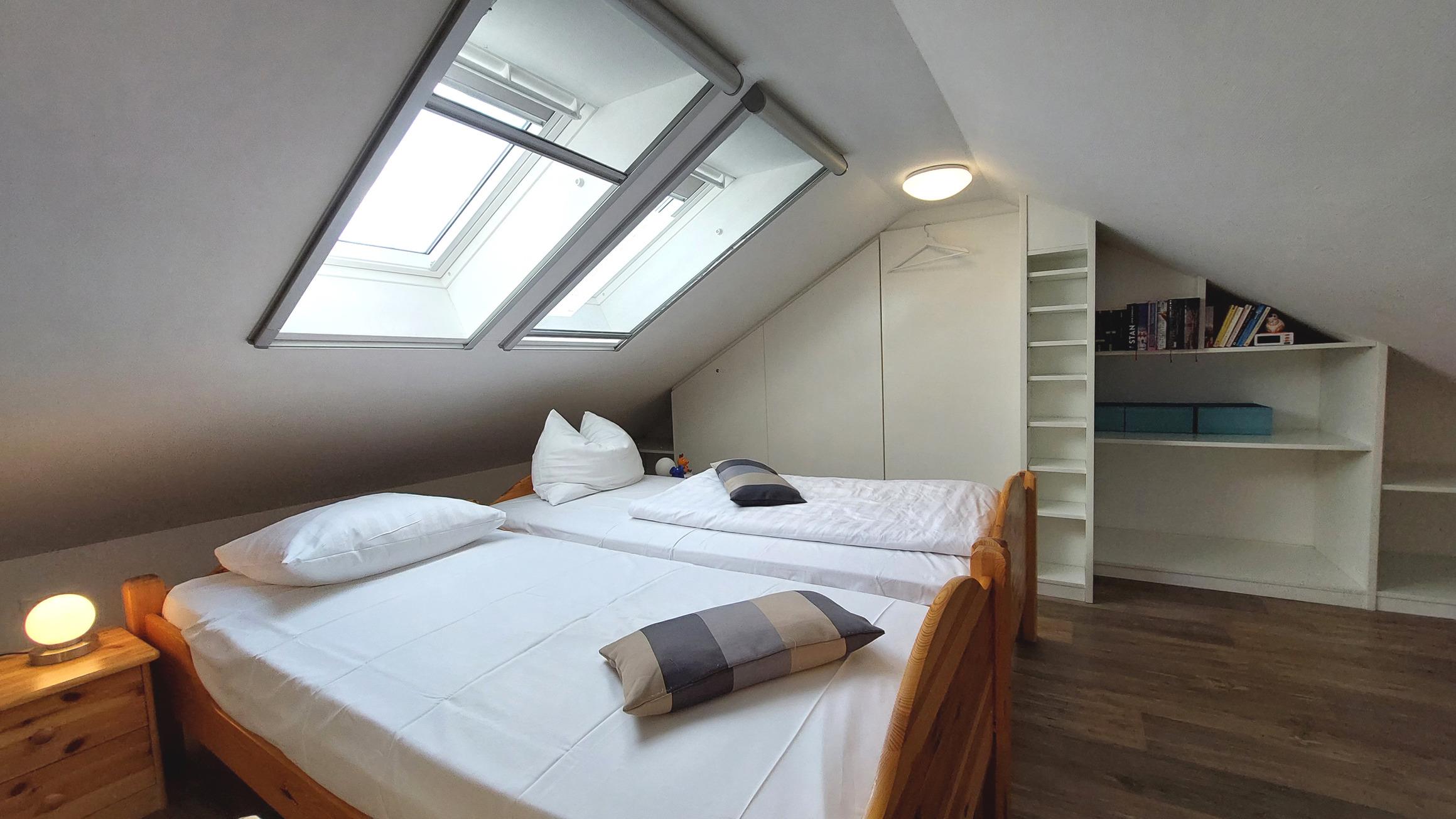 Die beiden Einzelbetten dort können problemlos zusammenschoben werden.