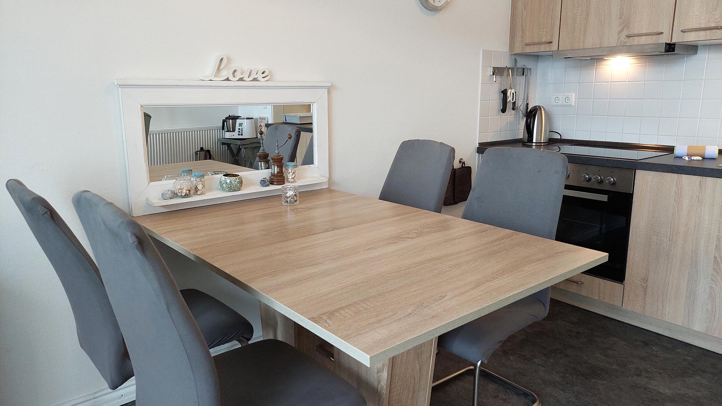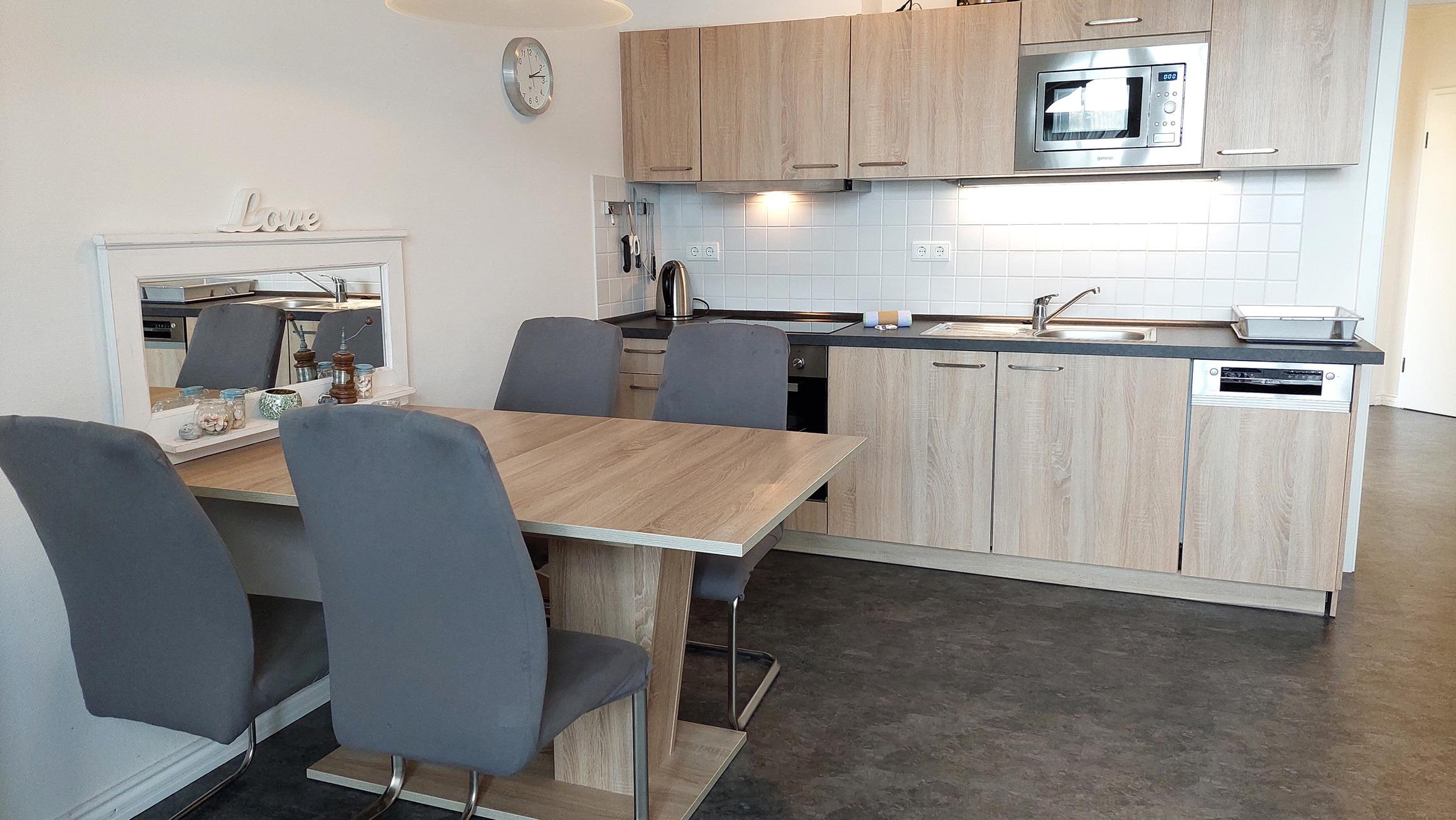 Im geräumigen Wohn- und Essbereich befindet sich eine moderne Küchenzeile mit Backofen, Ceranfeld, Geschirrspüler, Kühlschrank mit Gefrierfach, Mikrowelle und vielen nützlichen Küchenhelfern.