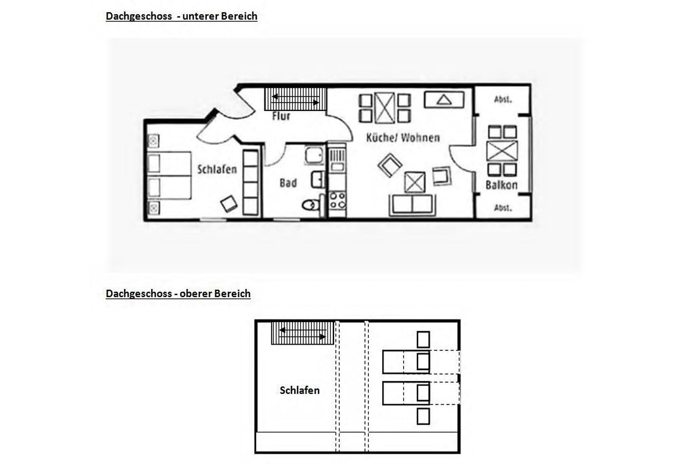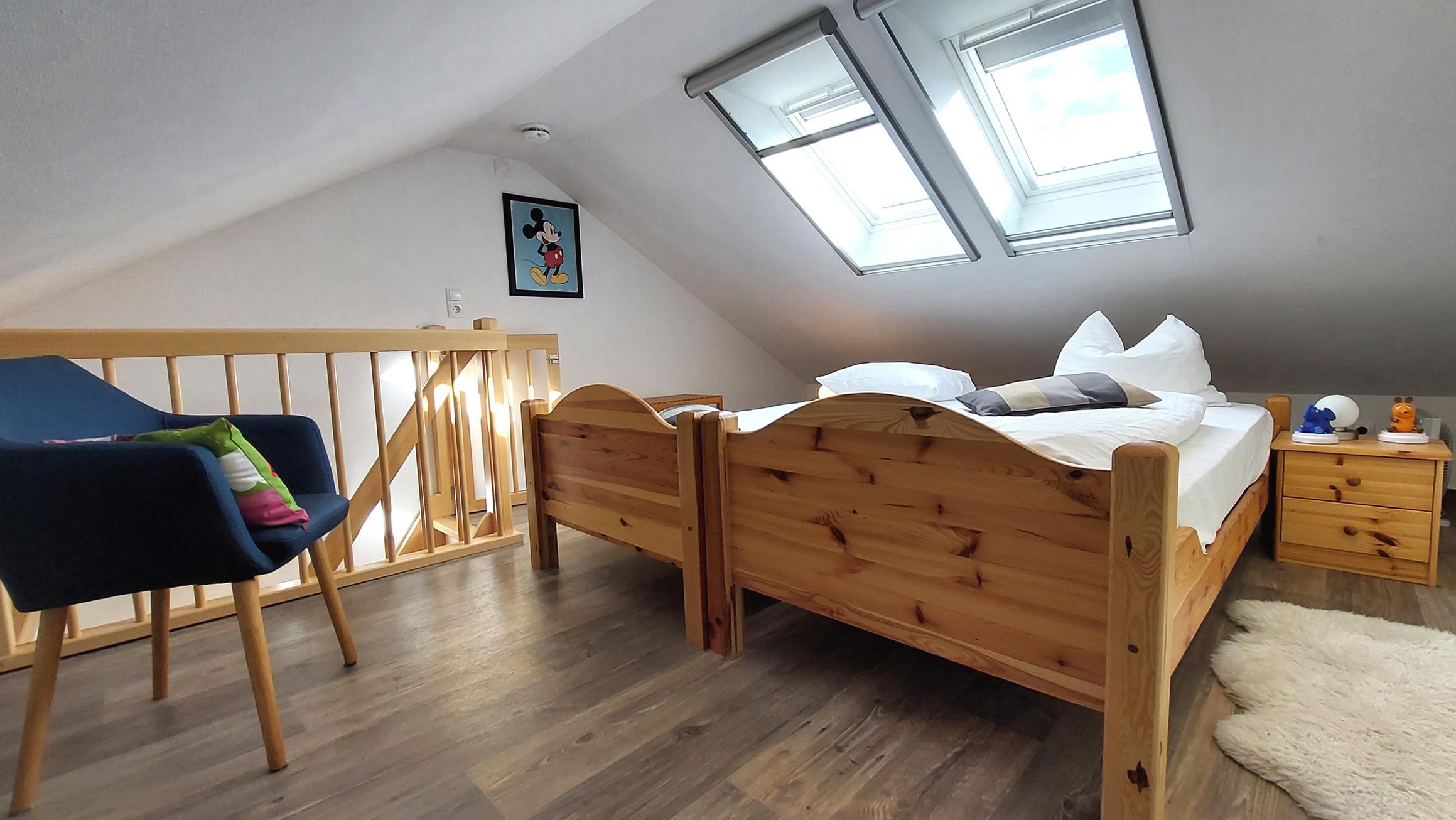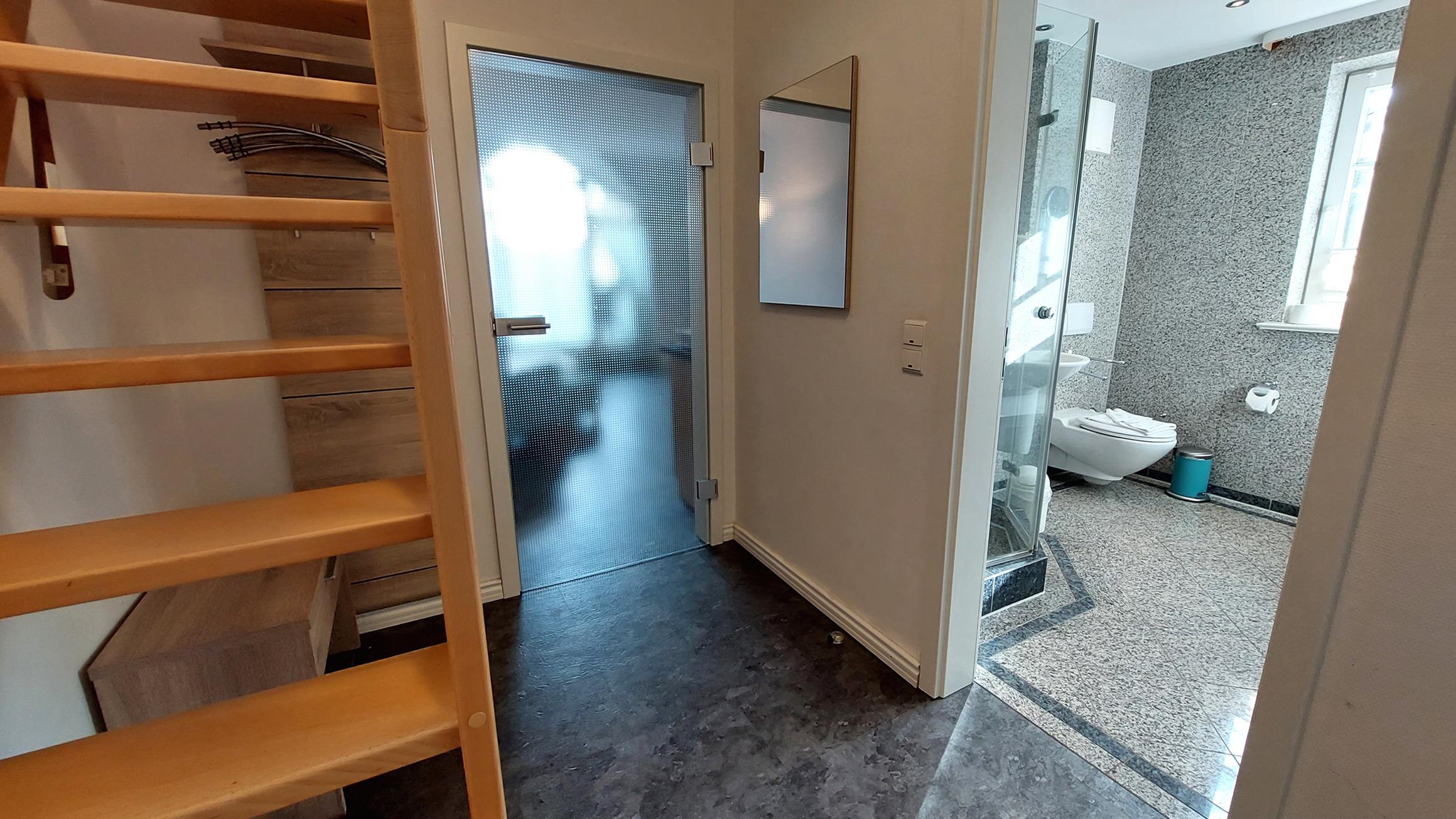 Das Appartement befindet sich im zweiten Obergeschoss und hat, dank des ausgebauten Dachgeschoss, ein vollwertiges zweites Schlafzimmer. Dieses ist via offener Holztreppe zu erreichen und verfügt, oben wie unten, über eine Treppensicherung.