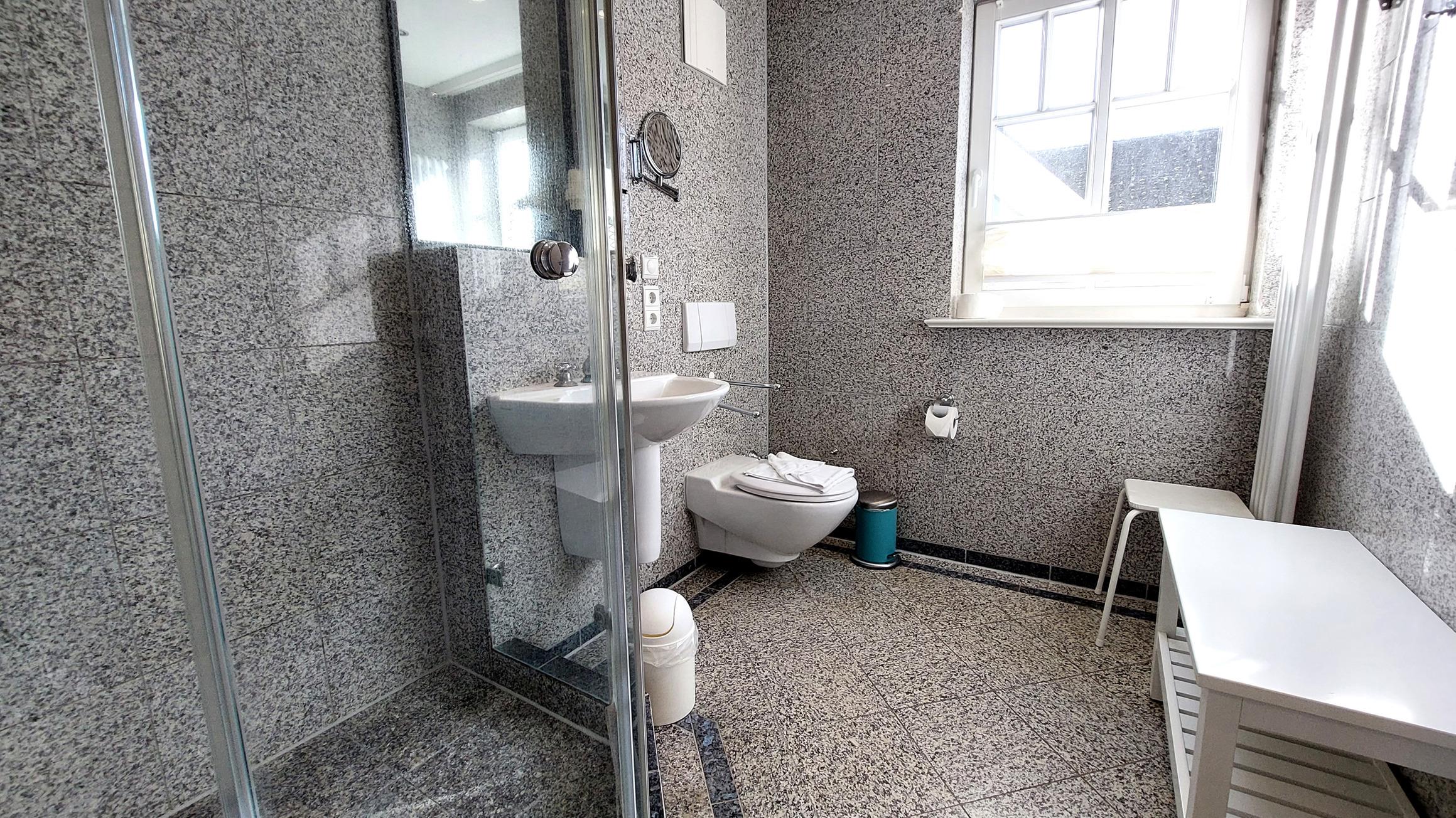 Das Bad in Marmoroptik verfügt über WC, Waschtisch, Dusche, Kosmetikspiegel und Fön.