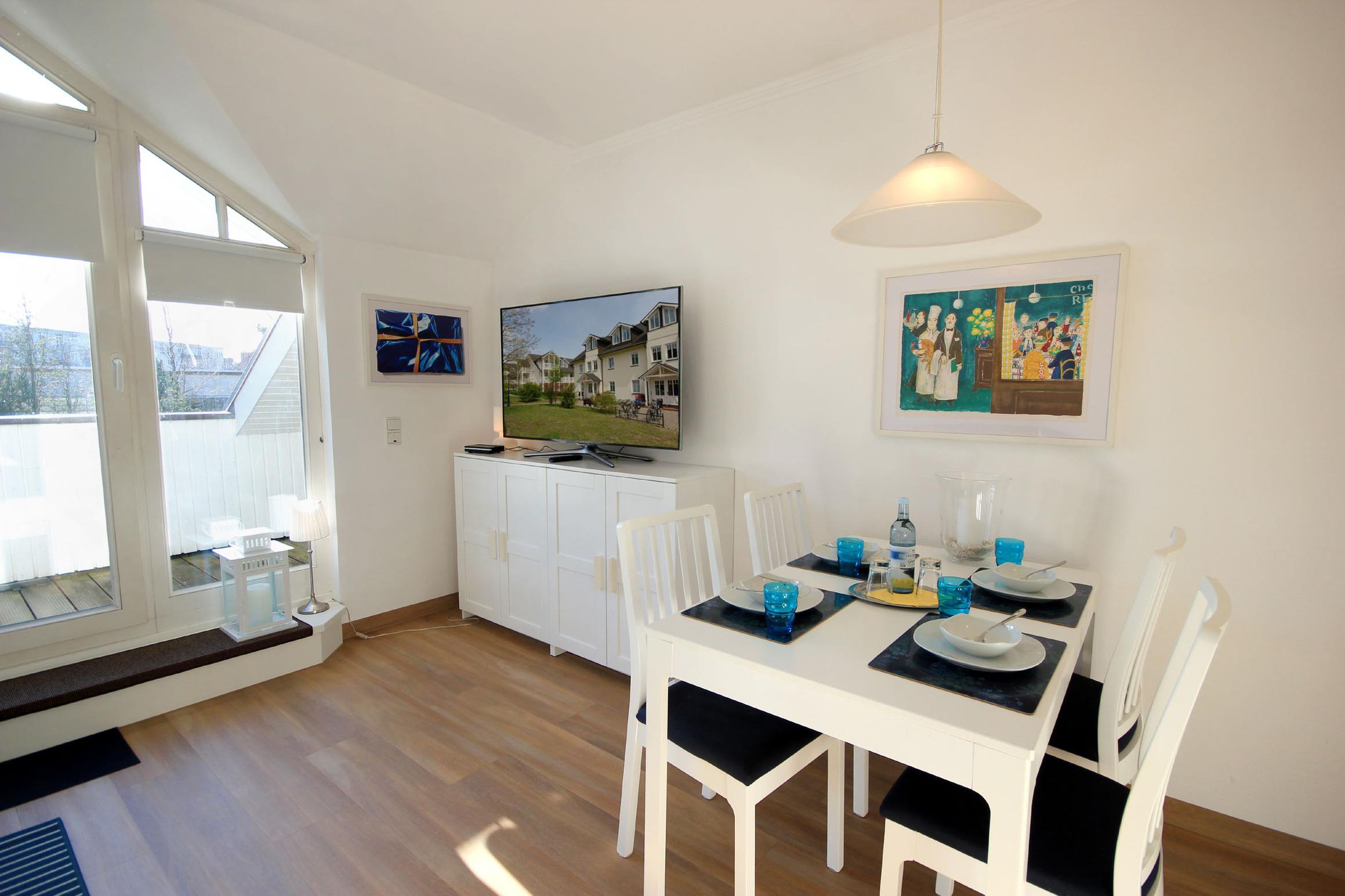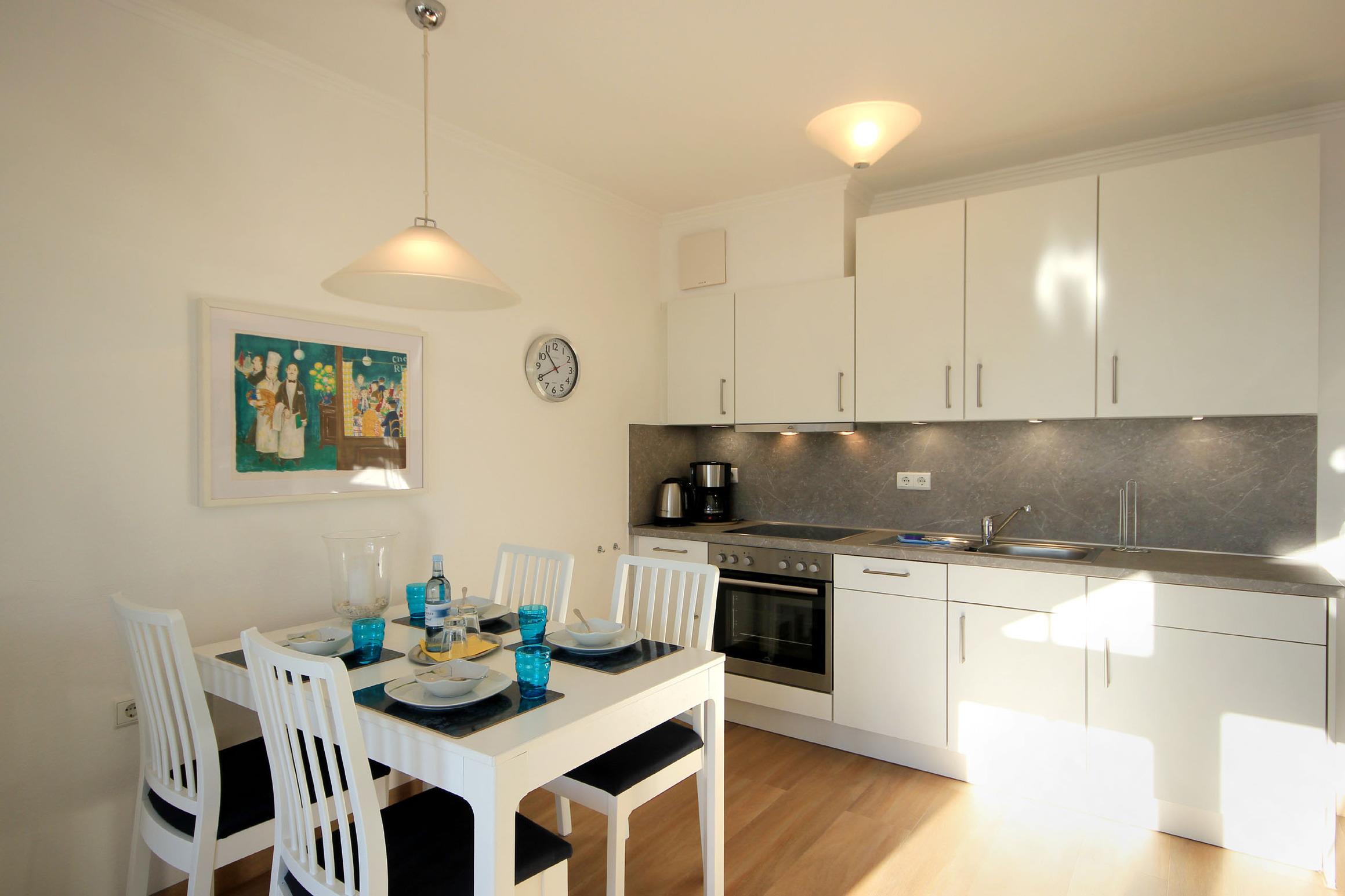Ihre gemütliche 2-Raum Ferienwohnung 16RB305 (Nichtraucher)hat eine Größe von ca. 52 qm und ist für max. 4 Personen eingerichtet. Sie befindet sich im 2. Obergeschoss (Endetage) und verfügt über einen Südbalkon, der zum Verweilen einlädt. Im Wohnbereich mit offener, moderner Küchenzeile und separatem Essbereich finden Sie eine Sitzecke mit Schlafcouch für 2 Personen, Flachbild-TV und Radio. Vom Wohnraum gelangen Sie auf den Südbalkon, der auch für 4 Personen reichlich Platz zum Sitzen oder Sonnen bietet. Das separate Schlafzimmer ist mit einem Doppelbett und einem großen Kleiderschrank ausgestattet. Das Badezimmer ist mit einer Fußbodenheizung versehen und exklusiv mit Granit gefliest. Zur Ausstattung gehört eine Dusche, Waschtisch, WC, Kosmetikspiegel und Fön. Die Küche ist mit Backofen, Kühl-/Gefrierkombination, Geschirrspüler, Kaffeemaschine, Toaster, Wasserkocher und anderen diversen Küchenhelfern komplett ausgestattet. Kostenfreies WLAN ist natürlich vorhanden. nutzen. Ein wohnungseigener PKW-Stellplatz steht Ihnen am Haus kostenfrei zur Verfügung.