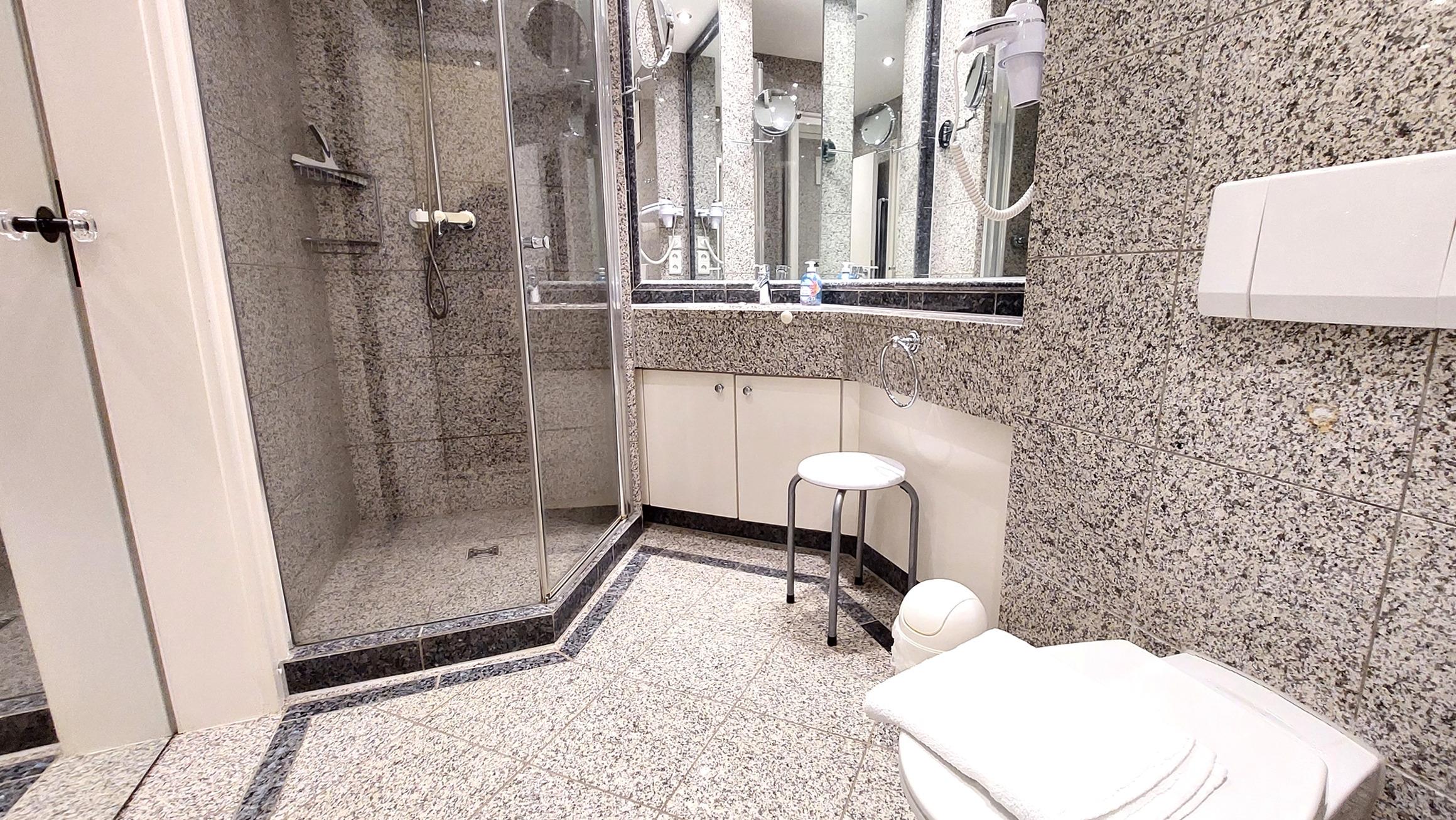 Das Badezimmer ist in Marmoroptik gehalten und verfügt über eine Toilette, einen Waschtisch, eine Dusche, einen Kosmetikspiegel, Fön und Zugang zum Ankleidezimmer mit viel Stauraum.
