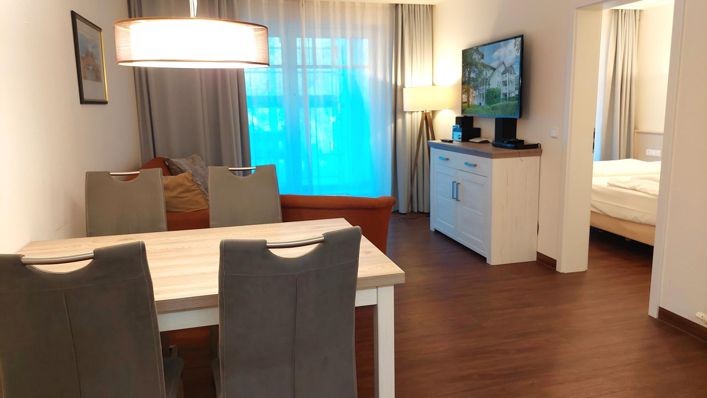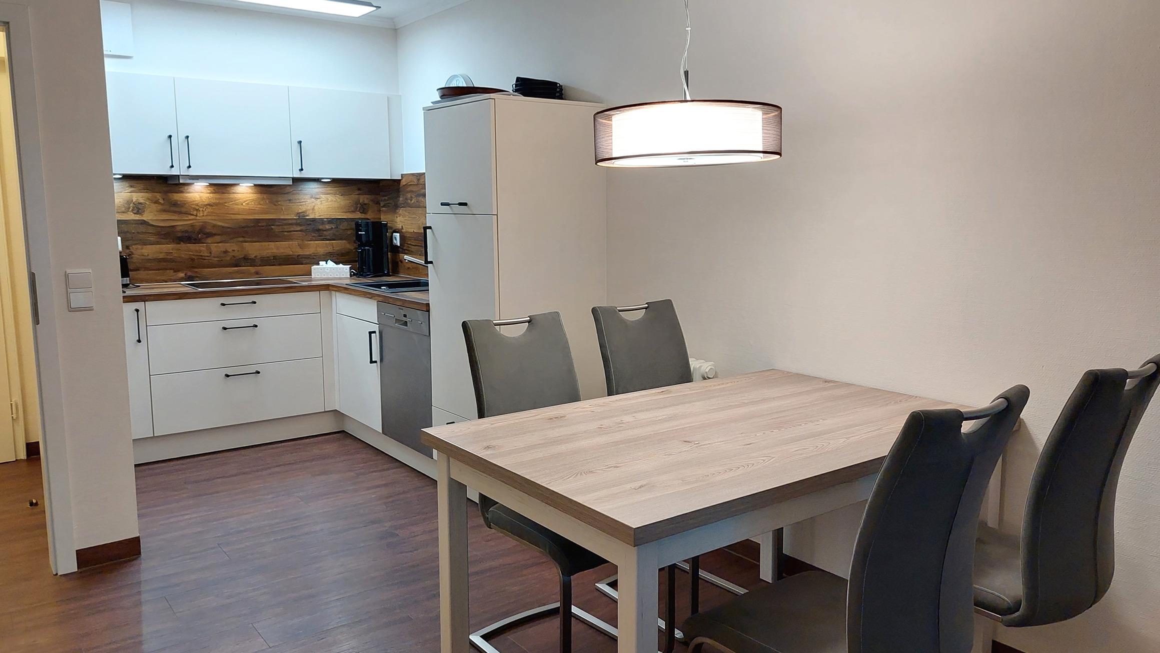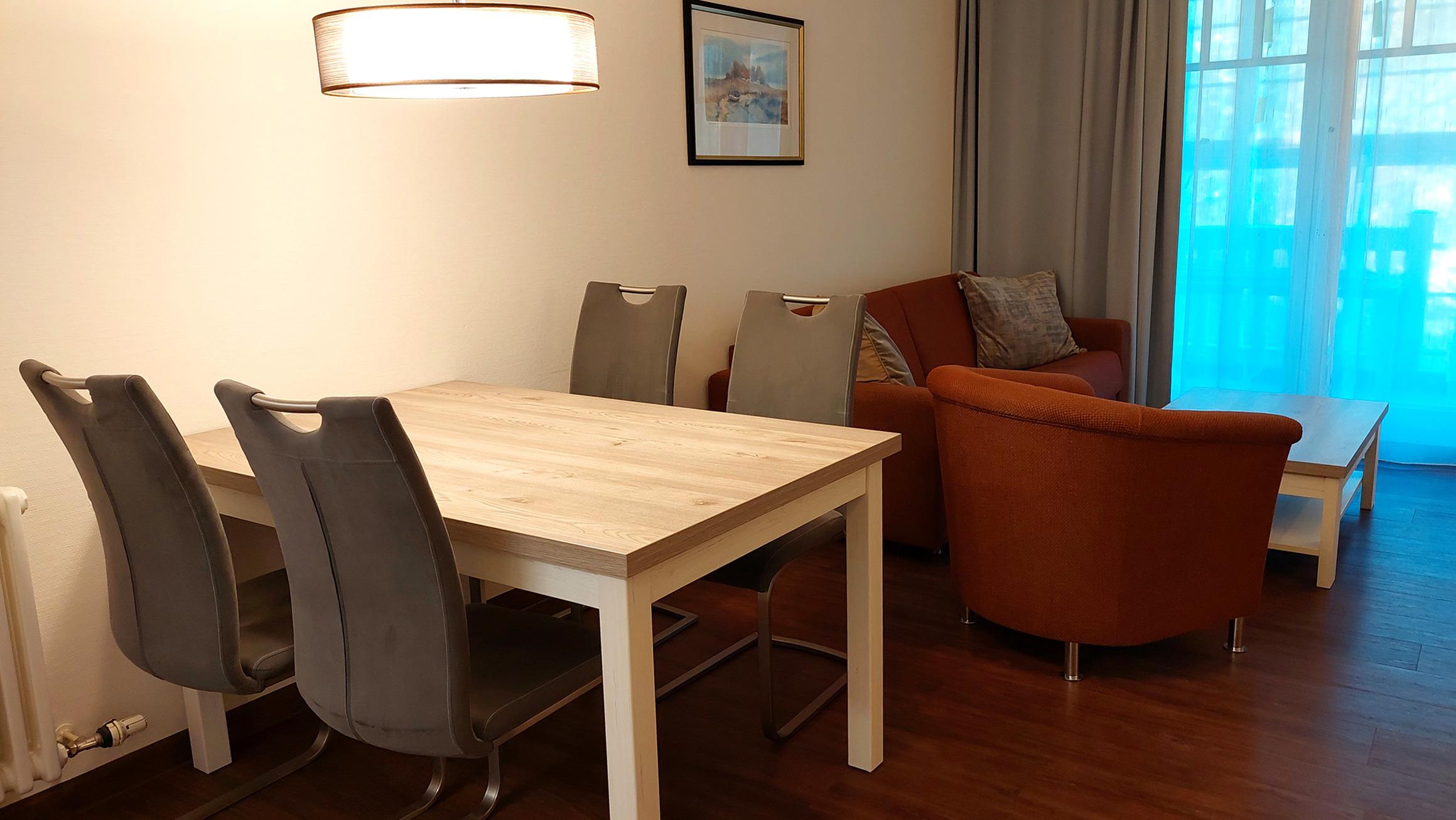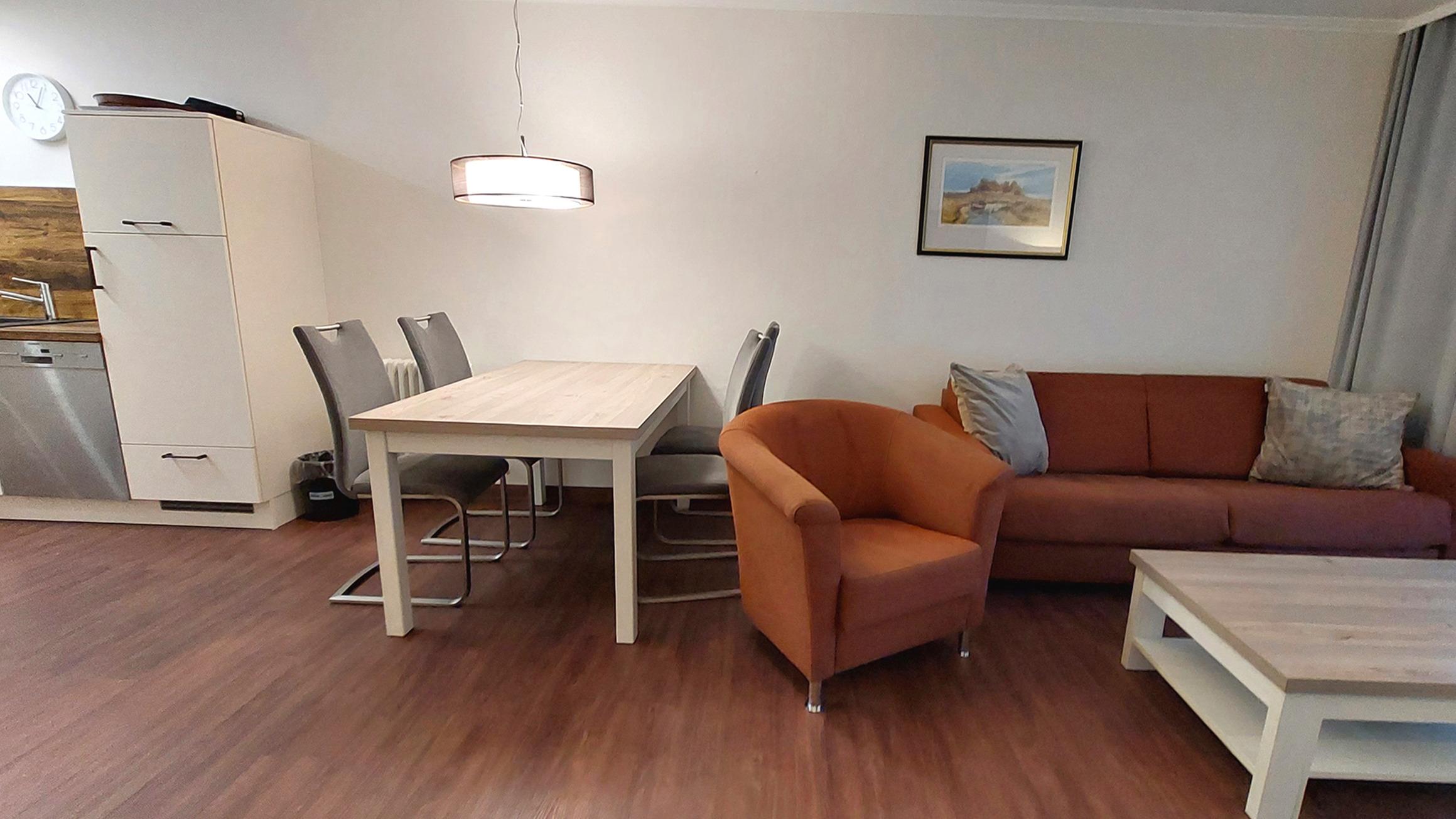 Der Wohn- und Essbereich beherbergt eine moderne Küchenzeile mit Ceran-Kochfeldern, einem Geschirrspüler, einem Kühlschrank mit Gefrierfach, einer Mikrowelle und verschiedenen Küchenutensilien. Der Essbereich bietet sogar Platz für 4 Personen und eine gemütliche Sitzlandschaft lädt zum Verweilen ein. Zur technischen Ausstattung gehören kostenfreies WLAN, ein Smart-TV samt Blu-ray-Player und eine kleine Musikanlage.