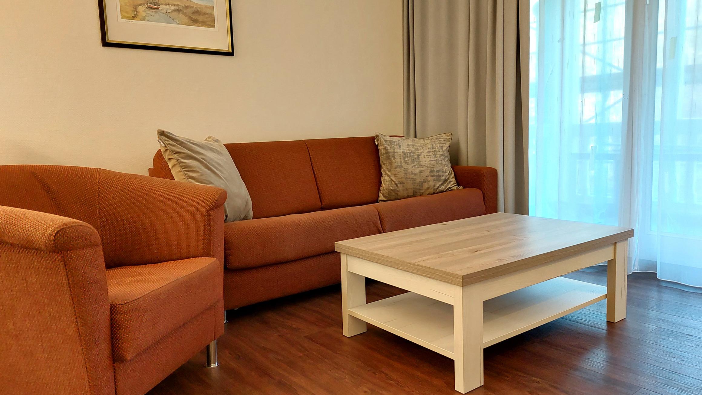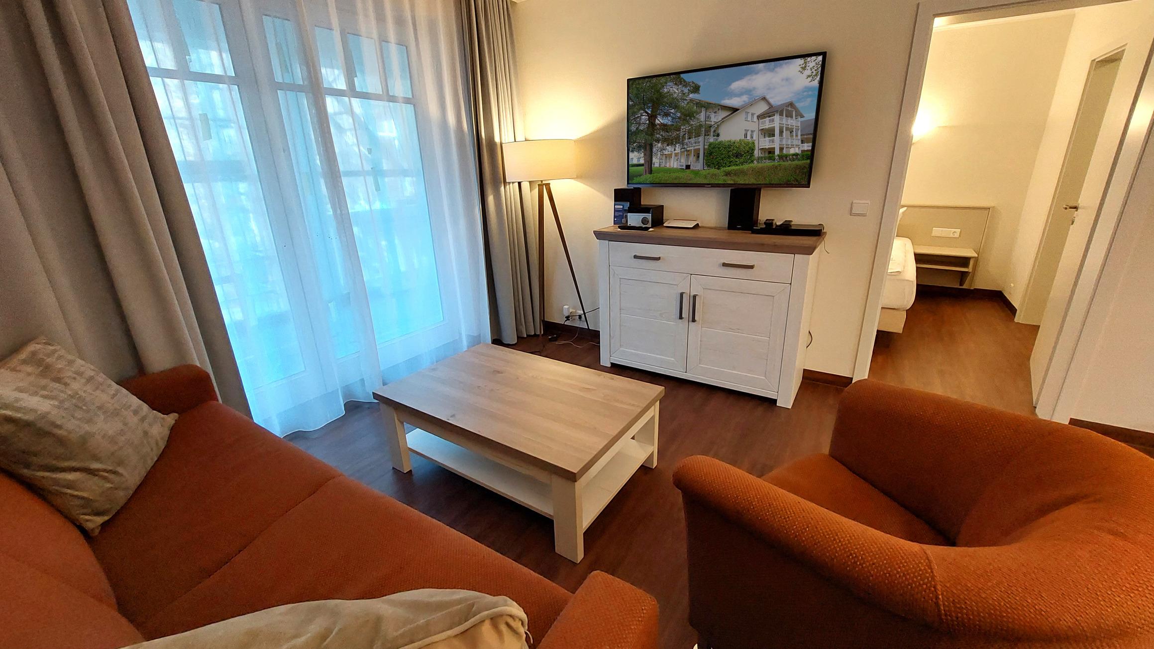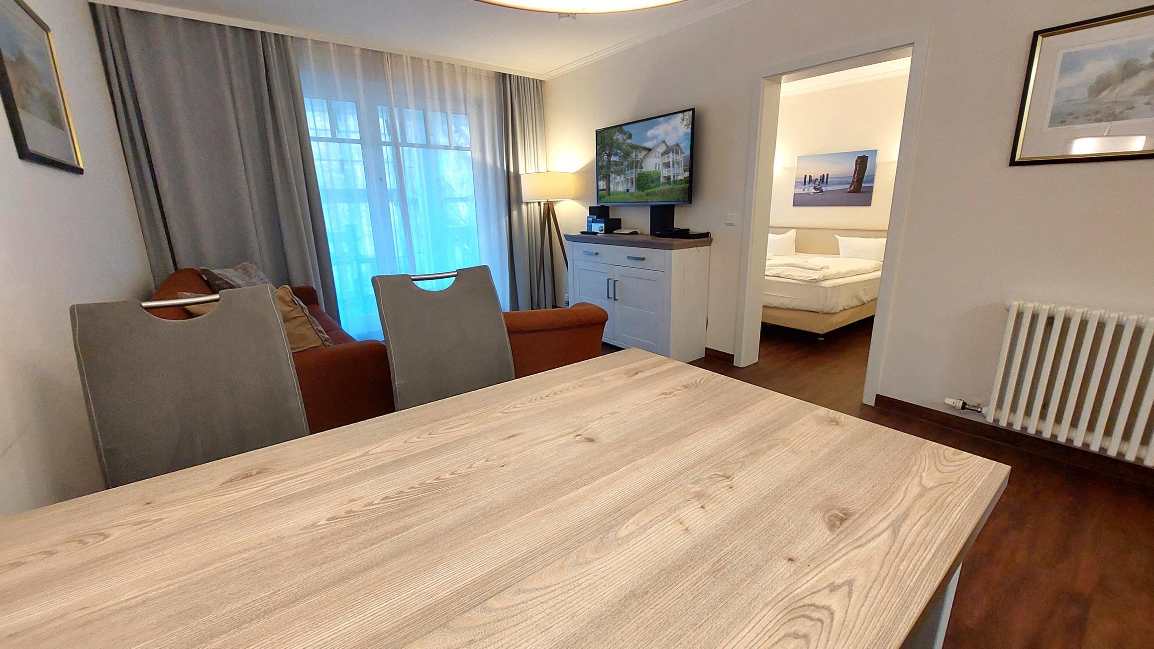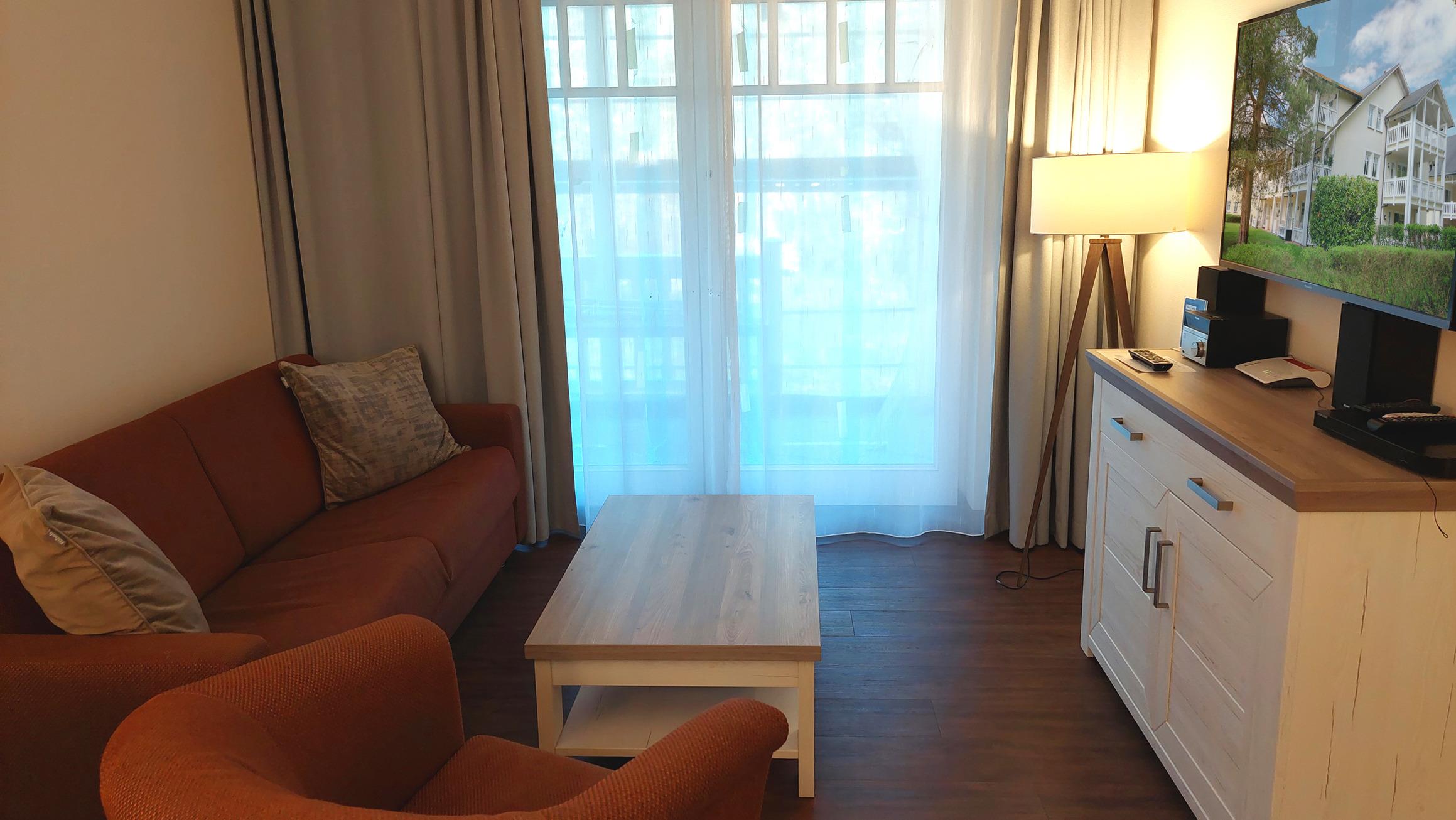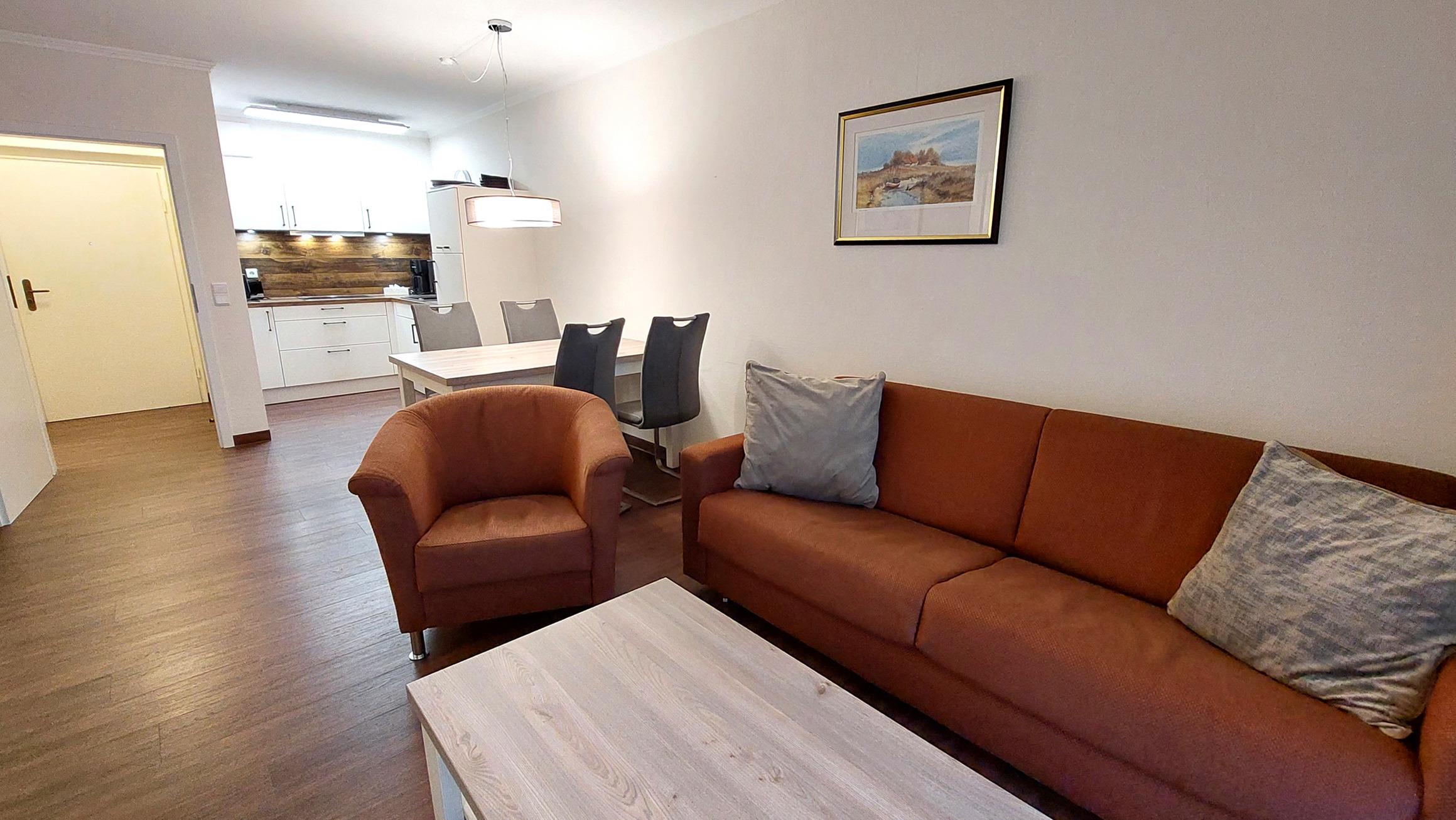 Der Wohn- und Essbereich beherbergt eine moderne Küchenzeile mit Ceran-Kochfeldern, einem Geschirrspüler, einem Kühlschrank mit Gefrierfach, einer Mikrowelle und verschiedenen Küchenutensilien. Der Essbereich bietet sogar Platz für 4 Personen und eine gemütliche Sitzlandschaft lädt zum Verweilen ein. Zur technischen Ausstattung gehören kostenfreies WLAN, ein Smart-TV samt Blu-ray-Player und eine kleine Musikanlage.