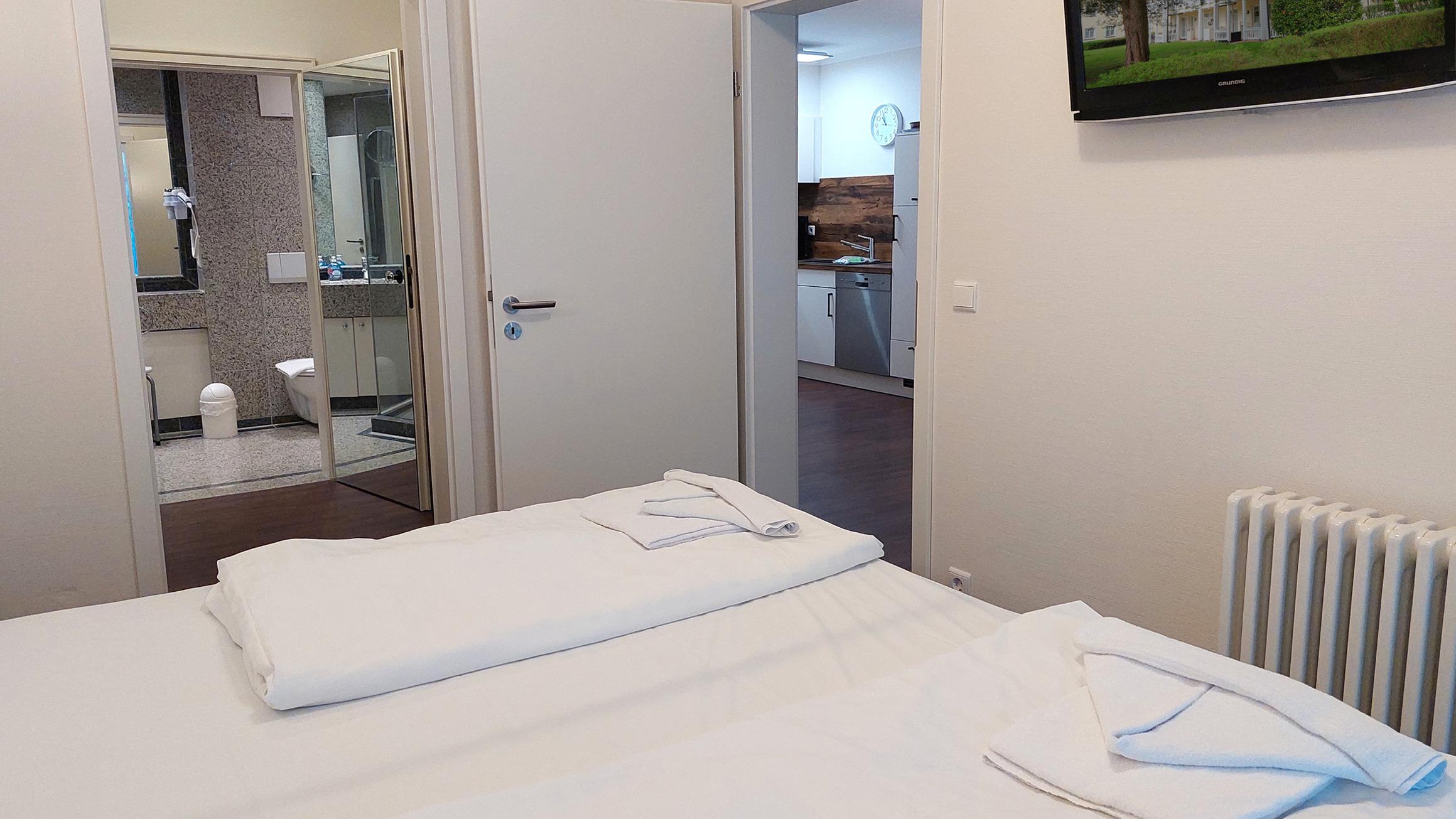 Von dort aus gelangen Sie auch ins Schlafzimmer, welches mit einem Doppelbett und einem zusätzlichen TV ausgestattet ist.