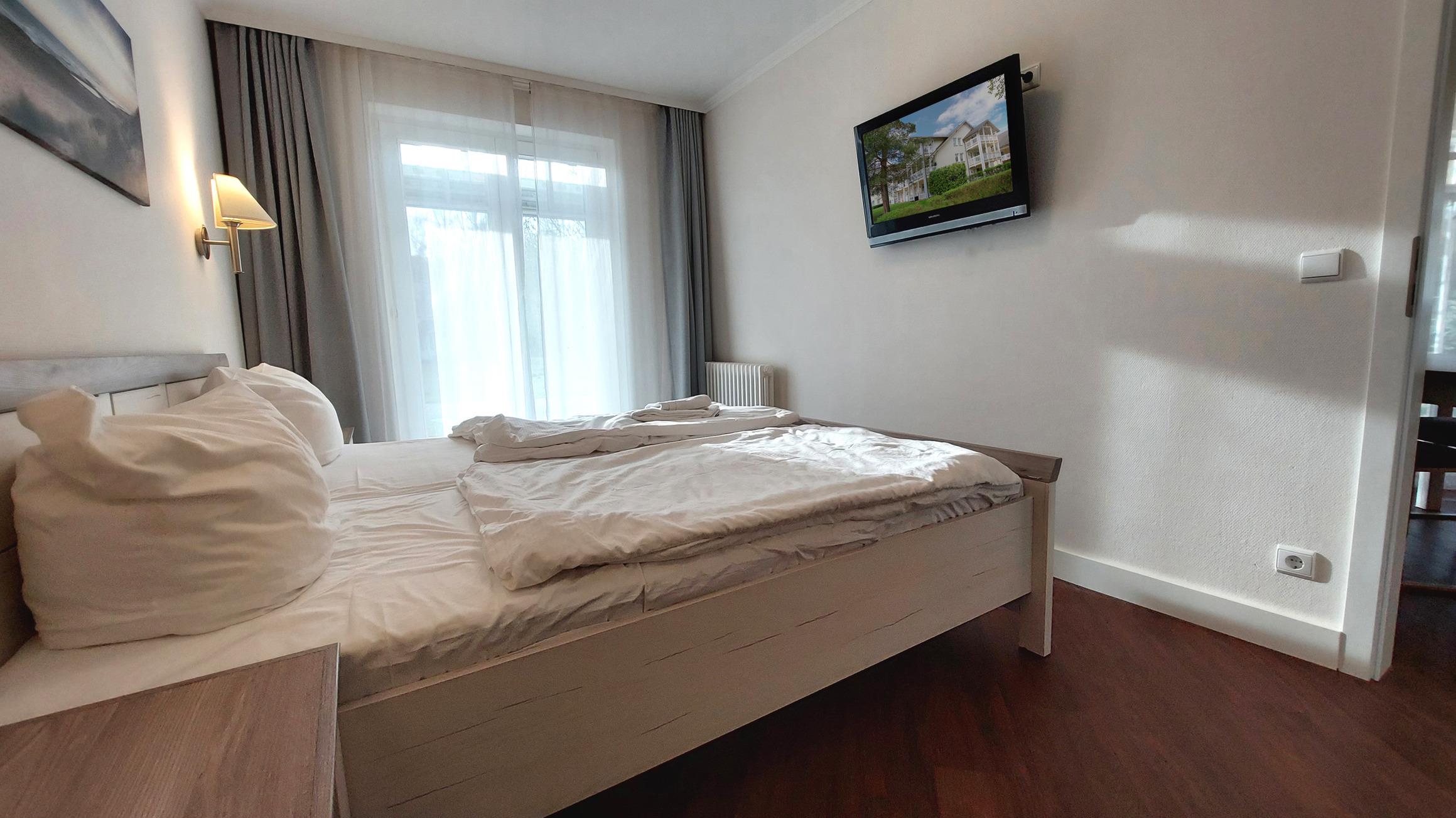 Von dort aus gelangen Sie auch ins Schlafzimmer, welches mit einem Doppelbett und einem zusätzlichen TV ausgestattet ist.