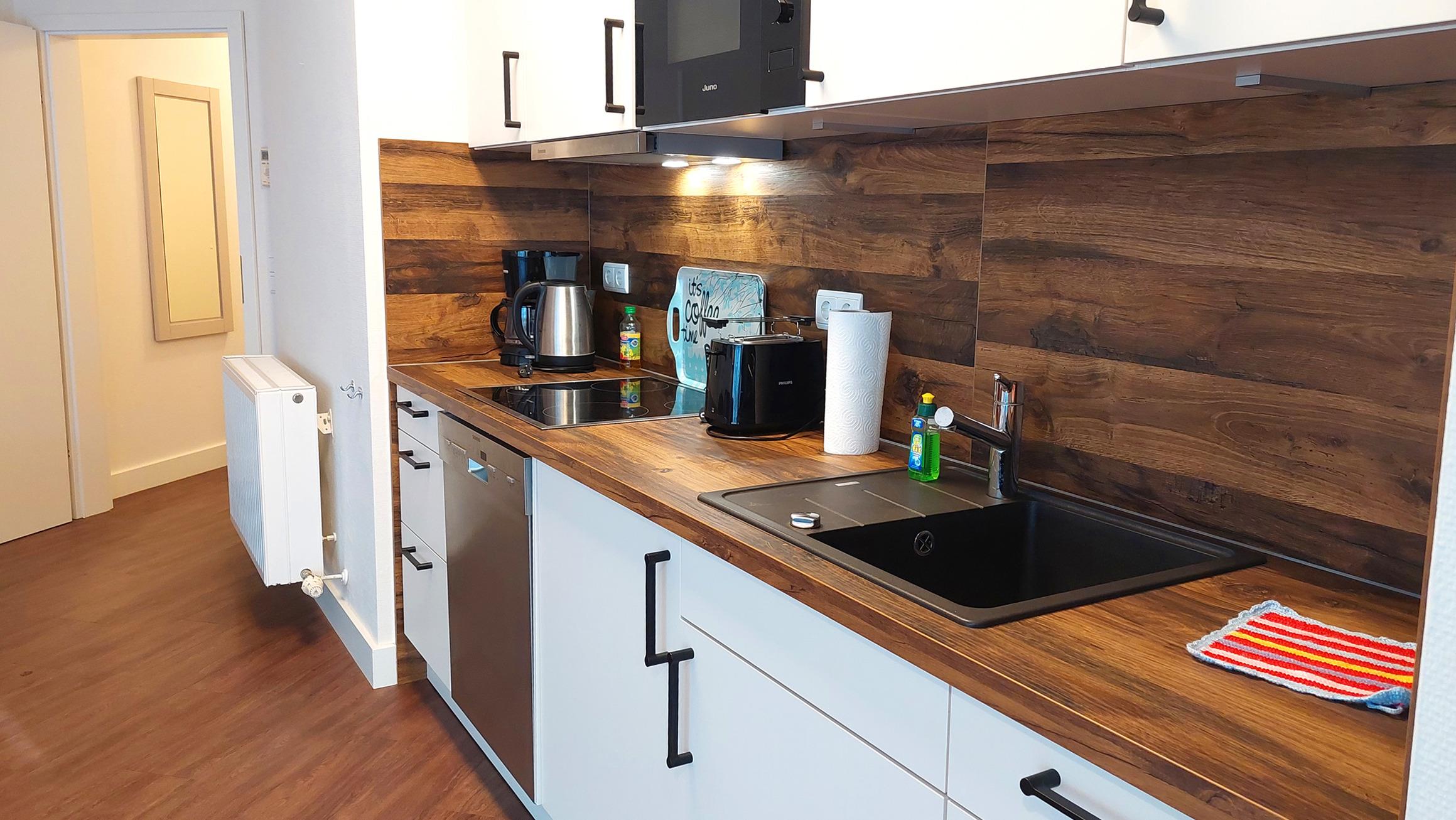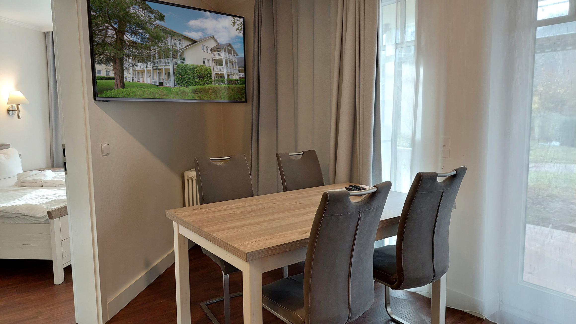 Der Wohn- und Essbereich beherbergt eine moderne Küchenzeile mit Ceran-Kochfeldern, einem Geschirrspüler, einem Kühlschrank mit Gefrierfach, einer Mikrowelle und verschiedenen Küchenutensilien. Der Essbereich bietet Platz für 4 Personen und eine gemütliche Sitzlandschaft lädt zum Verweilen ein. Zur technischen Ausstattung gehören kostenfreies WLAN, ein Smart-TV und eine kleine Musikanlage.