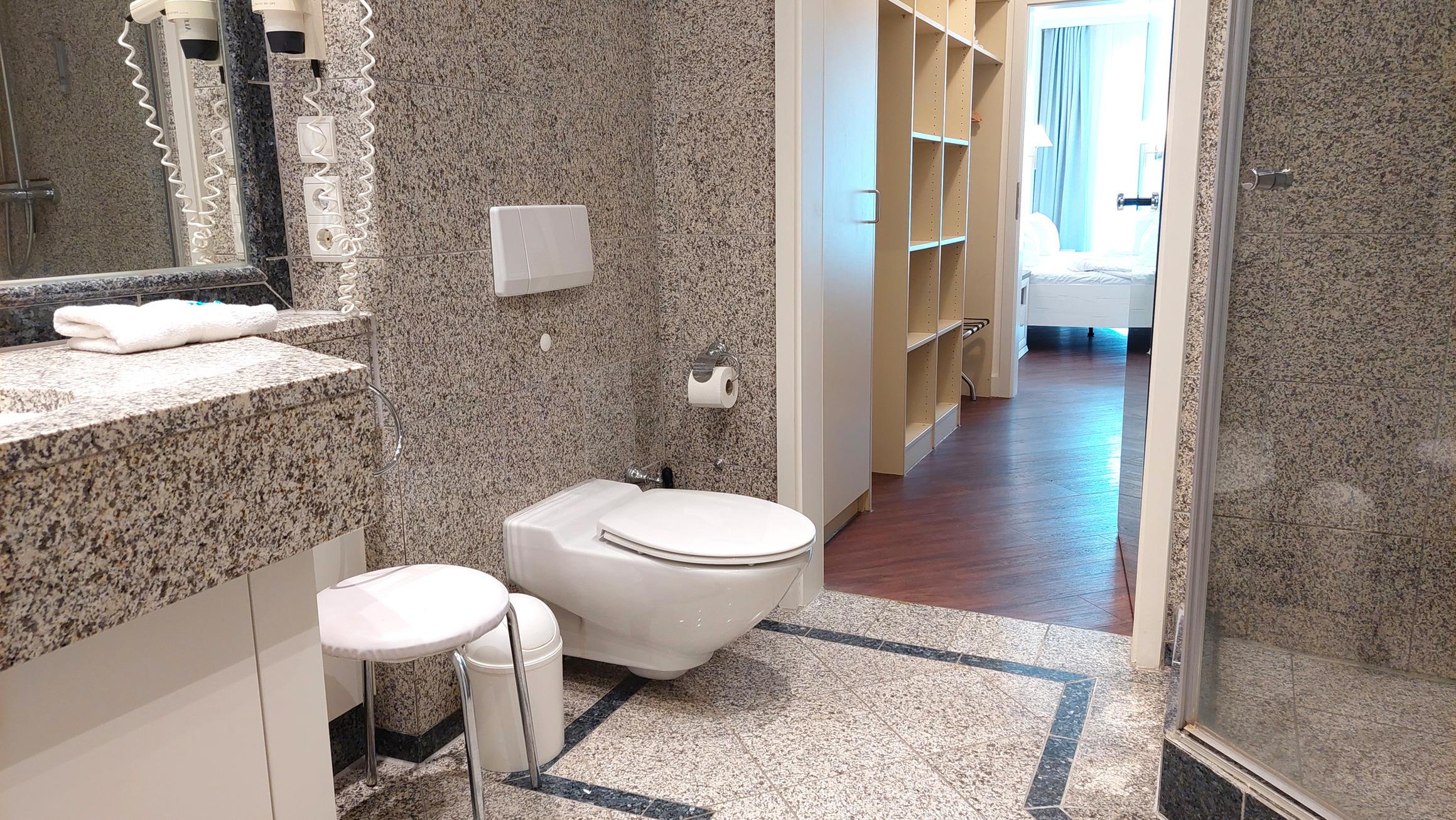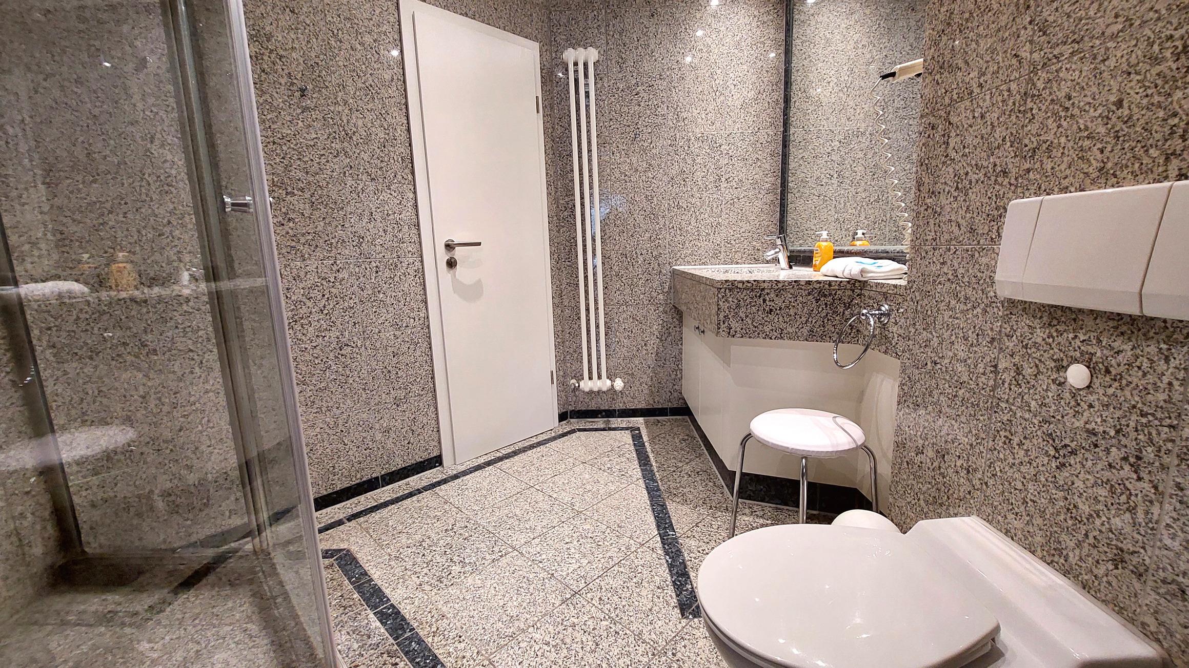 Das Badezimmer ist in Marmoroptik gehalten und verfügt über eine Toilette, einen Waschtisch, eine Dusche, einen Kosmetikspiegel, Fön und Zugang zum Ankleidezimmer mit viel Stauraum.