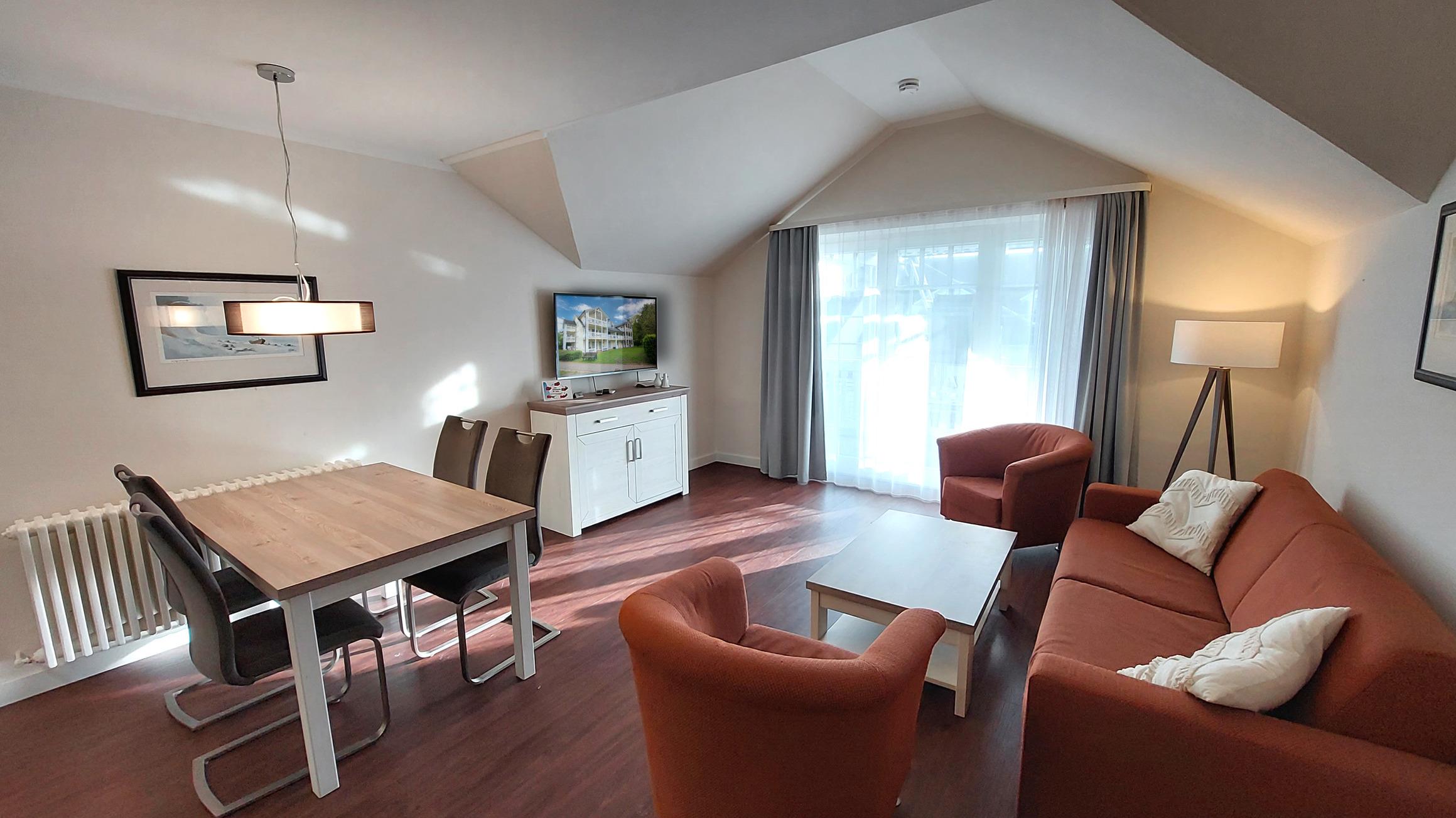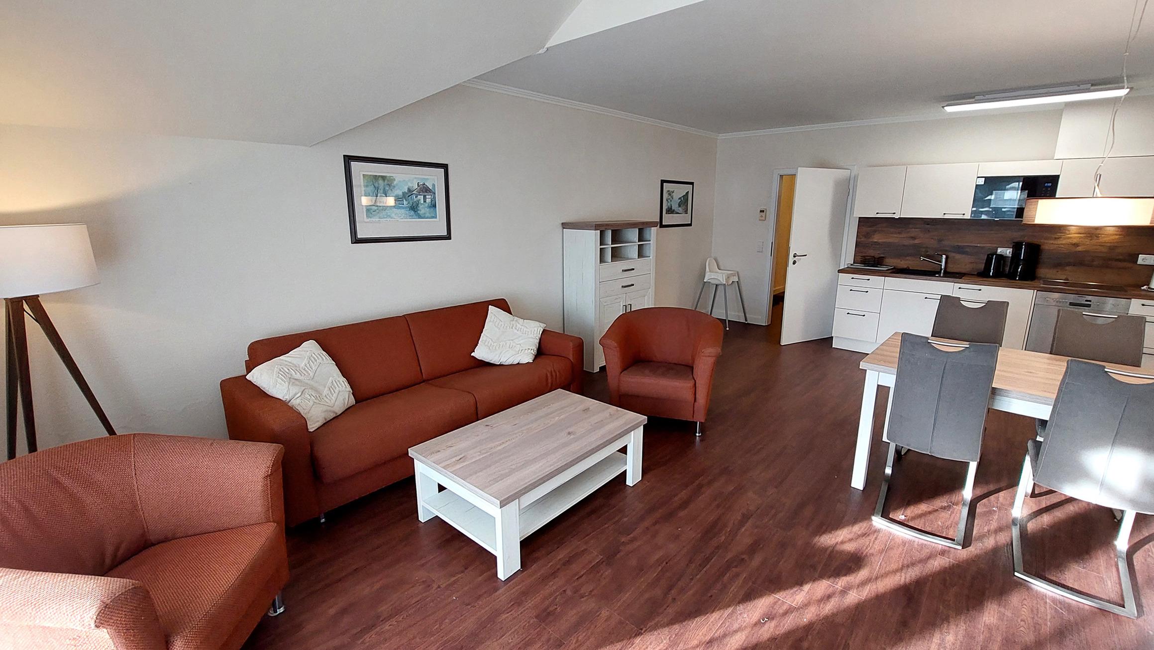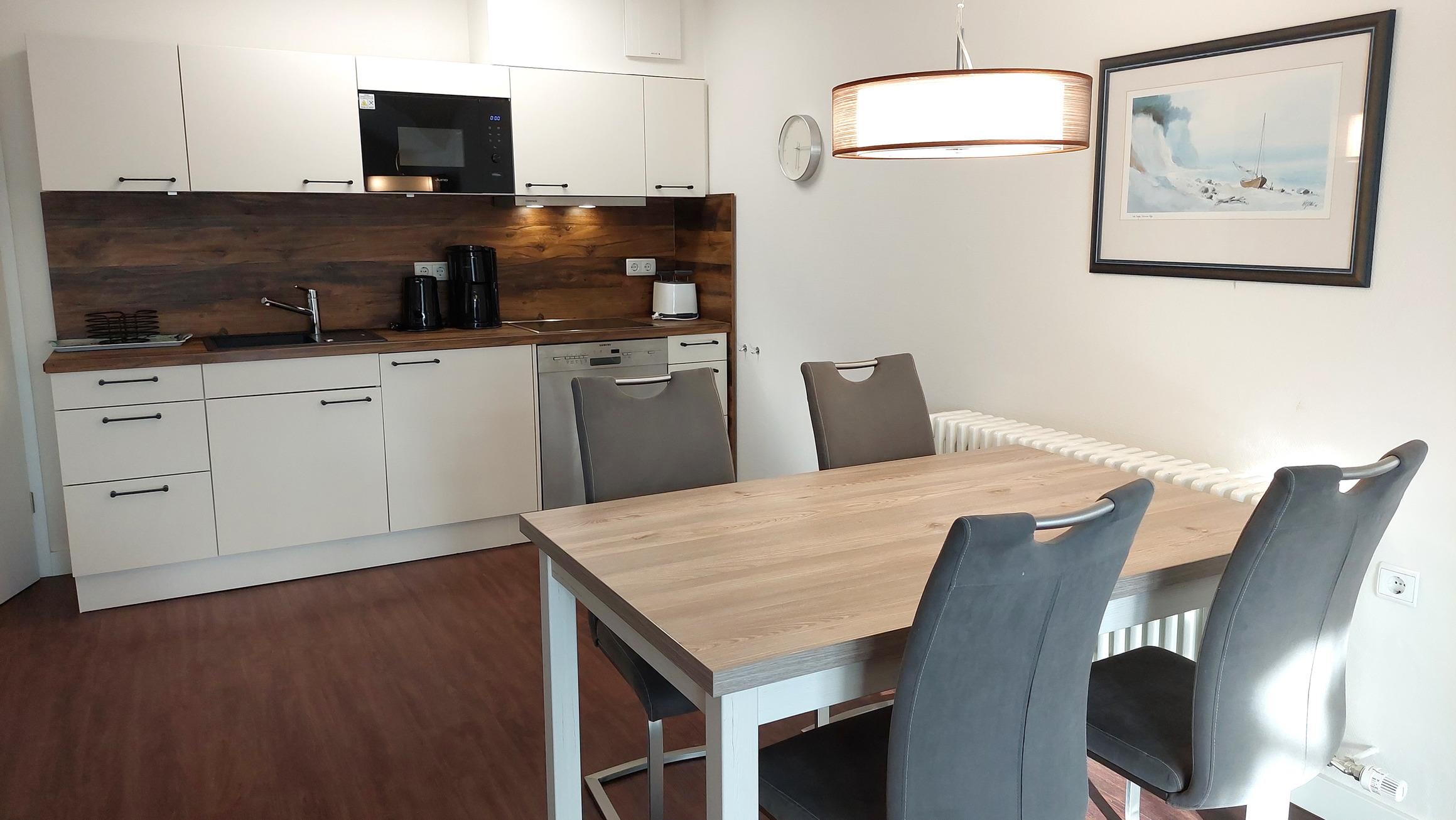 Der Wohn- und Essbereich beherbergt eine moderne Küchenzeile mit Ceran-Kochfeldern, einem Geschirrspüler, einem Kühlschrank mit Gefrierfach, einer Mikrowelle und verschiedenen Küchenutensilien. Der Essbereich bietet sogar Platz für 4 Personen und eine gemütliche Sitzlandschaft lädt zum Verweilen ein. Zur technischen Ausstattung gehören kostenfreies WLAN, ein Smart-TV samt Blu-ray-Player und eine kleine Musikanlage.