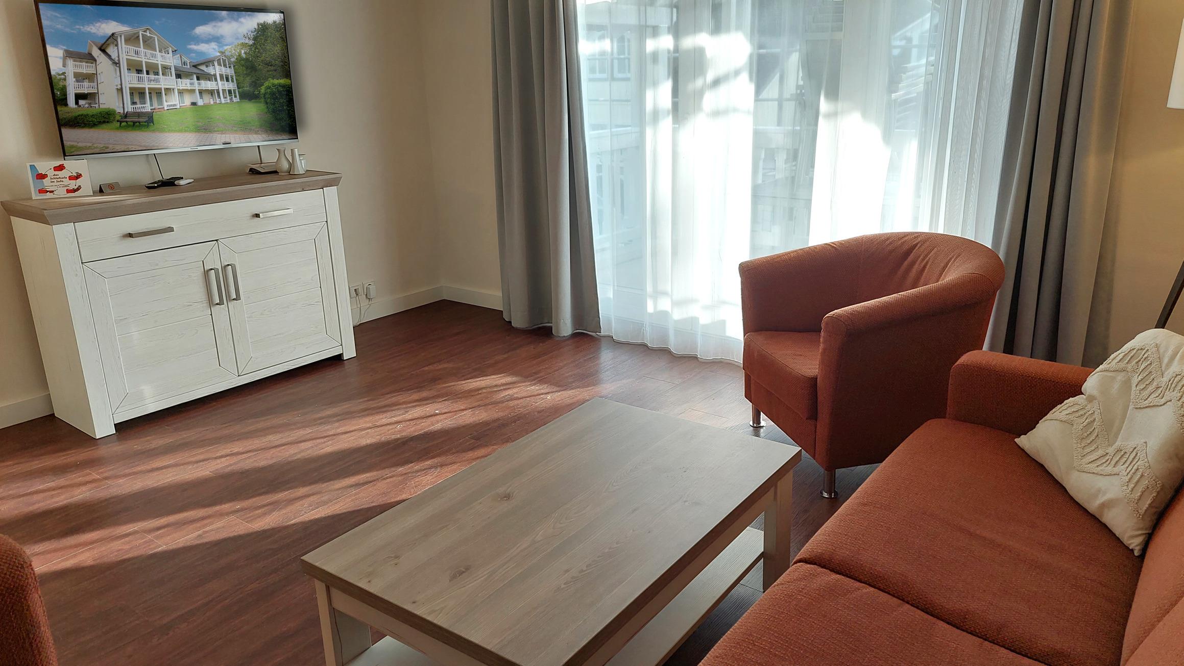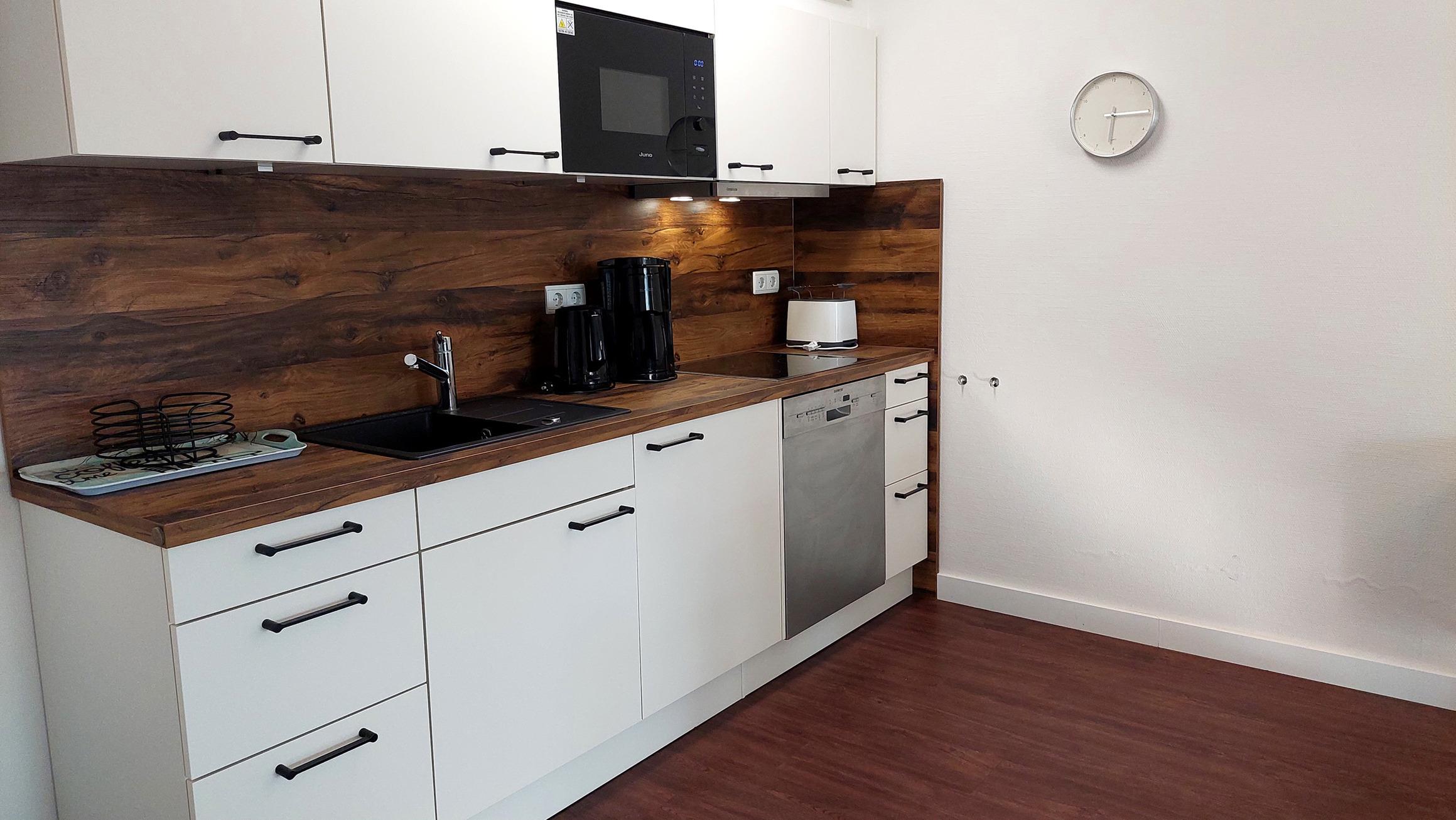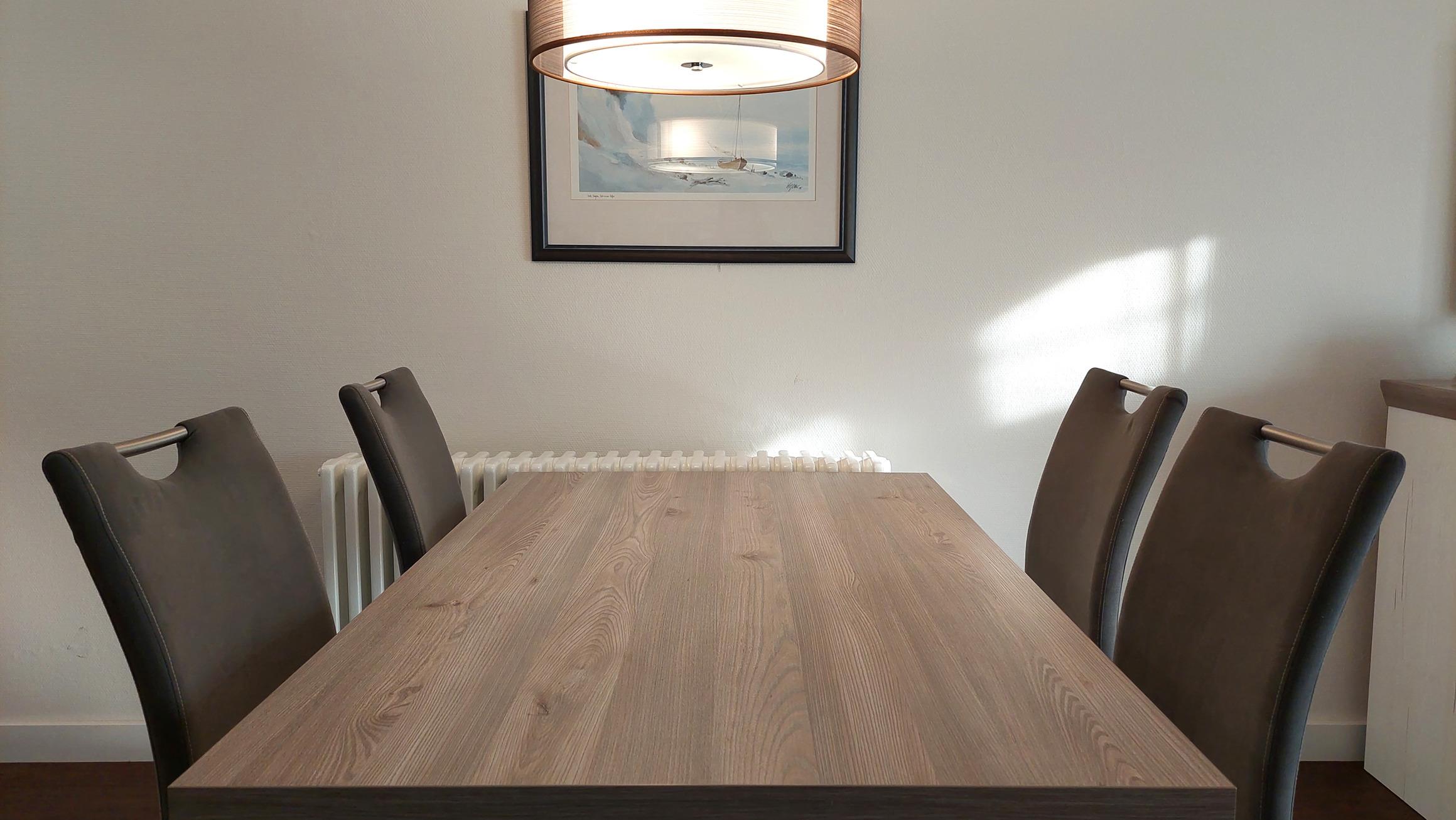 Der Wohn- und Essbereich beherbergt eine moderne Küchenzeile mit Ceran-Kochfeldern, einem Geschirrspüler, einem Kühlschrank mit Gefrierfach, einer Mikrowelle und verschiedenen Küchenutensilien. Der Essbereich bietet sogar Platz für 4 Personen und eine gemütliche Sitzlandschaft lädt zum Verweilen ein. Zur technischen Ausstattung gehören kostenfreies WLAN, ein Smart-TV samt Blu-ray-Player und eine kleine Musikanlage.