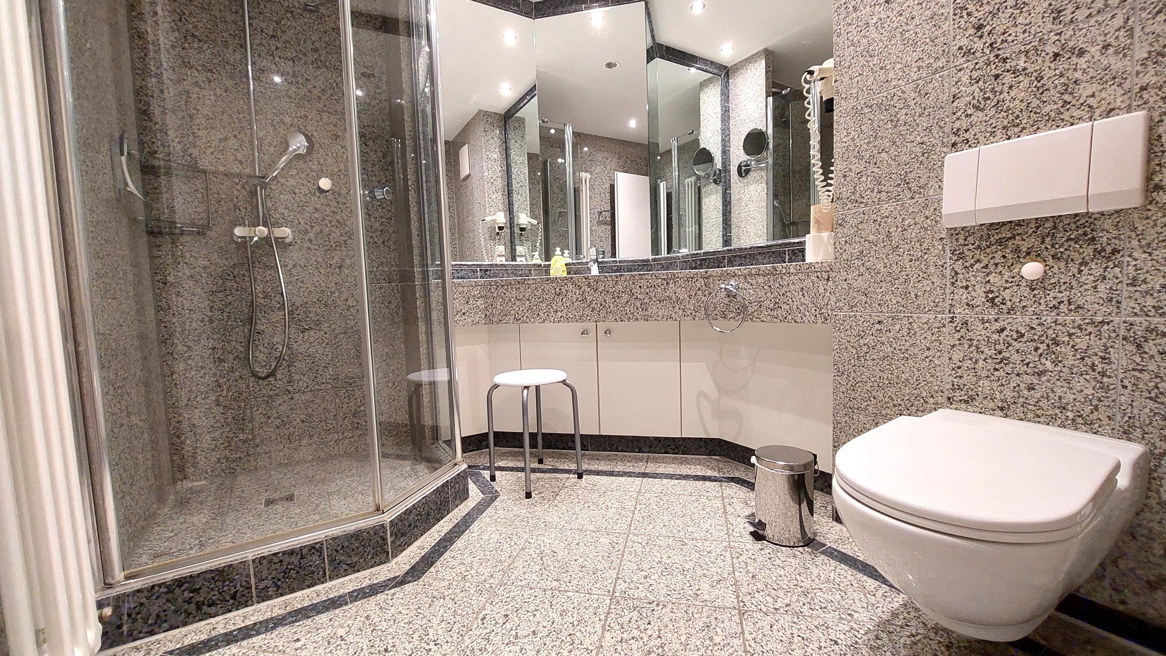 Das Badezimmer ist in Marmoroptik gehalten und verfügt über eine Toilette, einen Waschtisch, eine Dusche, einen Kosmetikspiegel und einen Fön.