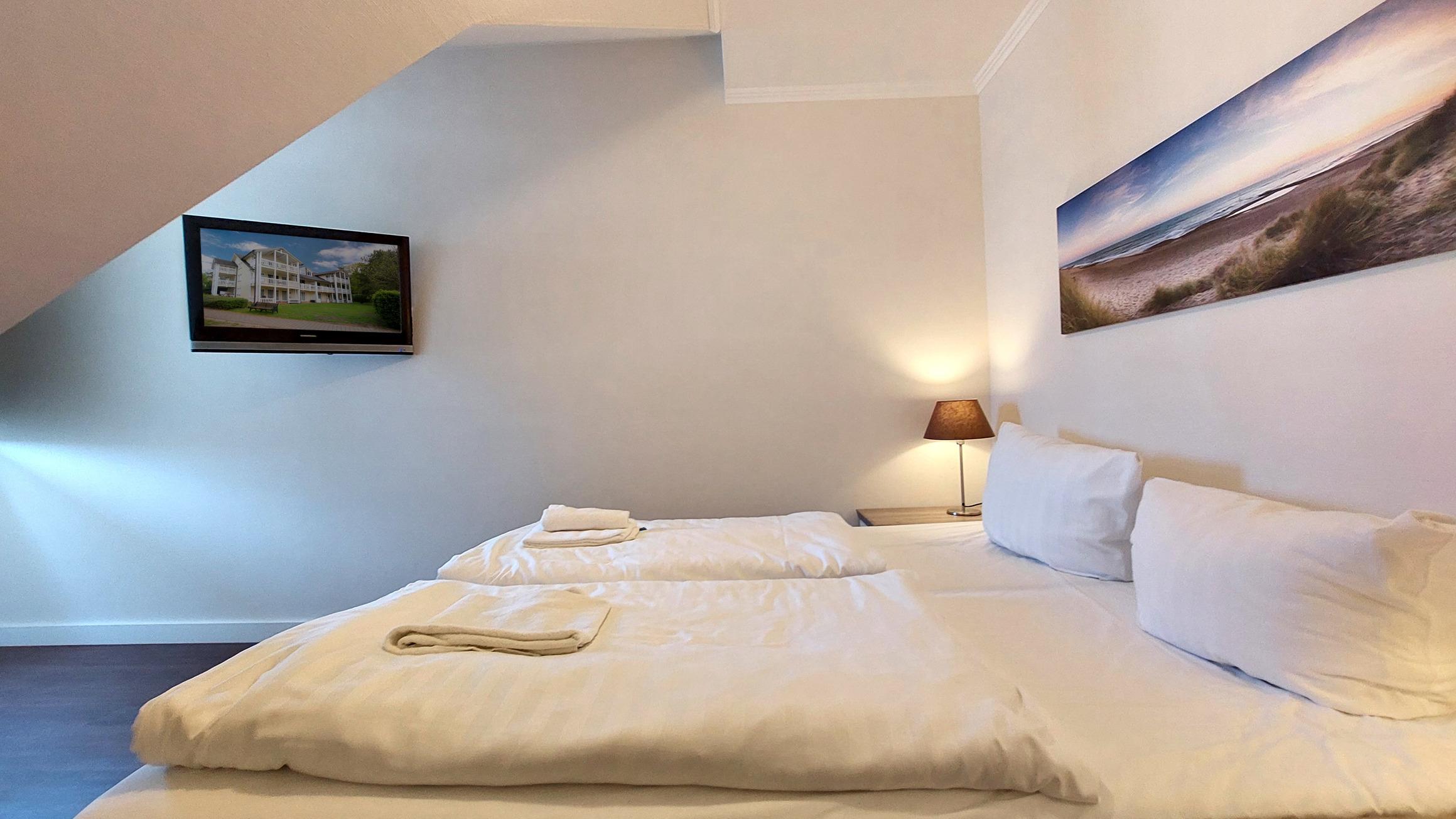 Das Schlafzimmer ist mit einem Doppelbett und einem zusätzlichen TV ausgestattet.