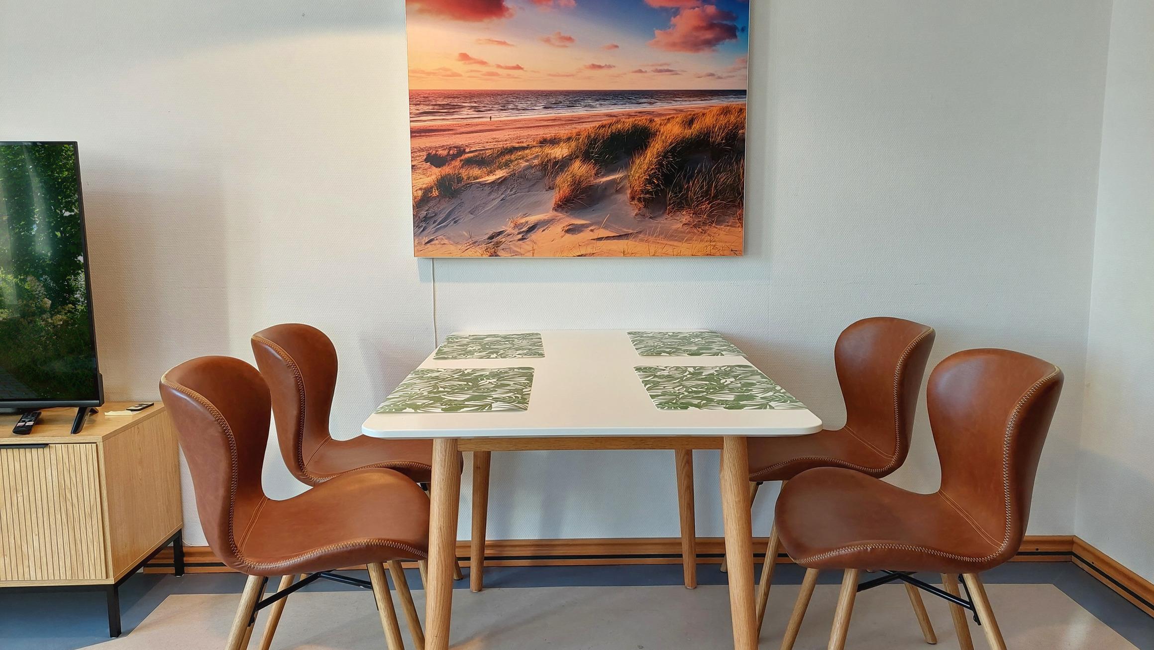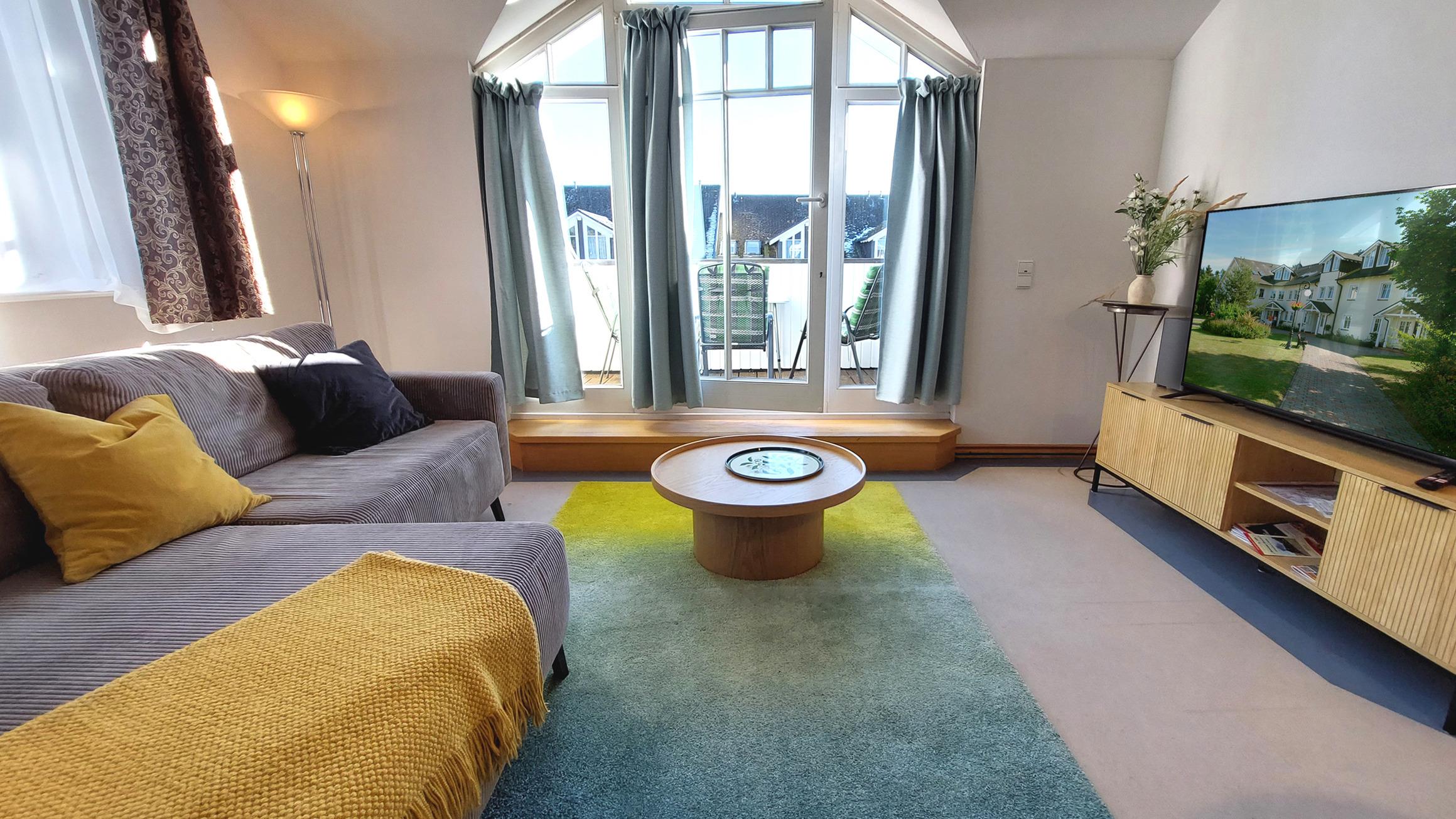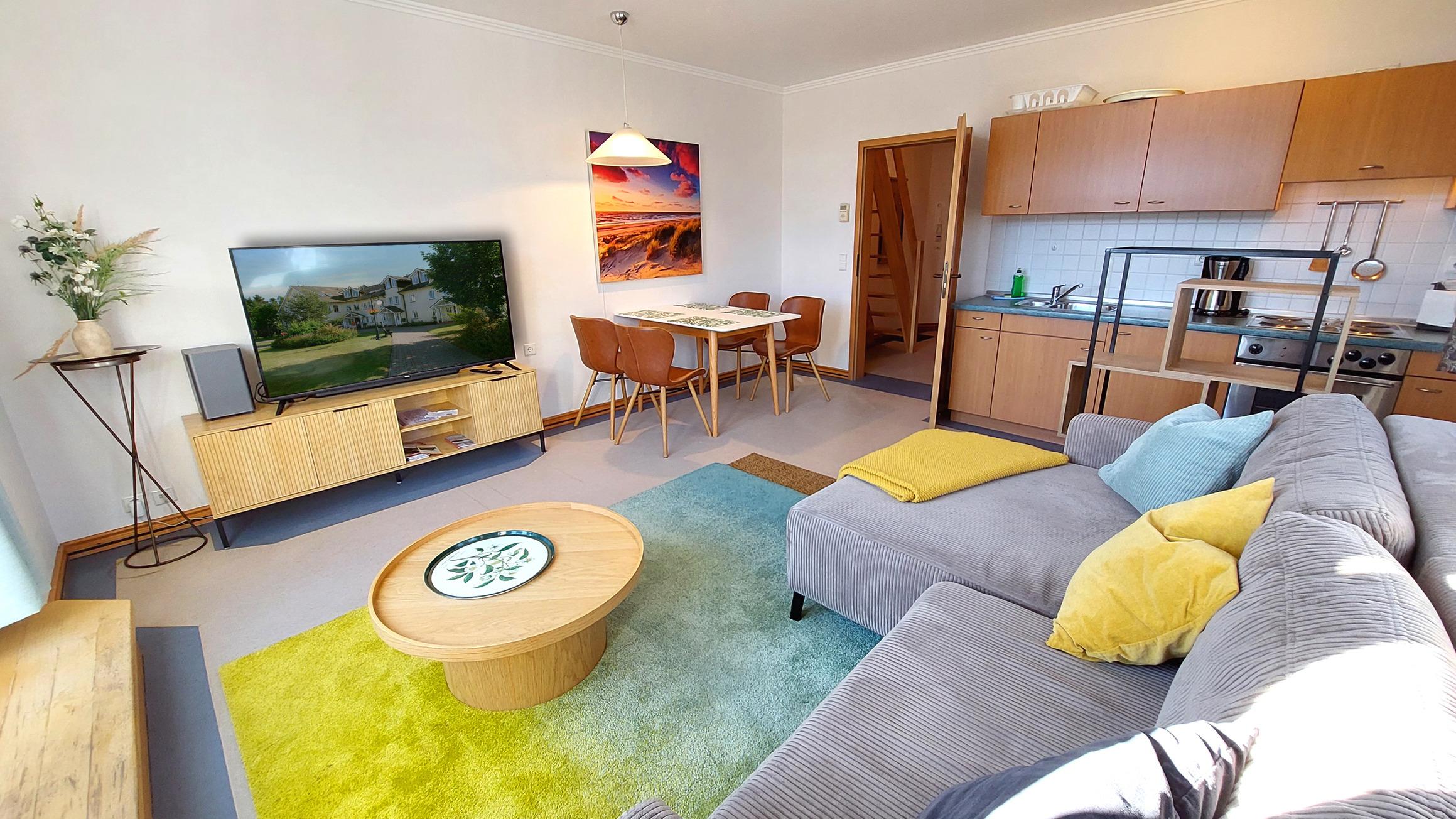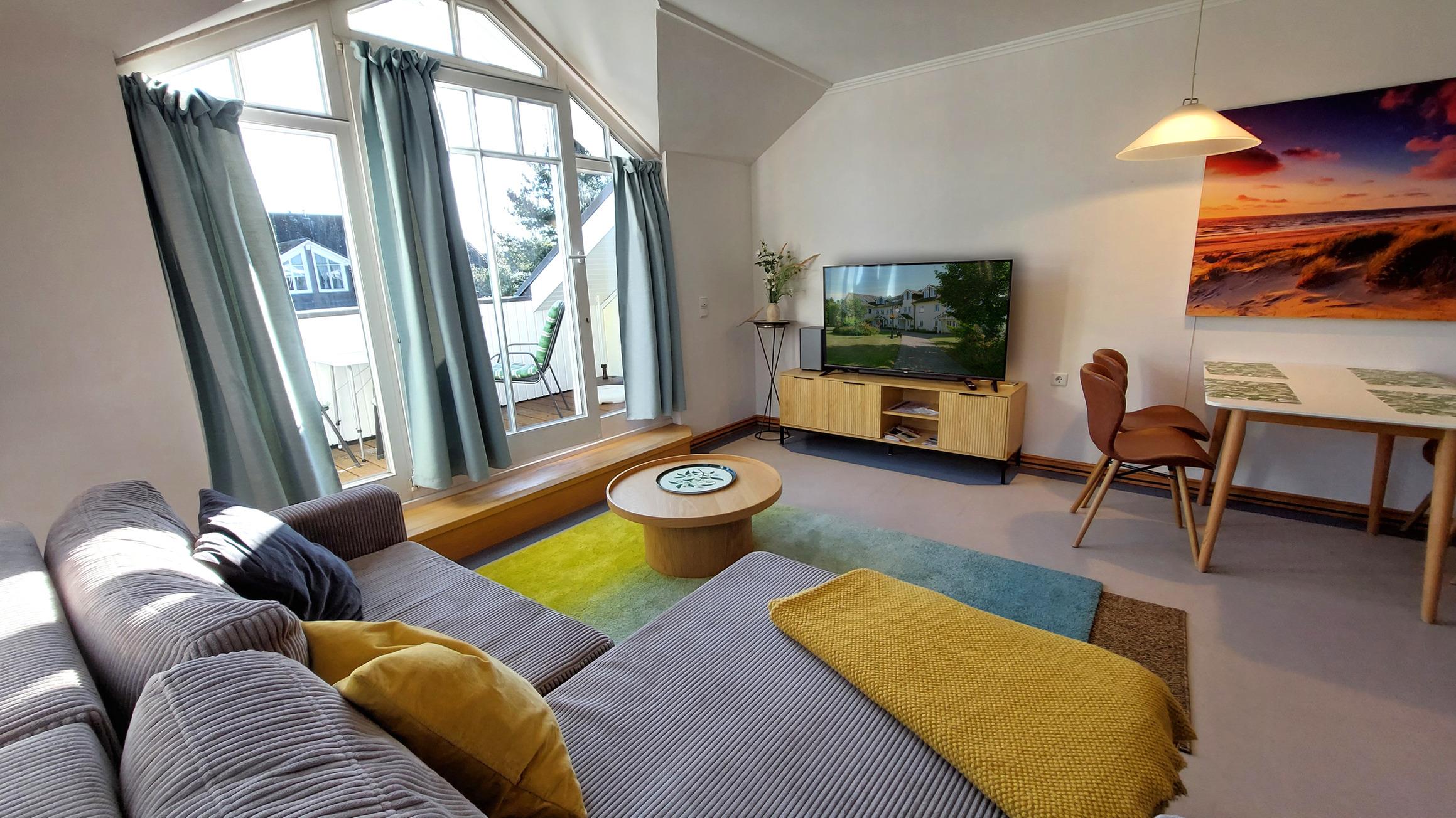Ihre Ferienwohnung 16RB84 befindet sich im 2. Obergeschoss, an der ruhigen, zum Meer gelegenen Seite des Dünenparks. Von hier aus sind es nur 100 Meter zum Strand, wo Sie den Sonnenaufgang genießen können. Die 2 Zimmer - Wohnung hat eine Größe von ca. 50 qm und ist mit bis zu 4 Personen belegbar. Der Wohnraum teilt sich auf in eine Küchenzeile mit Essplatz sowie den Wohnbereich mit Smart-TV. Die Liegefläche des Schlafsofas beträgt 1,40 x 2m. Vom Wohnraum gelangen Sie auf den Südbalkon, der für 4 Personen Platz bietet. Das Schlafzimmer ist mit einem Doppelbett und einem großen Kleiderschrank ausgestattet. Es ist nach Osten ausgerichtet, sodass Sie von der Morgensonne begrüßt werden. Das Badezimmer hat ein Fenster, ist mit einer Fußbodenheizung versehen und exklusiv mit Granit gefliest. Ein eigener PKW-Stellplatz steht Ihnen in der Tiefgarage am Haus kostenfrei zur Verfügung, ebenso ein schneller Internetzugang. Im Dünenpark gibt es einen Bäcker mit Cafe sowie einen Frühstücksraum mit leckerem Buffet. Die Bushaltestelle befindet sich vor der Rezeption. Zum nächsten Supermarkt sind es 500m. Im nächstgelegenen Hotel Binz Therme steht Ihnen Gebühr der Wellness/ Saunabereich zur Verfügung (je nach Auslastung)