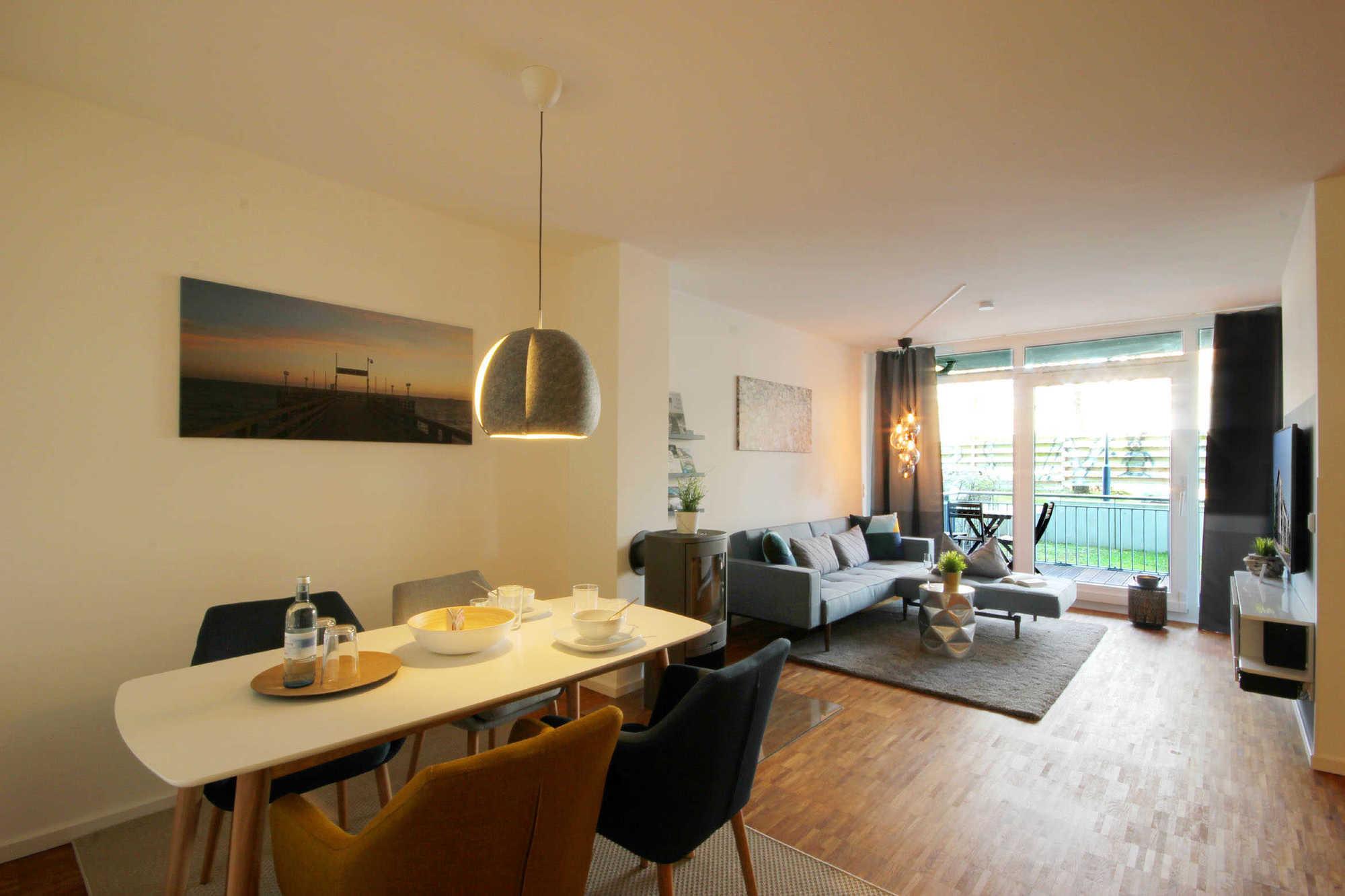 Die Wohnung verfügt über einen Flur mit Garderobe sowie Wandspiegel, einen gemütlichen Wohnbereich mit moderner Wohnküche sowie einen Essplatz, ein schickes Schlafzimmer sowie Badezimmer. Im Wohnbereich erwartet Sie eine bequeme Sitzecke mit Schlaffunktion sowie Verdunklungsstoffen für einen erholsamen Schlaf. Der Kaminofen sorgt für gemütliche Stunden. Darüber hinaus gelangen Sie vom Wohnzimmer auf die möblierte Terrasse. Die technische Einrichtung umfasst einen großen Flachbildfernseher, eine Musikanlage sowie einen gebührenfreien WLAN-Zugang. In der komplett ausgestatteten Küchenzeile erwartet Sie unter anderem ein Backofen, Mikrowelle, Cerankochfeld, Geschirrspüler, Kühlschrank mit Gefrierfach, Kapselmaschine von Nespresso, Toaster, Wasserkocher sowie umfangreiches Kücheninventar. Das Schlafzimmer verfügt über ein modernes Boxspringbett, einen weiteren Flachbildfernseher, einen Kleiderschrank sowie Verdunklungsstoffe für eine erholsame Nachtruhe. Ein separater Abstellschrank bietet zusätzlichen Stauraum für Koffer sowie Strandutensilien. Das Bad ist mit ebenerdiger Dusche, Waschbecken, Fön, Waschmaschine und WC ausgestattet.