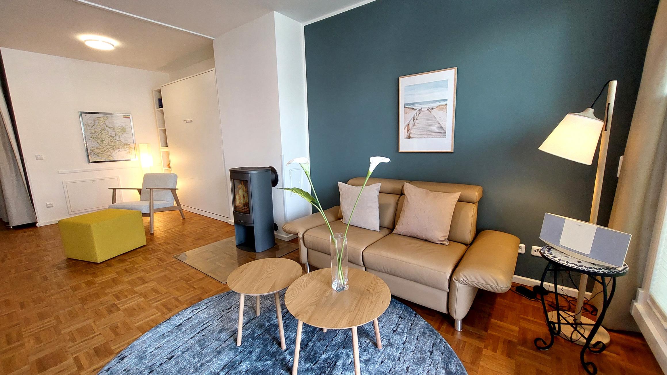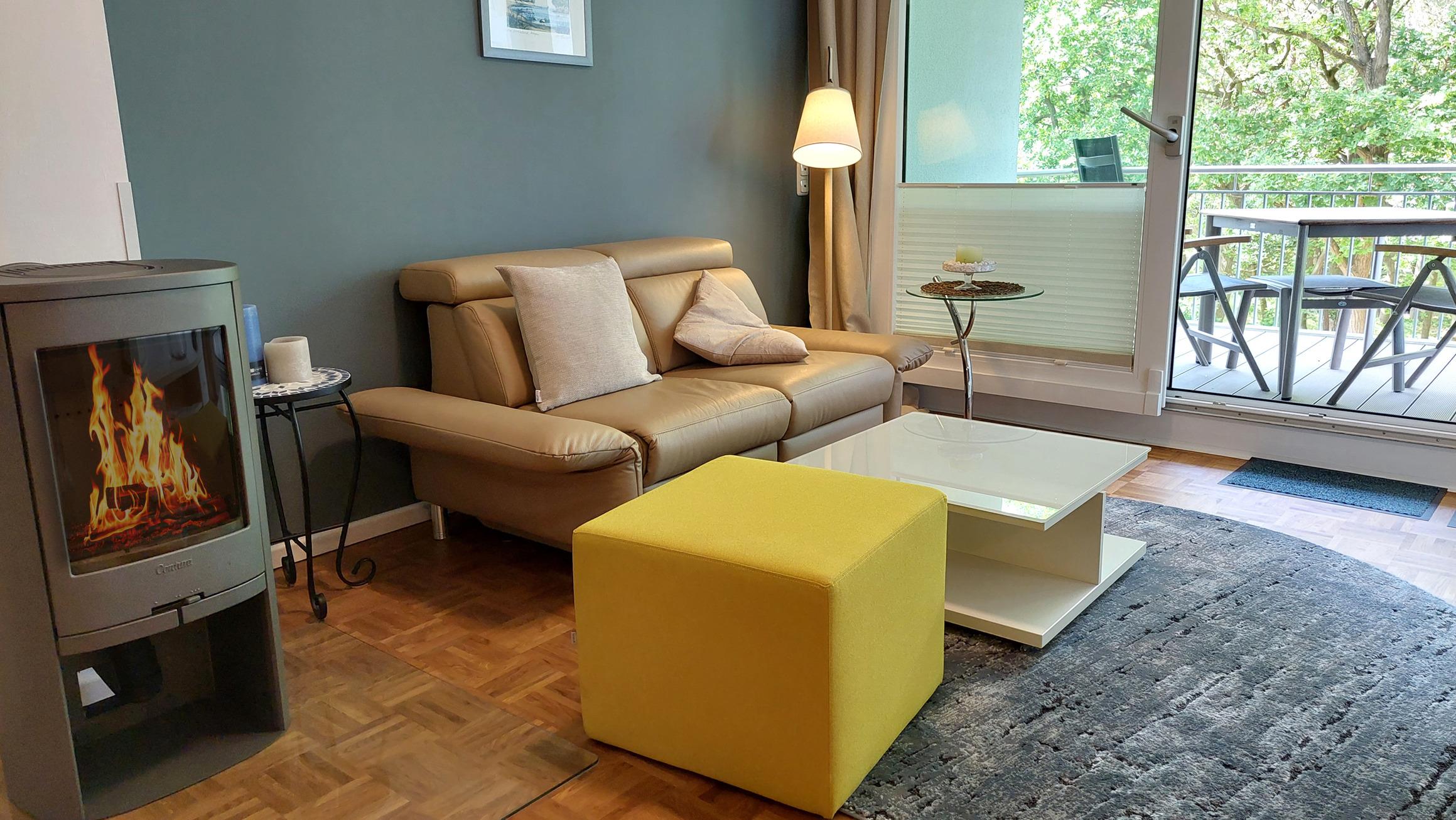 Im Wohnbereich befindet sich ein gemütlichen Sofa. Zusätzlich sorgen Flachbild-TV. Stereoanlage und Kamin auch in der kalten Jahreszeit für einen tollen Urlaub.