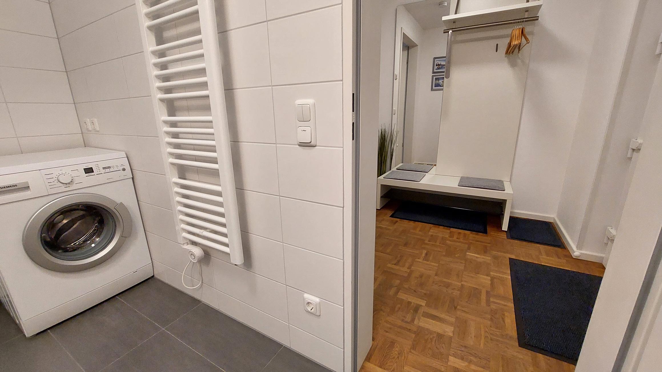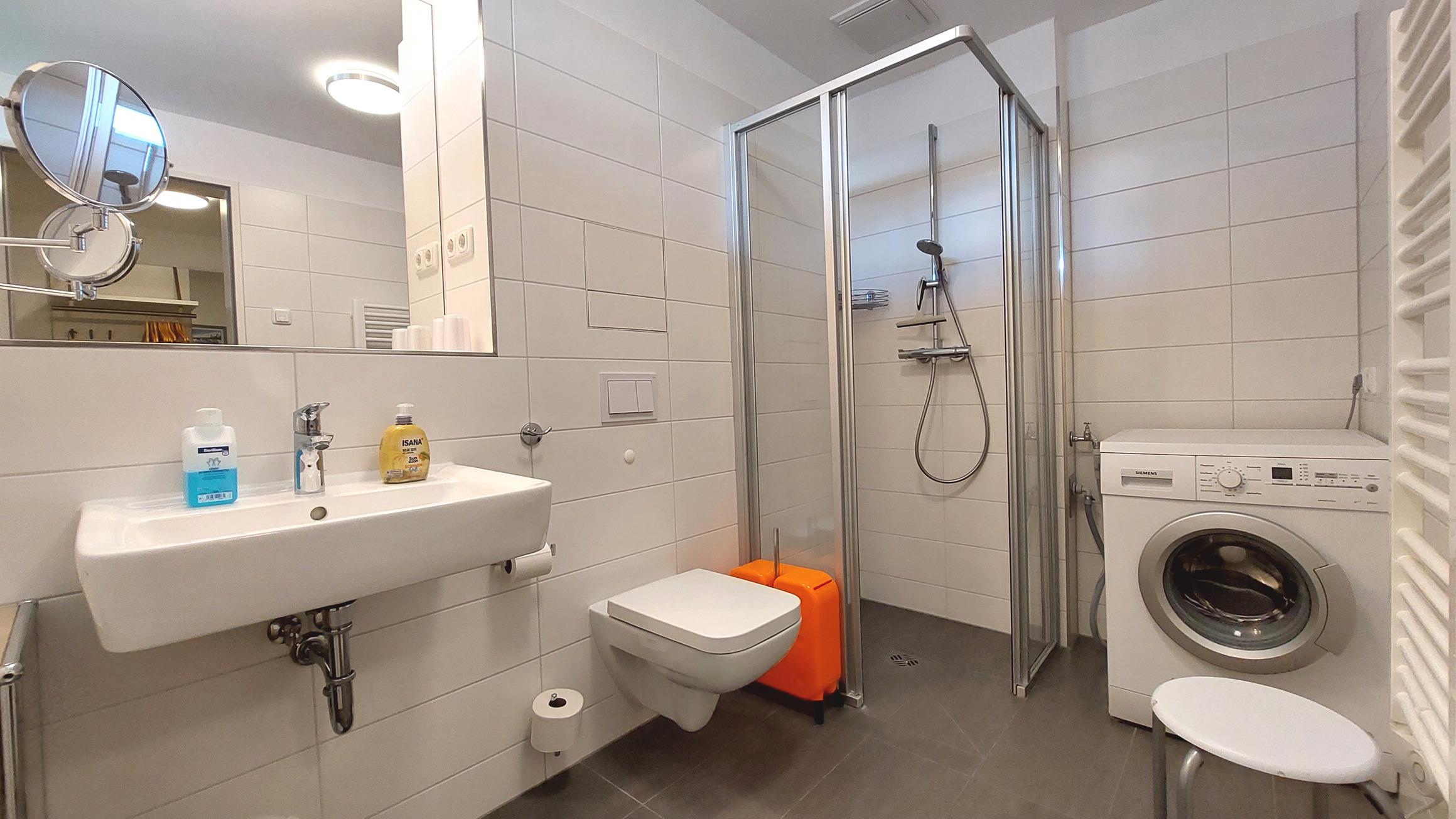 Das Badezimmer verfügt über eine ebenerdige Dusche, WC und eine eigene Waschmaschine.