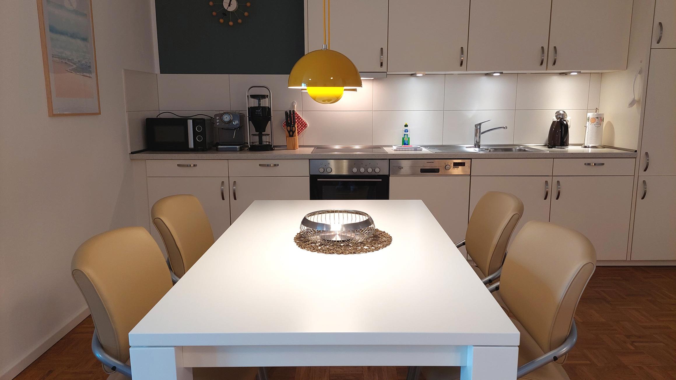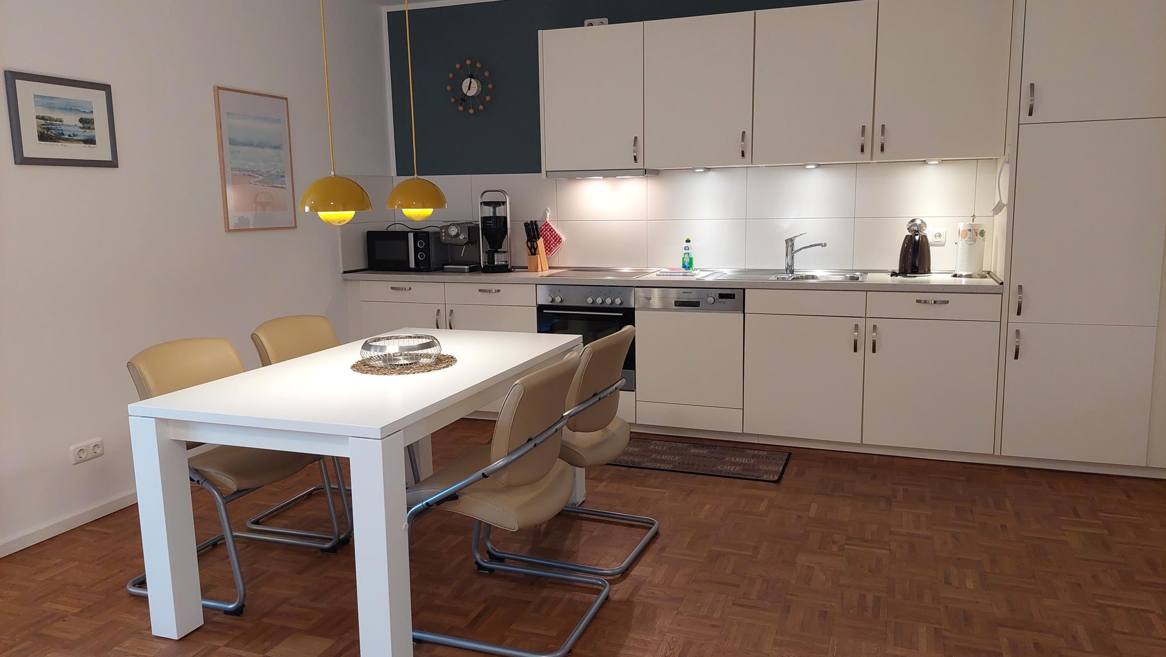 Der geräumige Küchenbereich umfasst eine modernen Kochzeile, ein Esstisch samt 4 Plätzen und bietet Zugang zur Abstellkammer mit viel Stauraum,