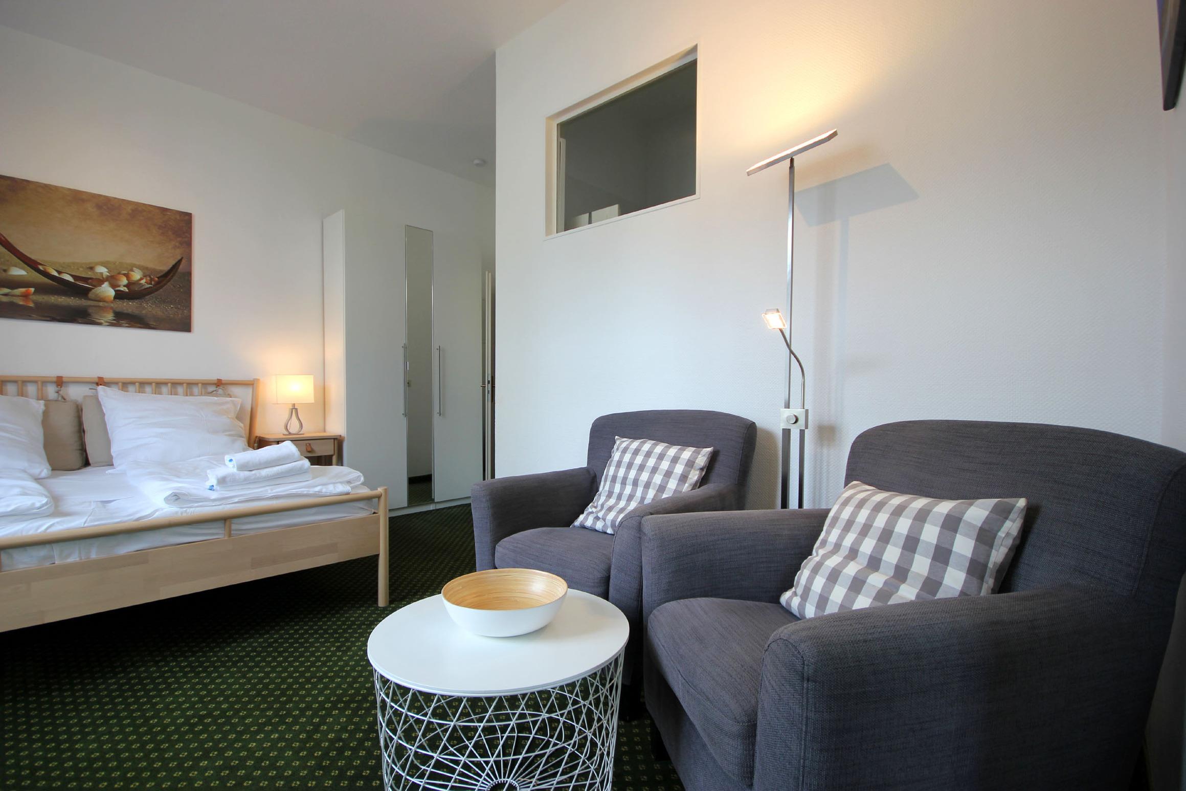 Diese freundliche Wohnung ist aufgeteilt in einen kombiniertem Wohn- und Schlafbereich, einer separaten Küche sowie ein modernes Duschbad mit Waschtisch und WC. Der Schlaf- und Wohnraum begrüßt Sie mit einem Flachbild-TV, zwei gemütlichen Sesseln, einem Doppelbett (1,60m x 2m) sowie einem Kleiderschrank. Die neuwertige Küchenzeile ist mit Kühlschrank mit kleinem Gefrierfach, Cerankochfeld, Nespresso-Maschine, Backofen, Geschirrspüler, Kaffeemaschine, Wasserkocher und Toaster komplett ausgestattet. Vom Essplatz genießen Sie einen schönen Blick bis zur Strandpromenade. Highlights: Kostenfreies WLAN sowie ein wohnungseigener PKW-Stellplatz direkt am Haus. Haustiere sind herzlich willkommen.