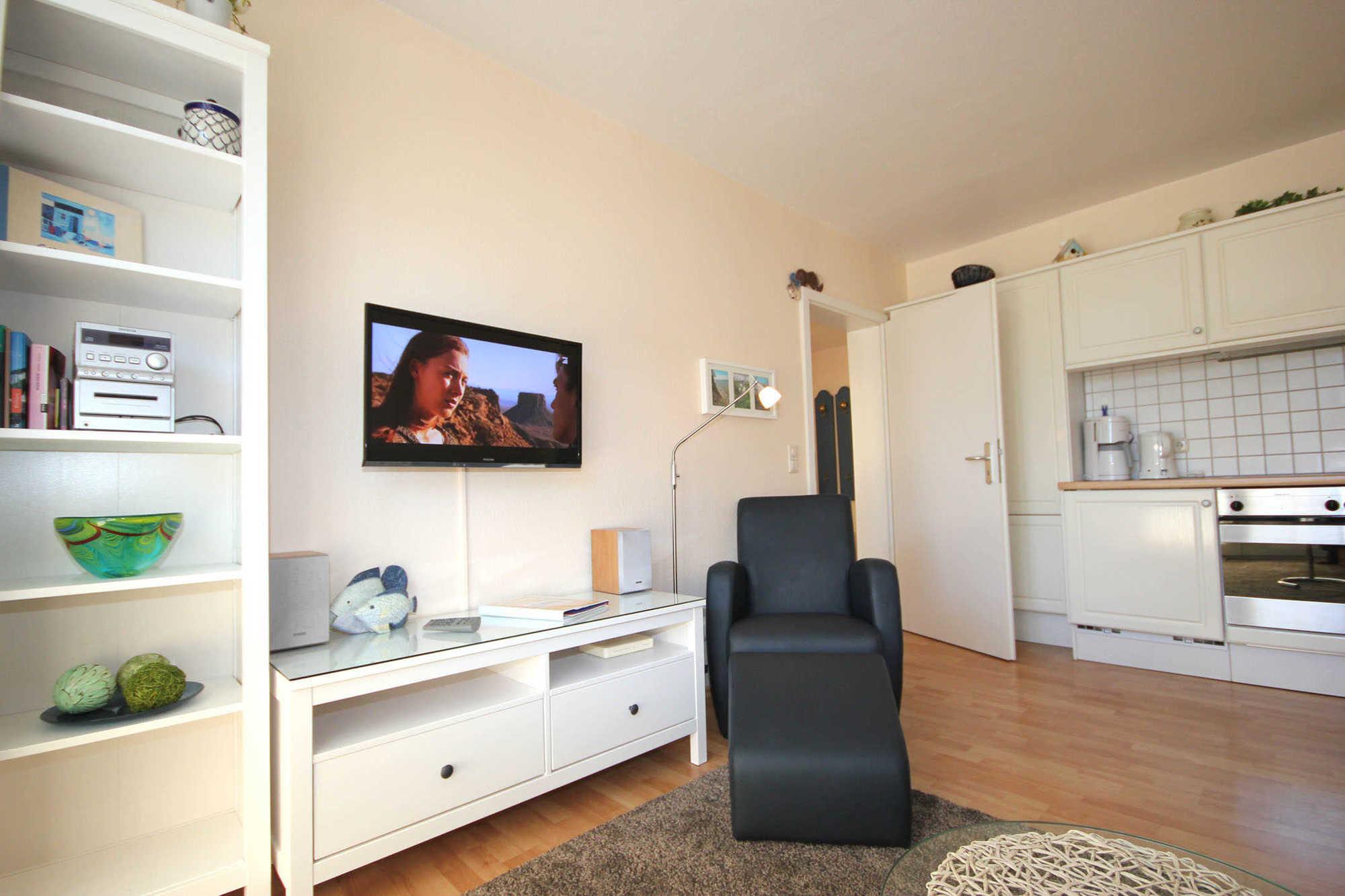Dem hellen Wohnraum schließt sich die weiße Wohnküche und der Balkon an. Im separaten Schlafraum finden Sie ein Doppelbett und einen Kleiderschrank. Vom vorgelagerten Flur aus erreichen Sie das geräumige Duschbad mit Kosmetikspiegel und Fön. Im Wohnraum gibt es einen Essbereich und eine gemütliche Sitzecke mit Schlaffunktion sowie ein Flachbildfernseher und [nbsp]eine Musikanlage mit CD-Player. Die Küche verfügt über einen Backofen, eine Mikrowelle, Kühlschrank, Geschirrspüler, Kaffeemaschine, Toaster und Wasserkocher.