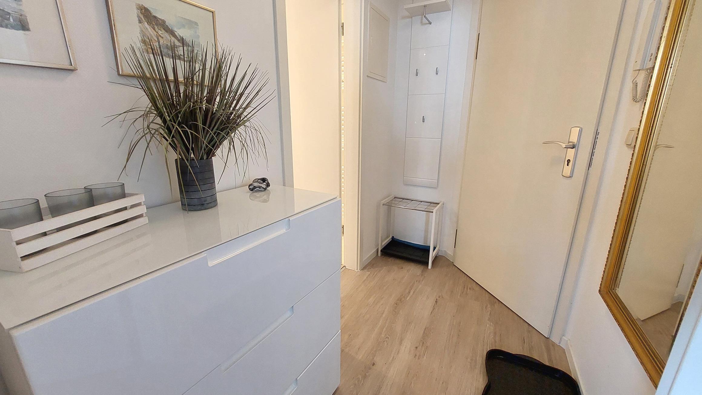Vom Flurbereich samt Garderobe und Spiegel gelangt man ins Bad, ins Schlafzimmer und in den kombinierten Wohn- und Essbereich.