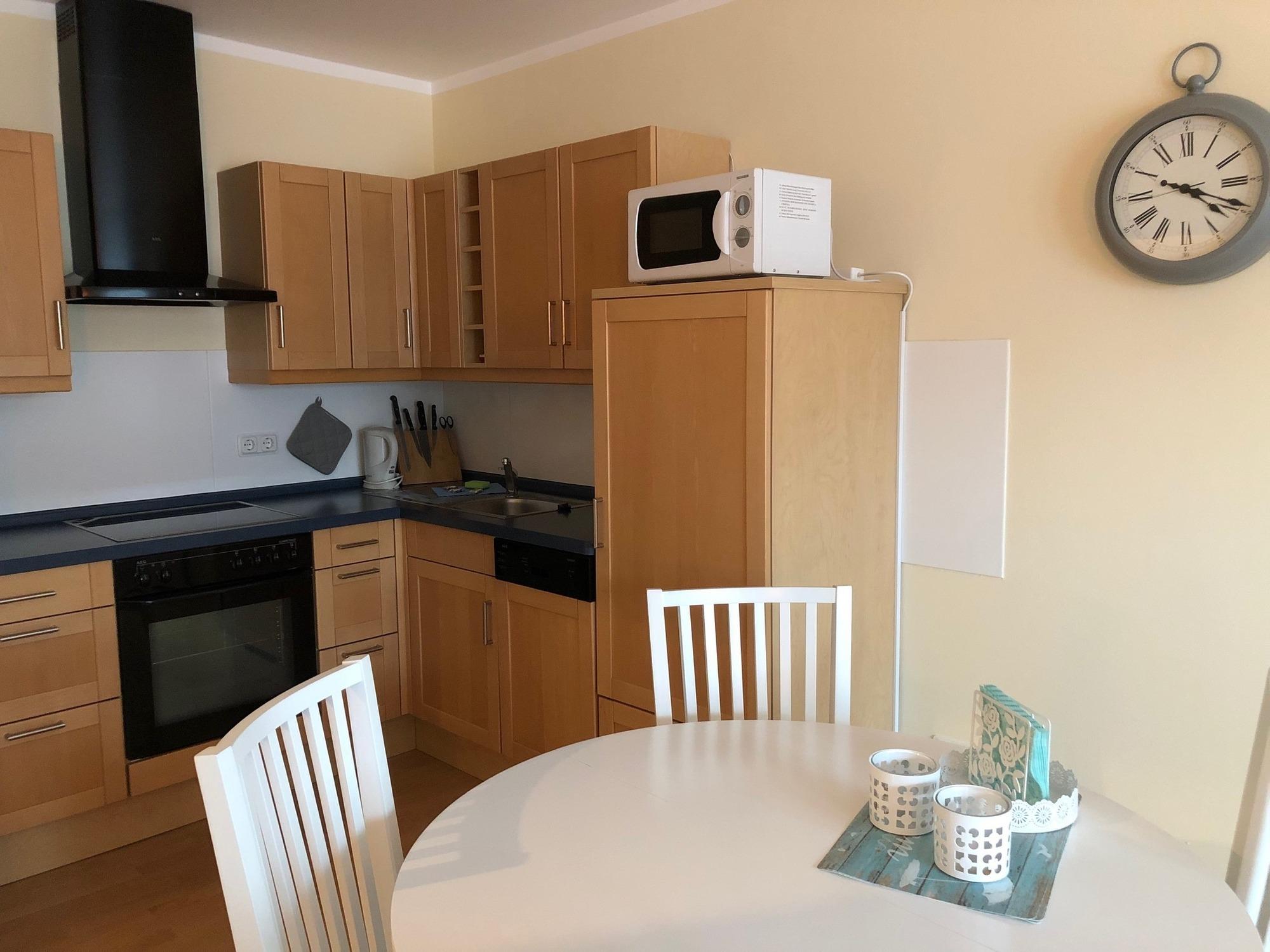 vollwertig ausgestattete Küche (Cerankochfeld, Backofen, Kühlschrank mit Gefrierfach, Geschirrspülmaschine, Mikrowelle, Kaffeemaschine, Wasserkocher, Toaster etc.)