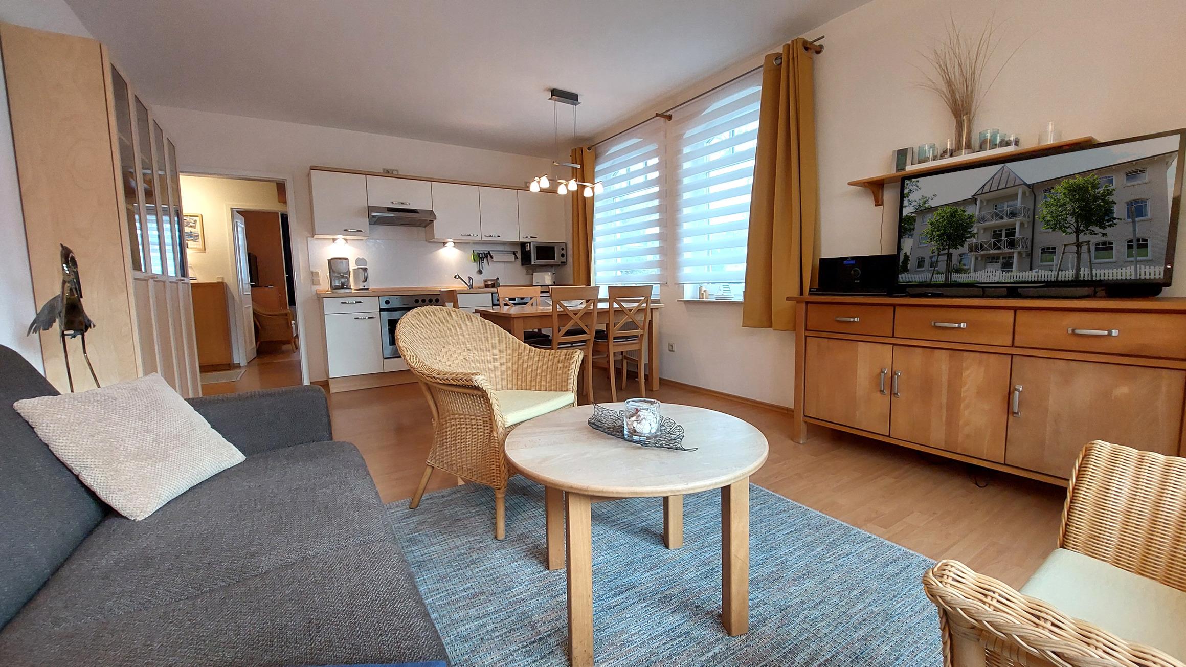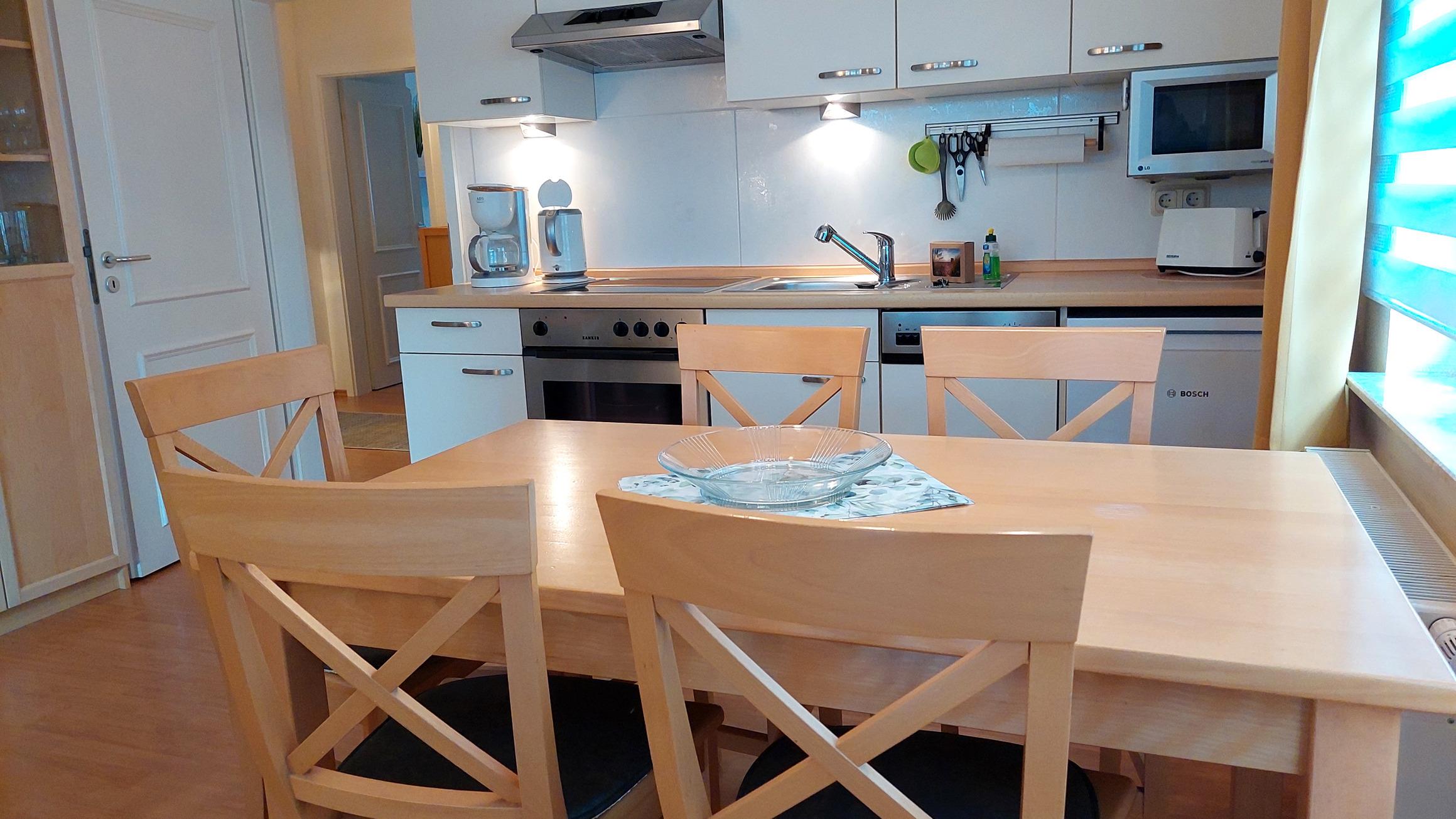 Im großzügigem Wohnbereich befindet sich eine moderne Küchenzeile samt Esstisch für bis zu 5 Personen.