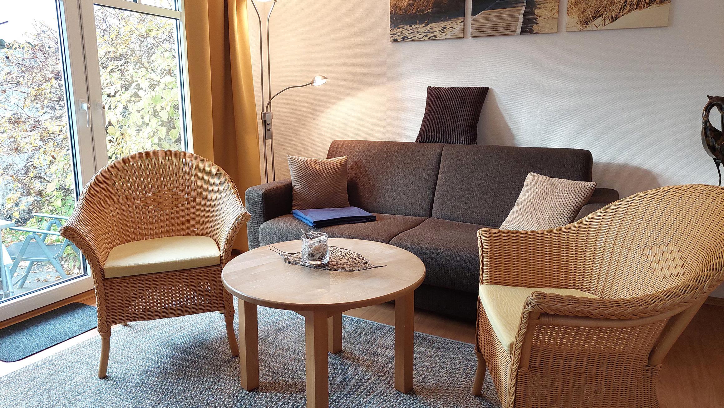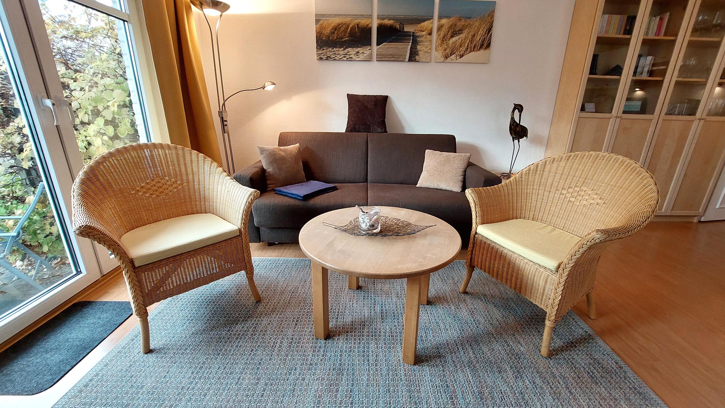 Die gemütliche Sitzlandschaft samt 2 Korbsesseln läd zum Verweilen ein.