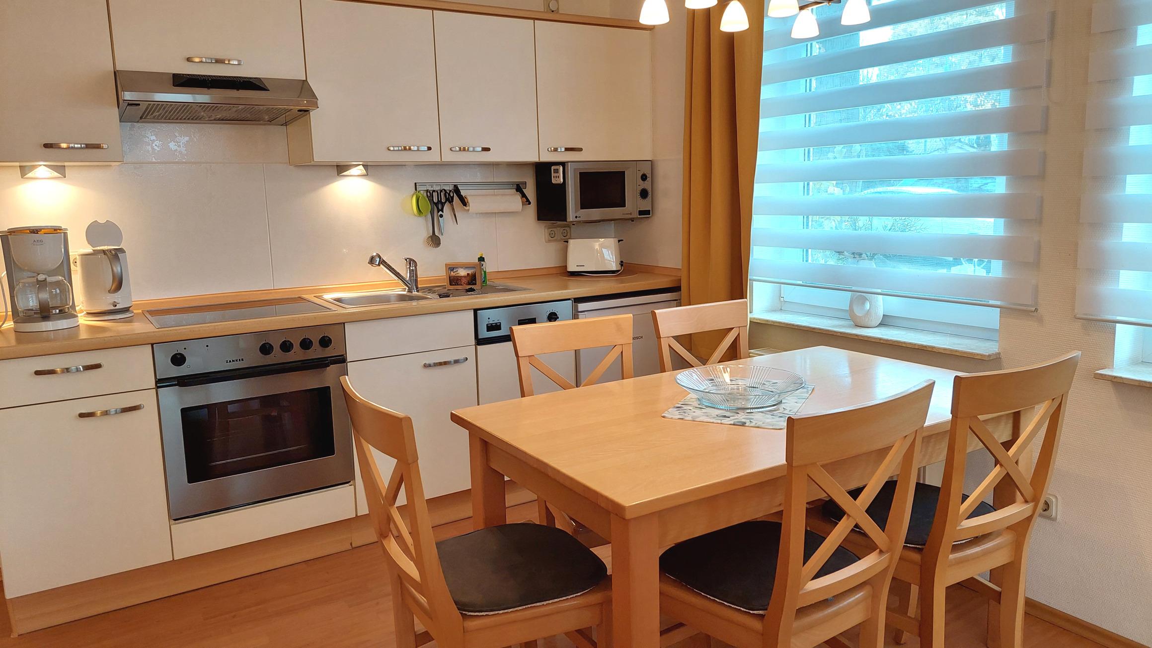 Mit Backofen, Ceranfeld, Kühlschrank, Geschirrspüler und Mikrowelle steht alles zur Verfügung um sich auch im Urlaub selbst zu verpflegen.