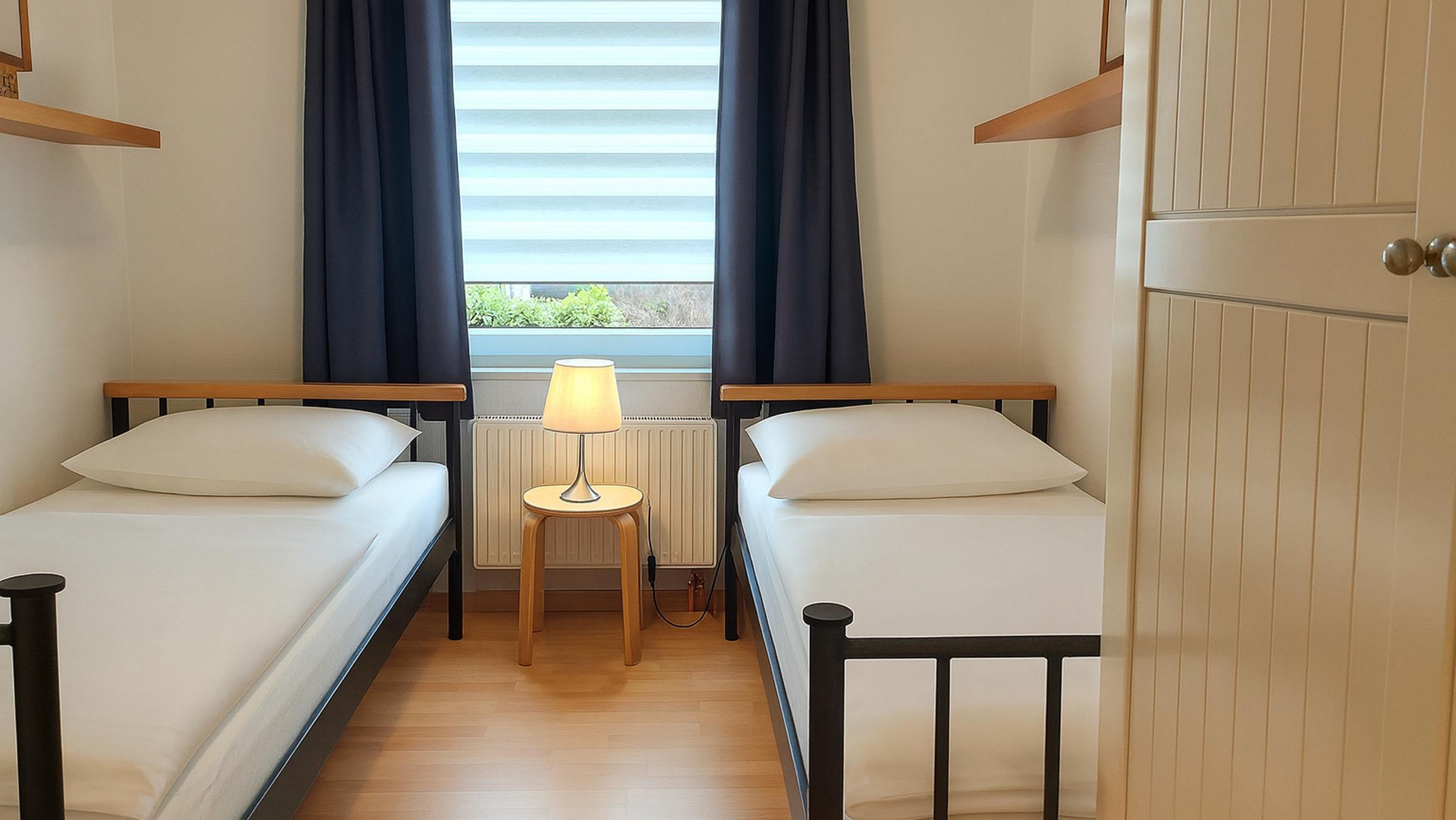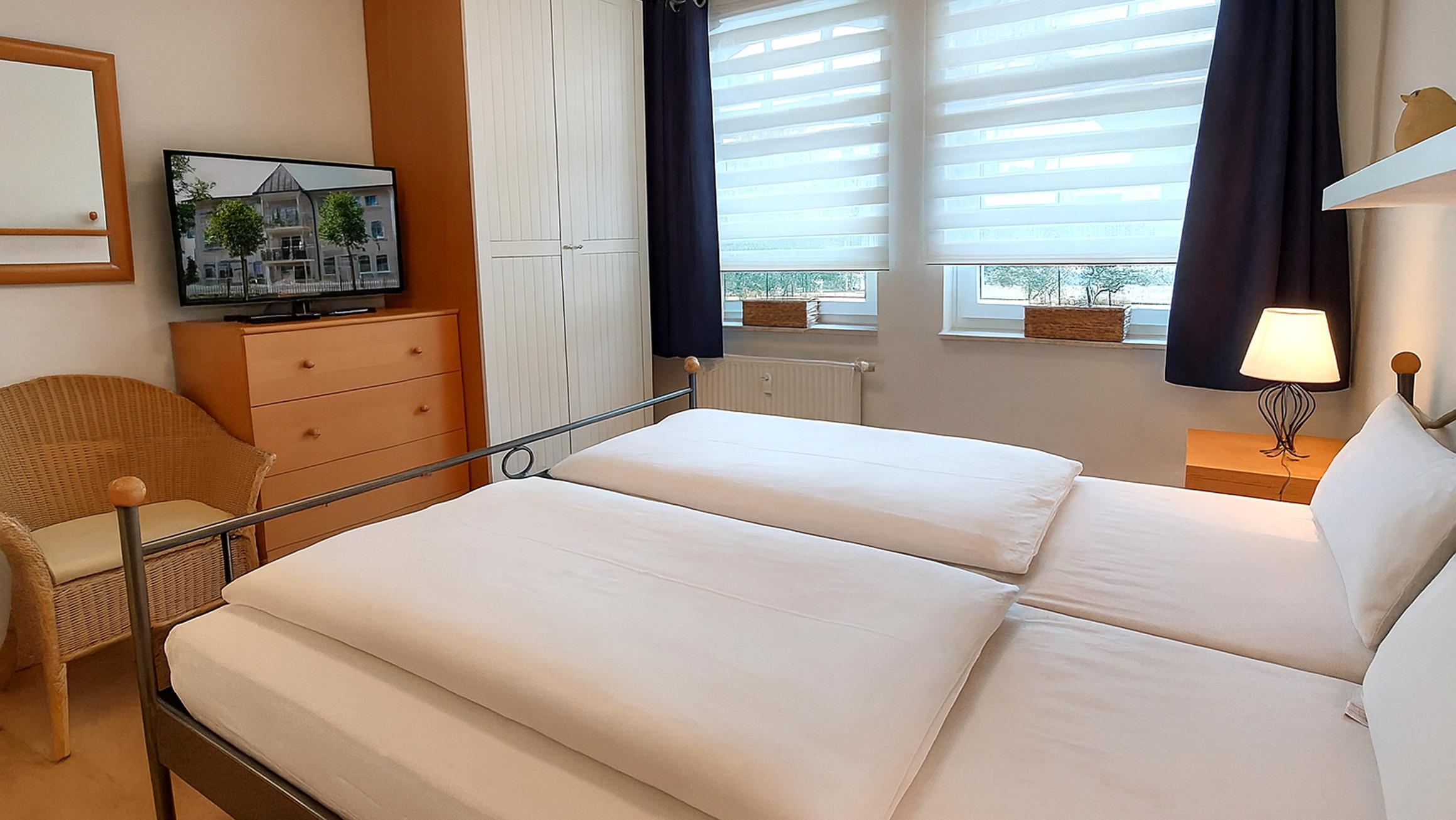 Im kleineren Schlafzimmer befinden sich 1 Kleiderschrank und 2 Einzelbetten.